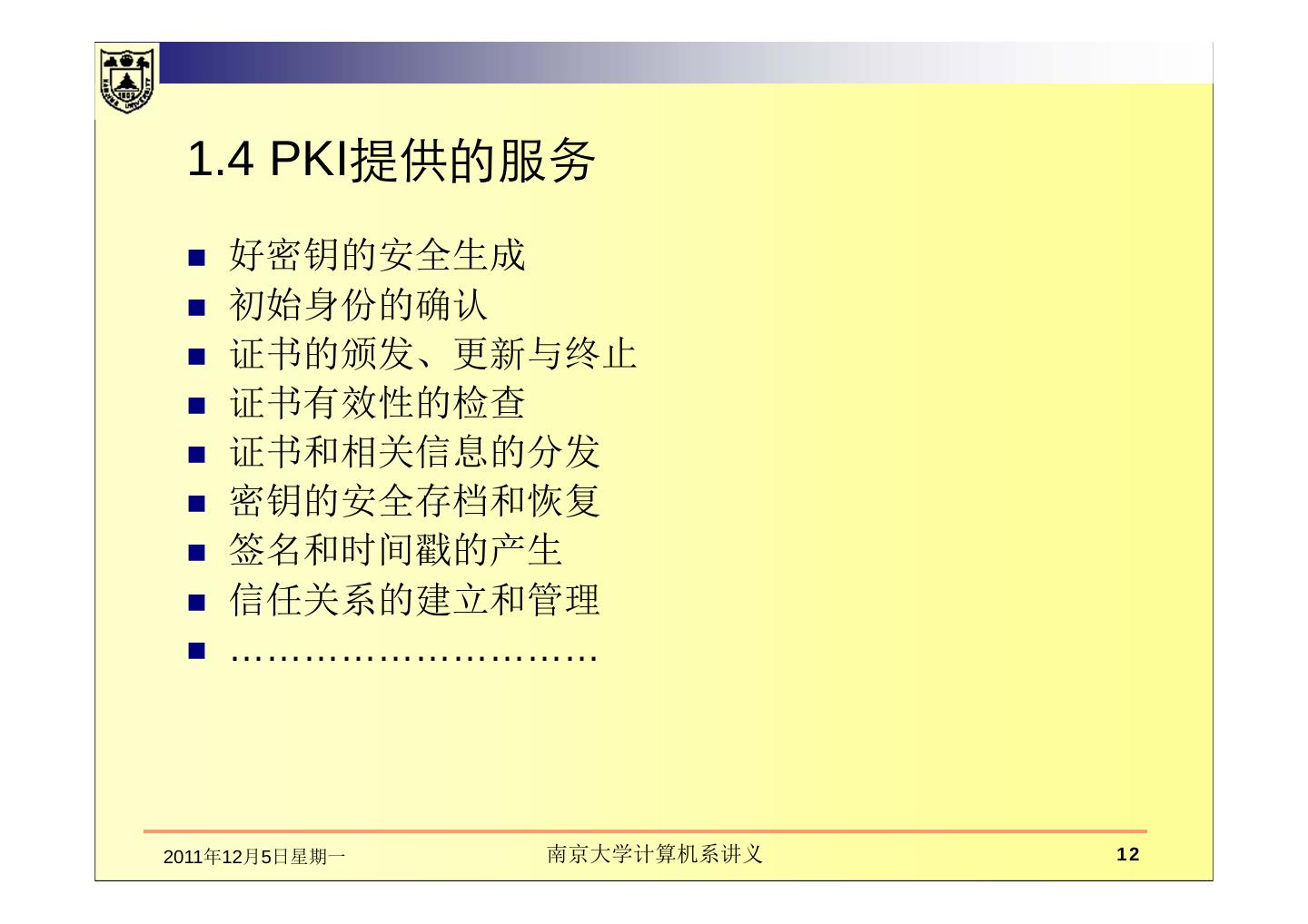12 . 1.4 PKI提供的服务 好密钥的安全生成 初始身份的确认 证书的颁发、更新与终止 证书有效性的检查 证书和相关信息的分发 密钥的安全存档和恢复 签名和时间戳的产生 信任关系的建立和管理 ………………………… 2011年12月5日星期一 南京大学计算机系讲义 12