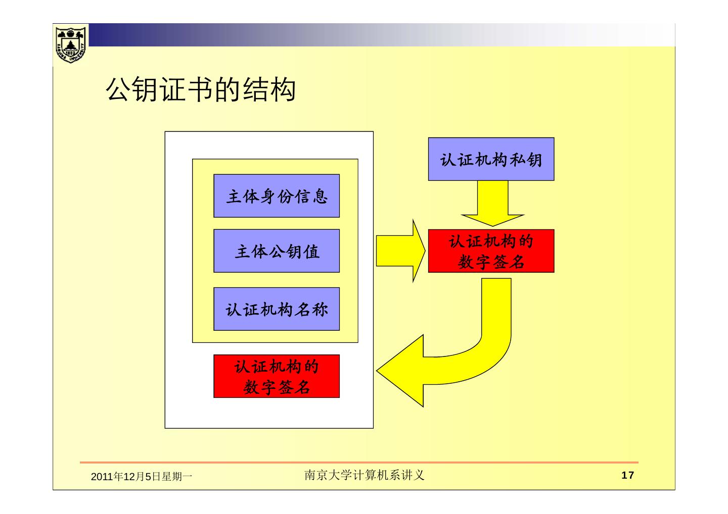 17 . 公钥证书的结构 认证机构私钥 主体身份信息 认证机构的 主体公钥值 数字签名 认证机构名称 认证机构的 数字签名 2011年12月5日星期一 南京大学计算机系讲义 17
