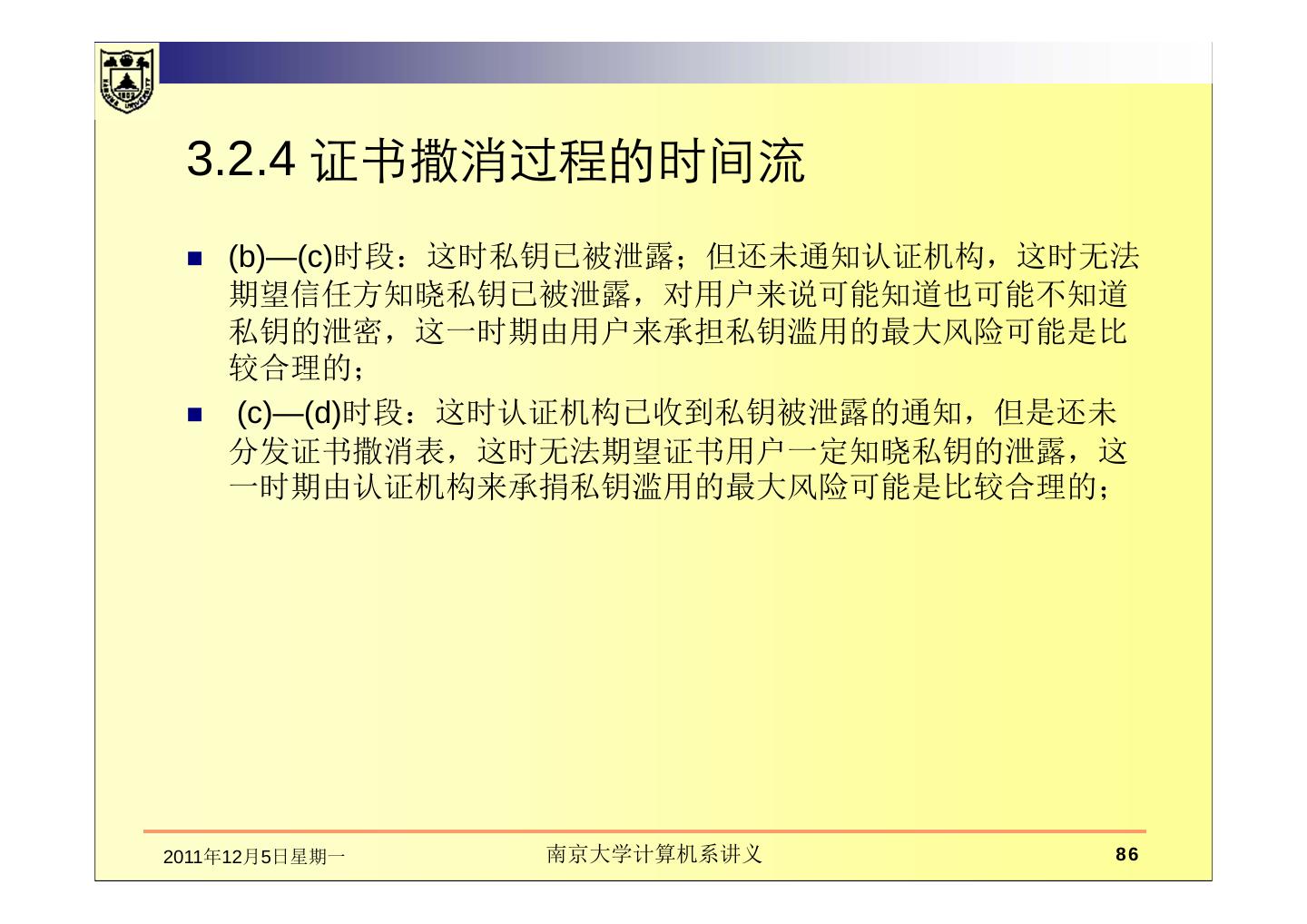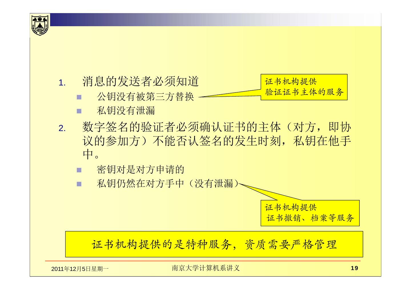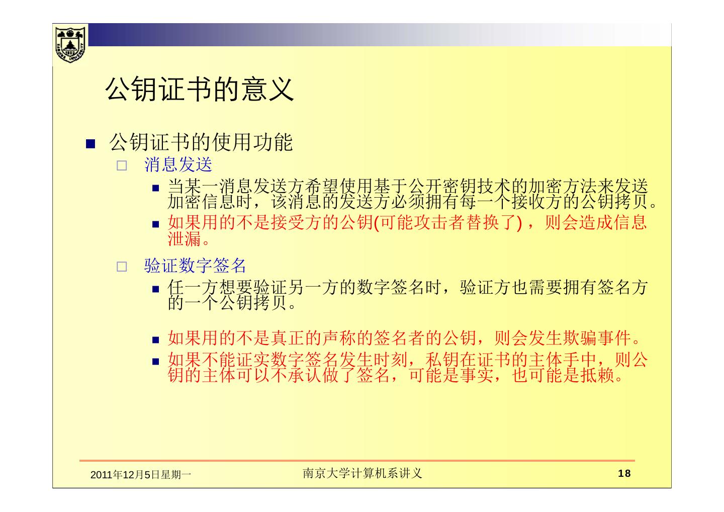 18 . 公钥证书的意义 公钥证书的使用功能 消息发送 当某一消息发送方希望使用基于公开密钥技术的加密方法来发送 加密信息时,该消息的发送方必须拥有每一个接收方的公钥拷贝。 如果用的不是接受方的公钥(可能攻击者替换了) ,则会造成信息 泄漏。 验证数字签名 任一方想要验证另一方的数字签名时,验证方也需要拥有签名方 的一个公钥拷贝。 如果用的不是真正的声称的签名者的公钥,则会发生欺骗事件。 如果不能证实数字签名发生时刻,私钥在证书的主体手中,则公 钥的主体可以不承认做了签名,可能是事实,也可能是抵赖。 2011年12月5日星期一 南京大学计算机系讲义 18