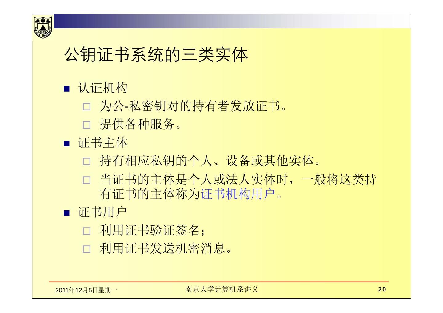20 . 公钥证书系统的三类实体 认证机构 为公-私密钥对的持有者发放证书。 提供各种服务。 证书主体 持有相应私钥的个人、设备或其他实体。 当证书的主体是个人或法人实体时,一般将这类持 有证书的主体称为证书机构用户。 证书用户 利用证书验证签名; 利用证书发送机密消息。 2011年12月5日星期一 南京大学计算机系讲义 20