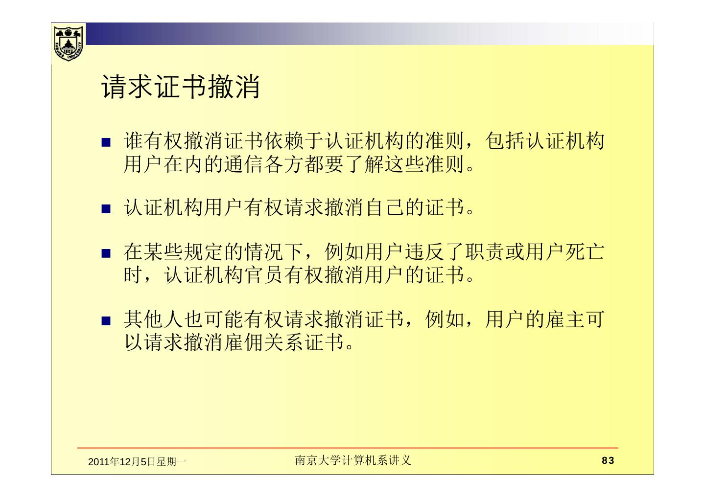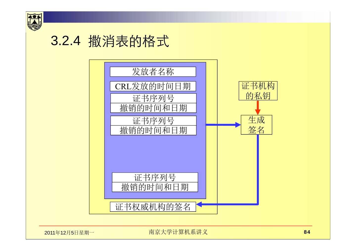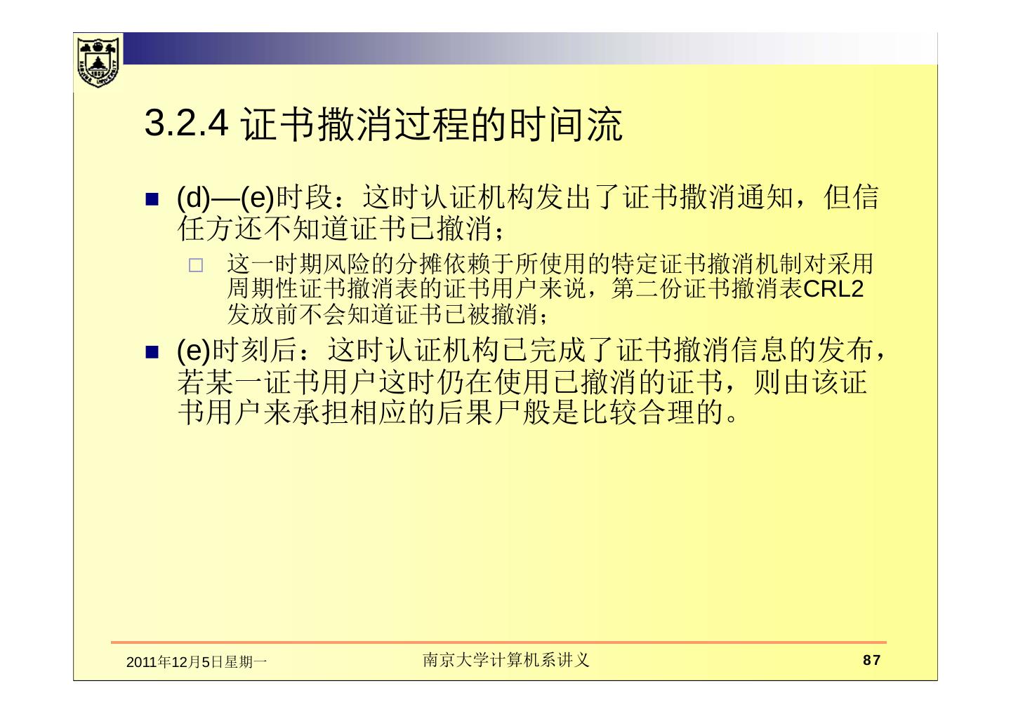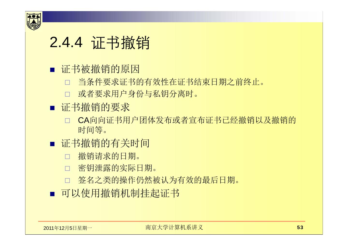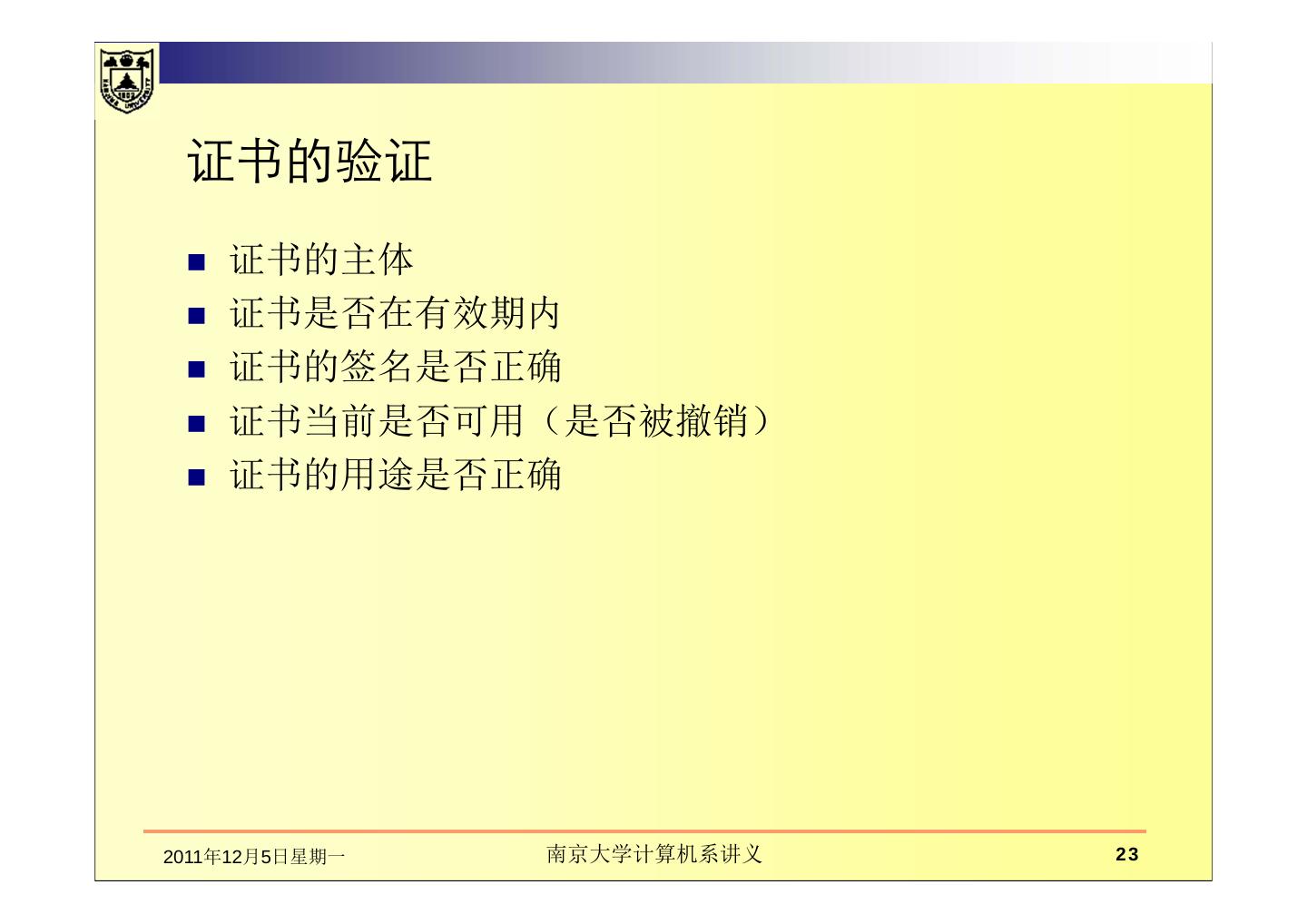 23 . 证书的验证 证书的主体 证书是否在有效期内 证书的签名是否正确 证书当前是否可用(是否被撤销) 证书的用途是否正确 2011年12月5日星期一 南京大学计算机系讲义 23