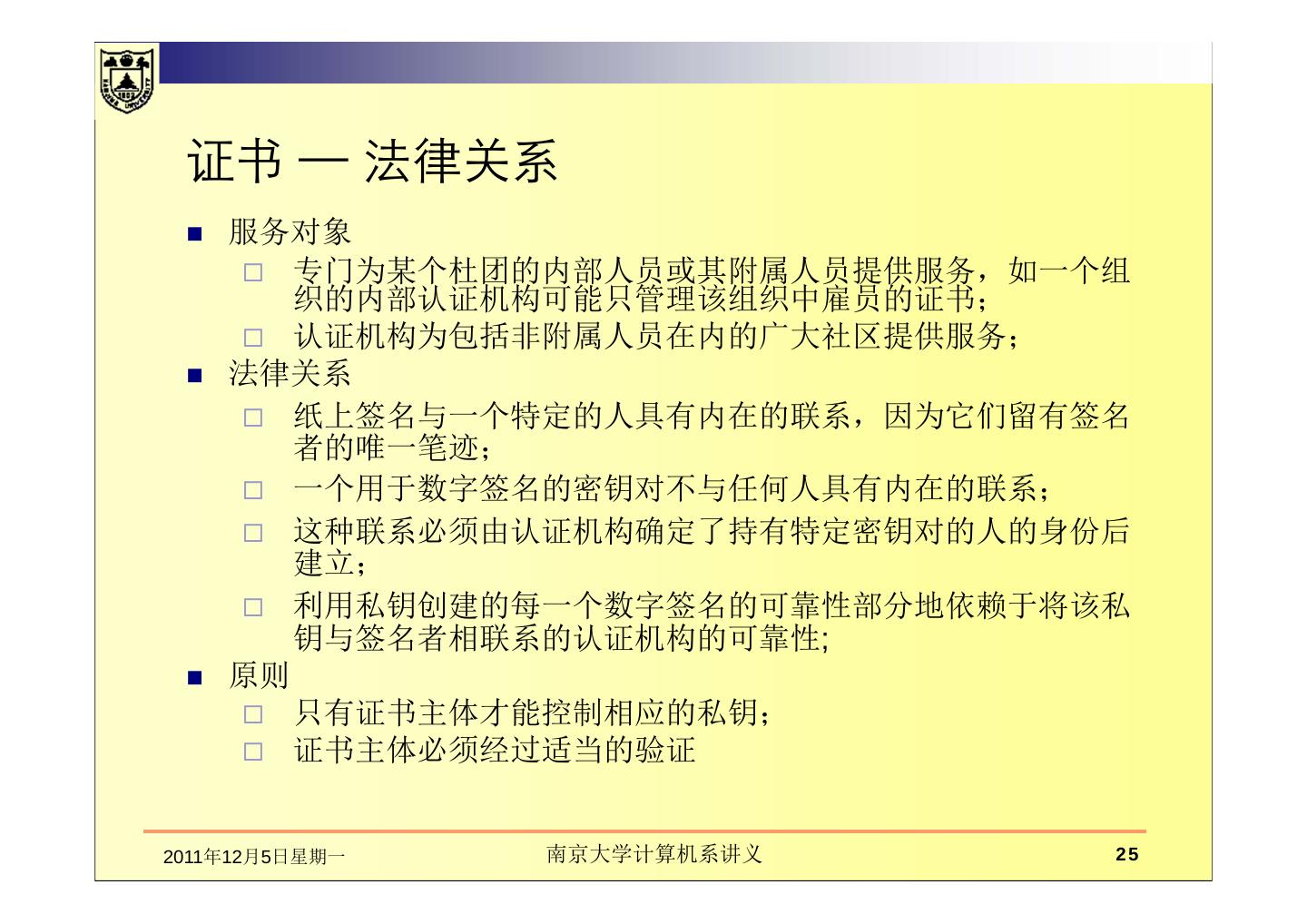 25 . 证书 — 法律关系 服务对象 专门为某个杜团的内部人员或其附属人员提供服务,如一个组 织的内部认证机构可能只管理该组织中雇员的证书; 认证机构为包括非附属人员在内的广大社区提供服务; 法律关系 纸上签名与一个特定的人具有内在的联系,因为它们留有签名 者的唯一笔迹; 一个用于数字签名的密钥对不与任何人具有内在的联系; 这种联系必须由认证机构确定了持有特定密钥对的人的身份后 建立; 利用私钥创建的每一个数字签名的可靠性部分地依赖于将该私 钥与签名者相联系的认证机构的可靠性; 原则 只有证书主体才能控制相应的私钥; 证书主体必须经过适当的验证 2011年12月5日星期一 南京大学计算机系讲义 25