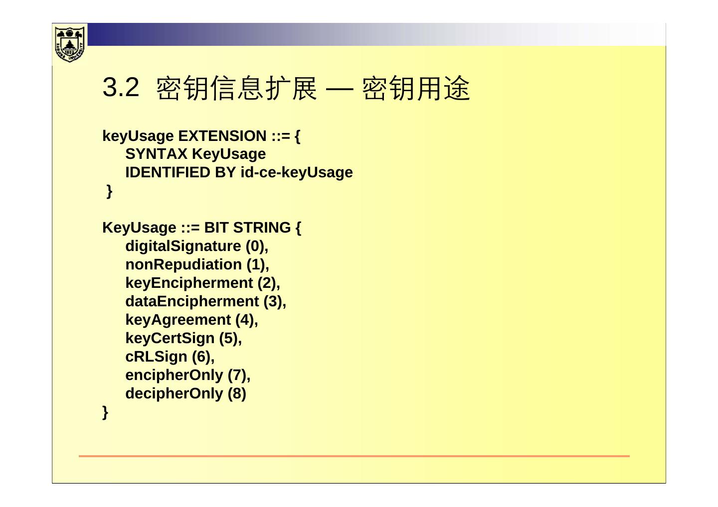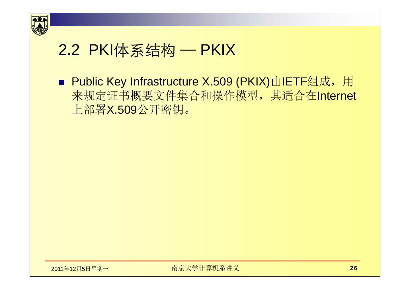 26 . 2.2 PKI体系结构 — PKIX Public Key Infrastructure X.509 (PKIX)由IETF组成,用 来规定证书概要文件集合和操作模型,其适合在Internet 上部署X.509公开密钥。 2011年12月5日星期一 南京大学计算机系讲义 26