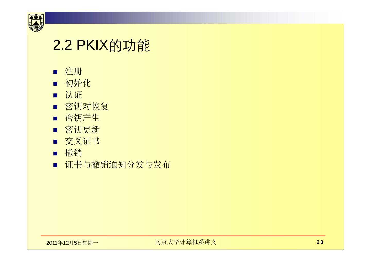 28 . 2.2 PKIX的功能 注册 初始化 认证 密钥对恢复 密钥产生 密钥更新 交叉证书 撤销 证书与撤销通知分发与发布 2011年12月5日星期一 南京大学计算机系讲义 28