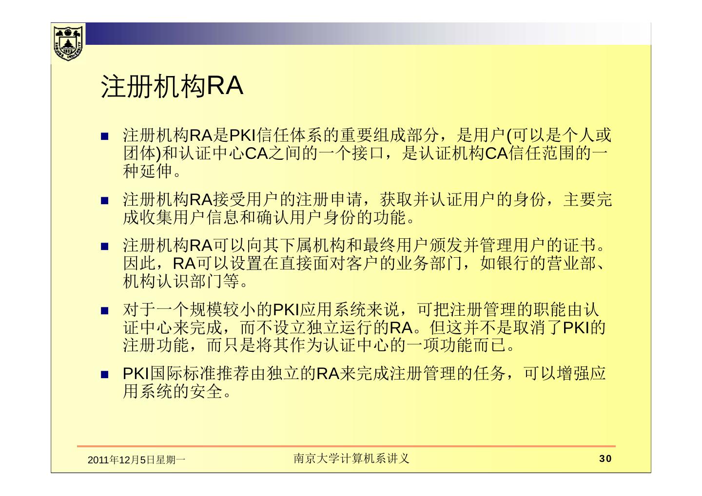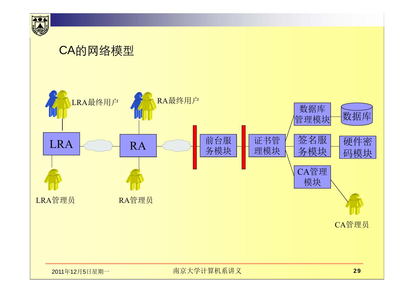 29 . CA的网络模型 LRA最终用户 RA最终用户 数据库 管理模块 数据库 LRA 前台服 证书管 签名服 硬件密 RA 务模块 理模块 务模块 码模块 CA管理 模块 LRA管理员 RA管理员 CA管理员 2011年12月5日星期一 南京大学计算机系讲义 29