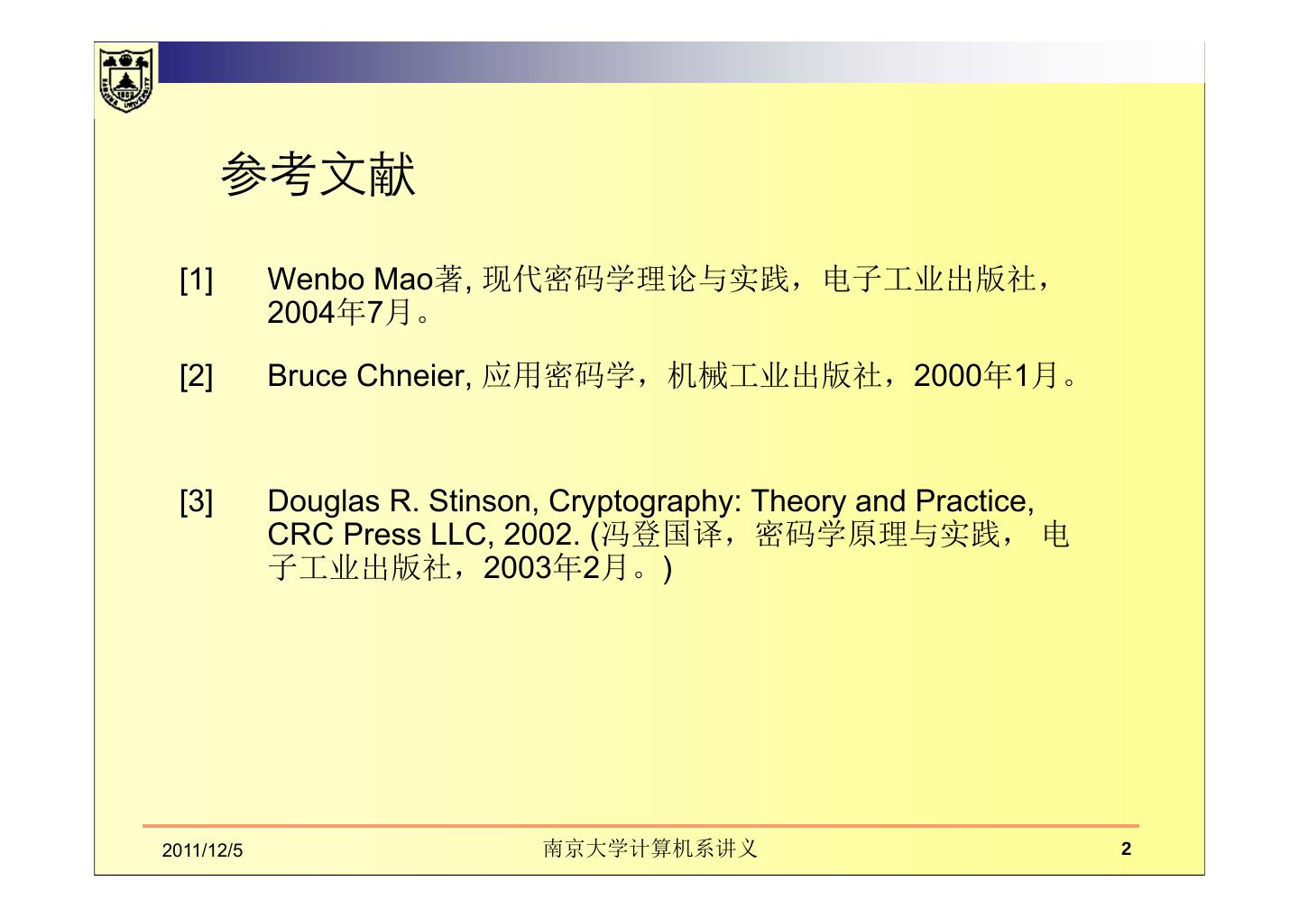 2 . 参考文献 [1] Wenbo Mao著, 现代密码学理论与实践,电子工业出版社, 2004年7月。 [2] Bruce Chneier, 应用密码学,机械工业出版社,2000年1月。 [3] Douglas R. Stinson, Cryptography: Theory and Practice, CRC Press LLC, 2002. (冯登国译,密码学原理与实践, 电 子工业出版社,2003年2月。) 2011/12/5 南京大学计算机系讲义 2