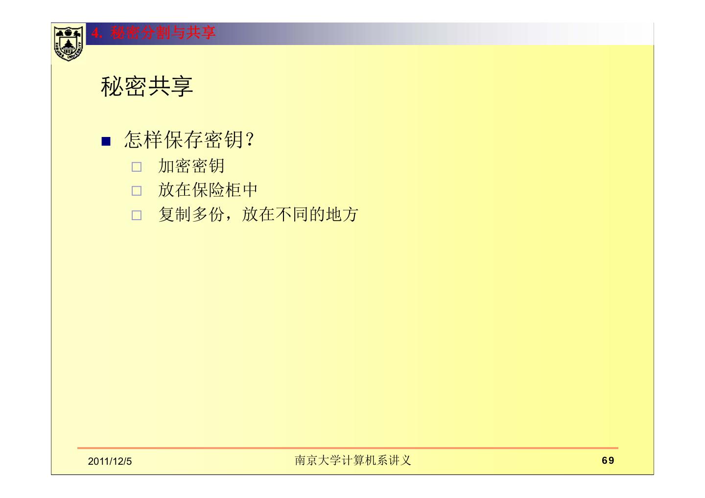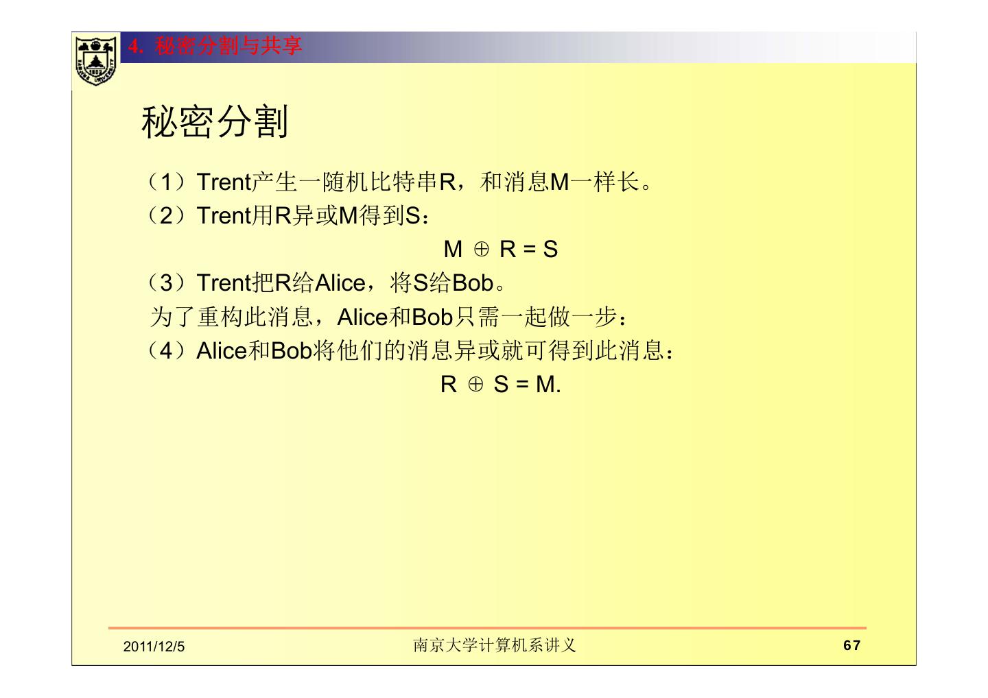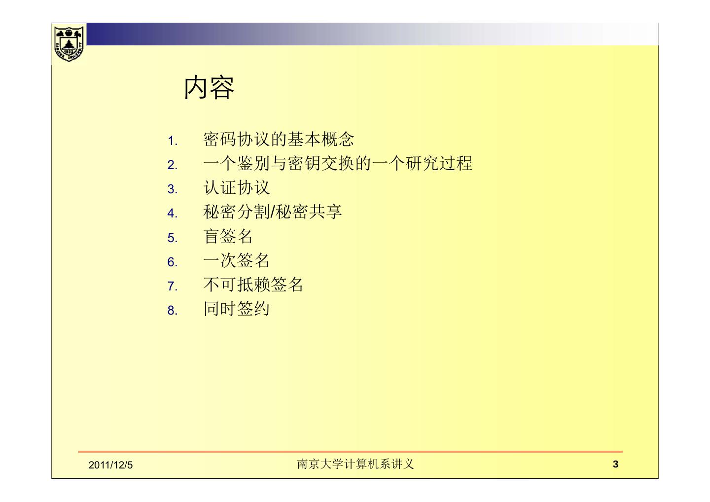 3 . 内容 1. 密码协议的基本概念 2. 一个鉴别与密钥交换的一个研究过程 3. 认证协议 4. 秘密分割/秘密共享 5. 盲签名 6. 一次签名 7. 不可抵赖签名 8. 同时签约 2011/12/5 南京大学计算机系讲义 3
