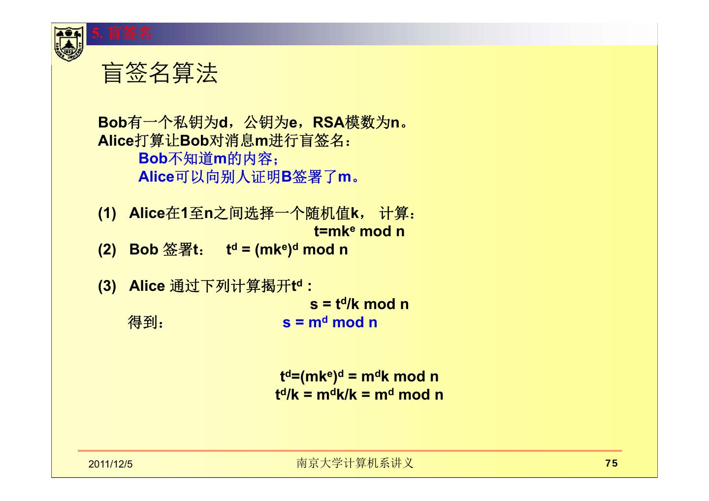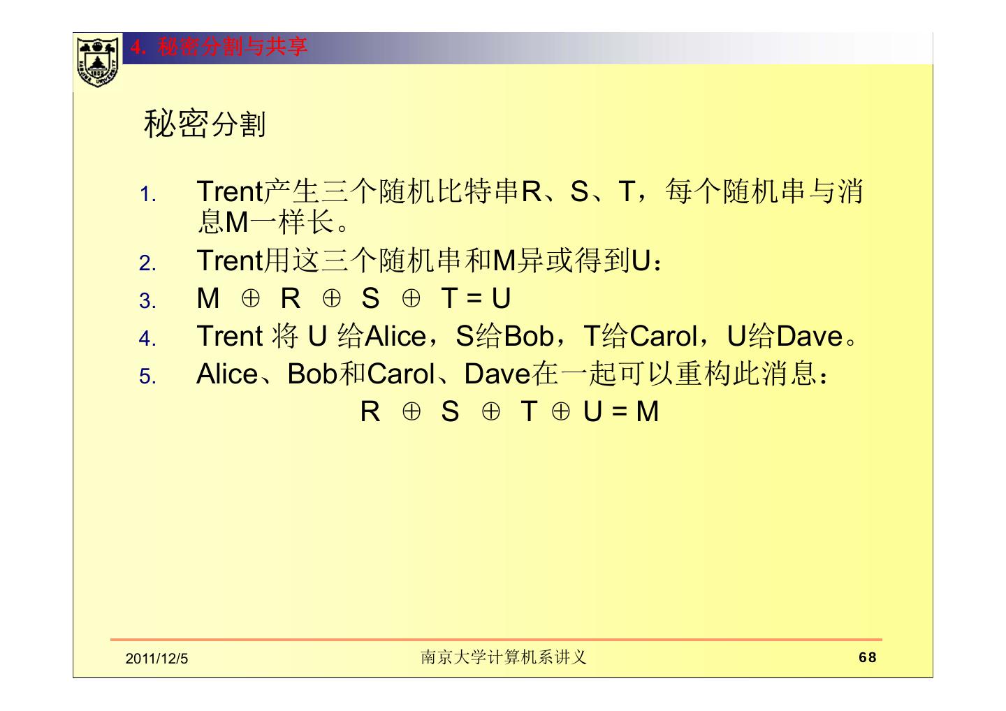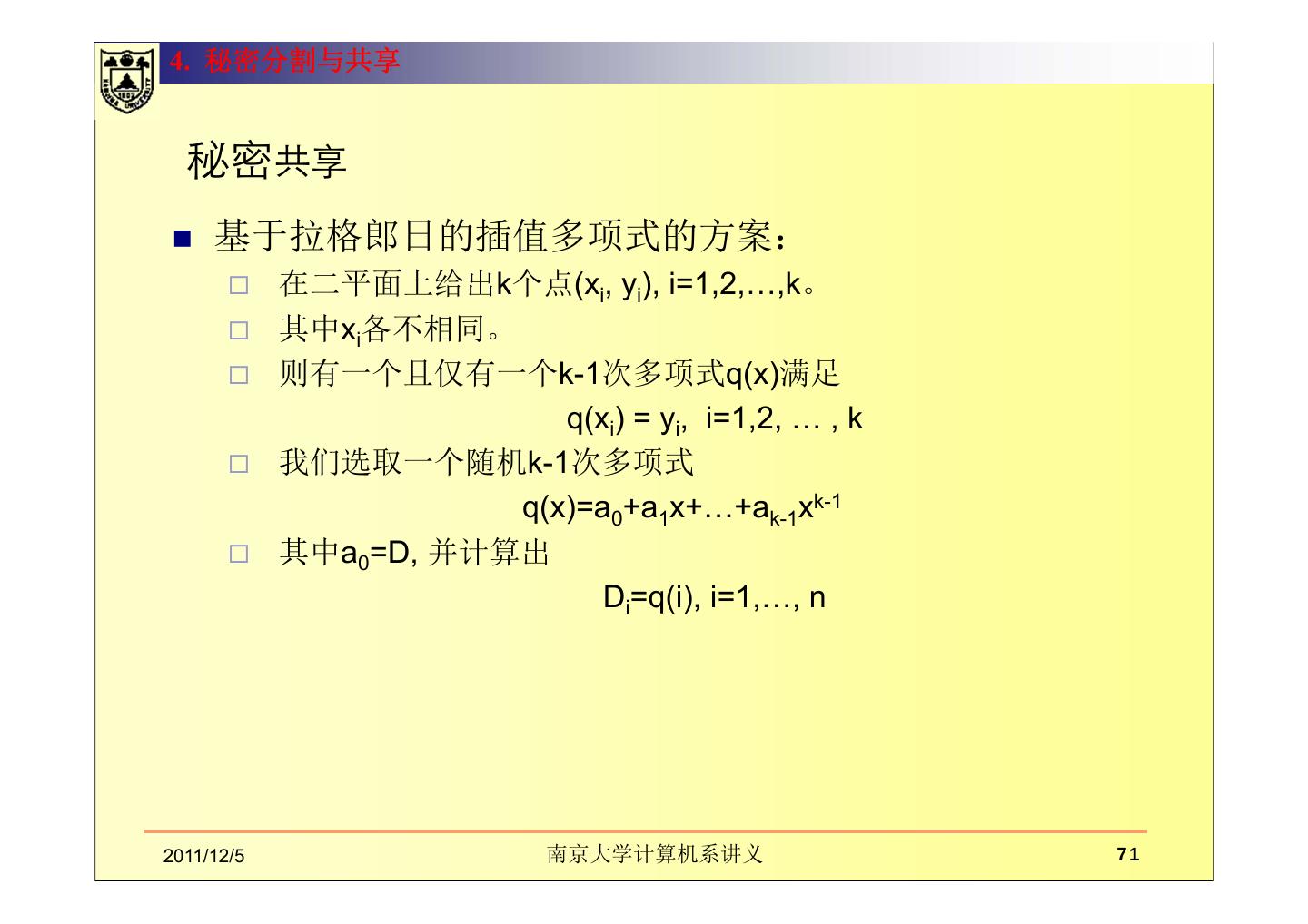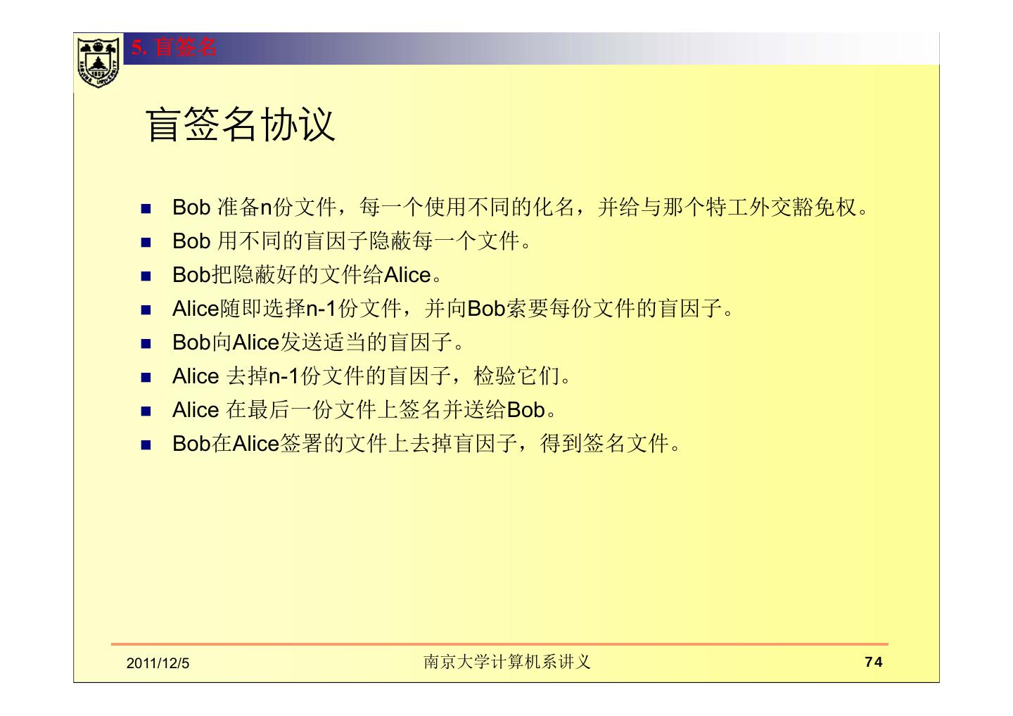 3 . 内容 1. 密码协议的基本概念 2. 一个鉴别与密钥交换的一个研究过程 3. 认证协议 4. 秘密分割/秘密共享 5. 盲签名 6. 一次签名 7. 不可抵赖签名 8. 同时签约 2011/12/5 南京大学计算机系讲义 3