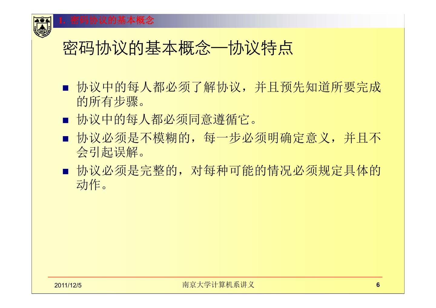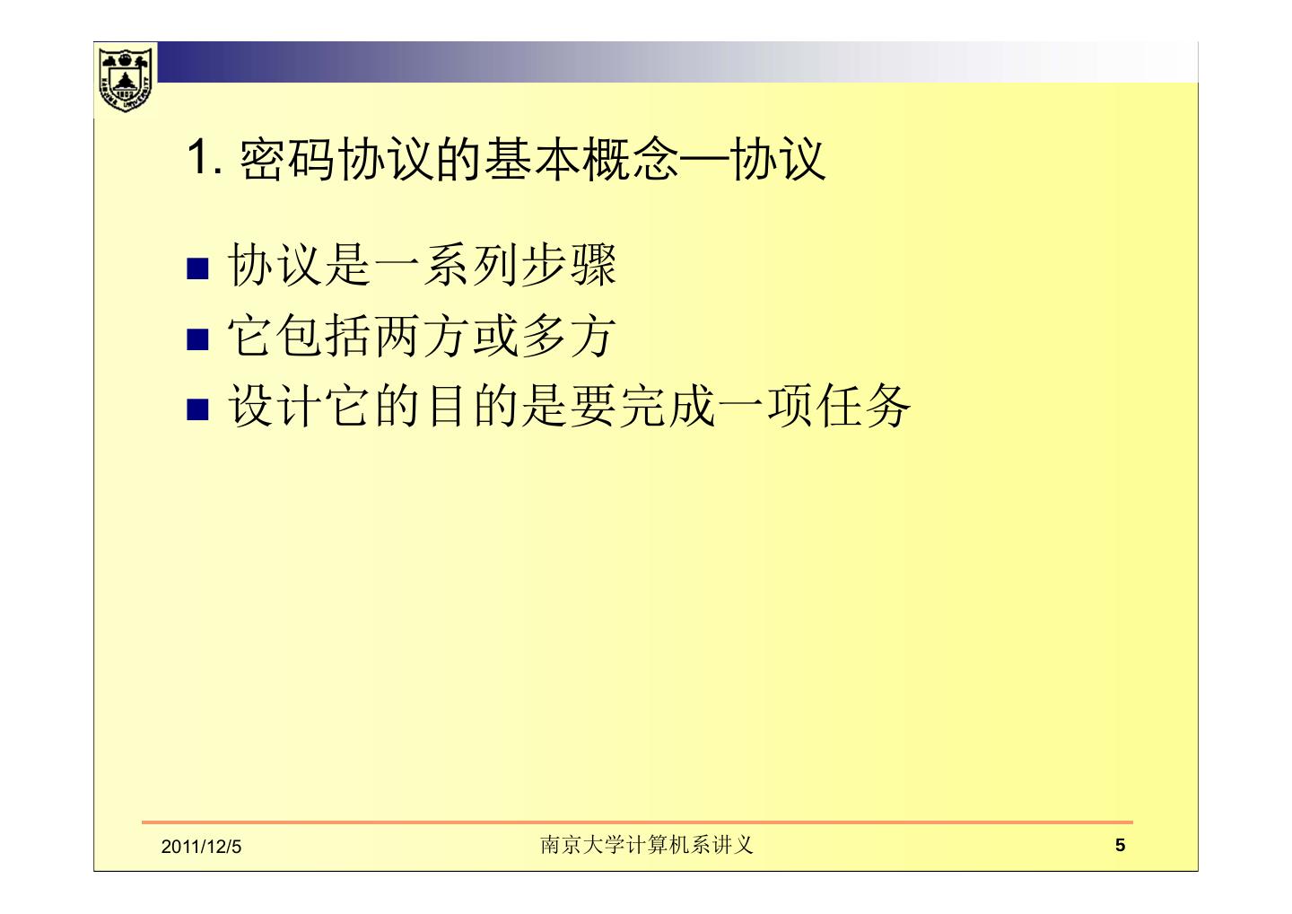 5 . 1. 密码协议的基本概念—协议 协议是一系列步骤 它包括两方或多方 设计它的目的是要完成一项任务 2011/12/5 南京大学计算机系讲义 5