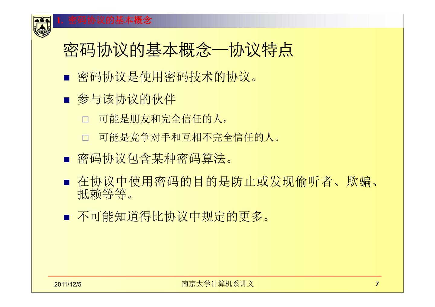 7 .1. 密码协议的基本概念 密码协议的基本概念—协议特点 密码协议是使用密码技术的协议。 参与该协议的伙伴 可能是朋友和完全信任的人, 可能是竞争对手和互相不完全信任的人。 密码协议包含某种密码算法。 在协议中使用密码的目的是防止或发现偷听者、欺骗、 抵赖等等。 不可能知道得比协议中规定的更多。 2011/12/5 南京大学计算机系讲义 7