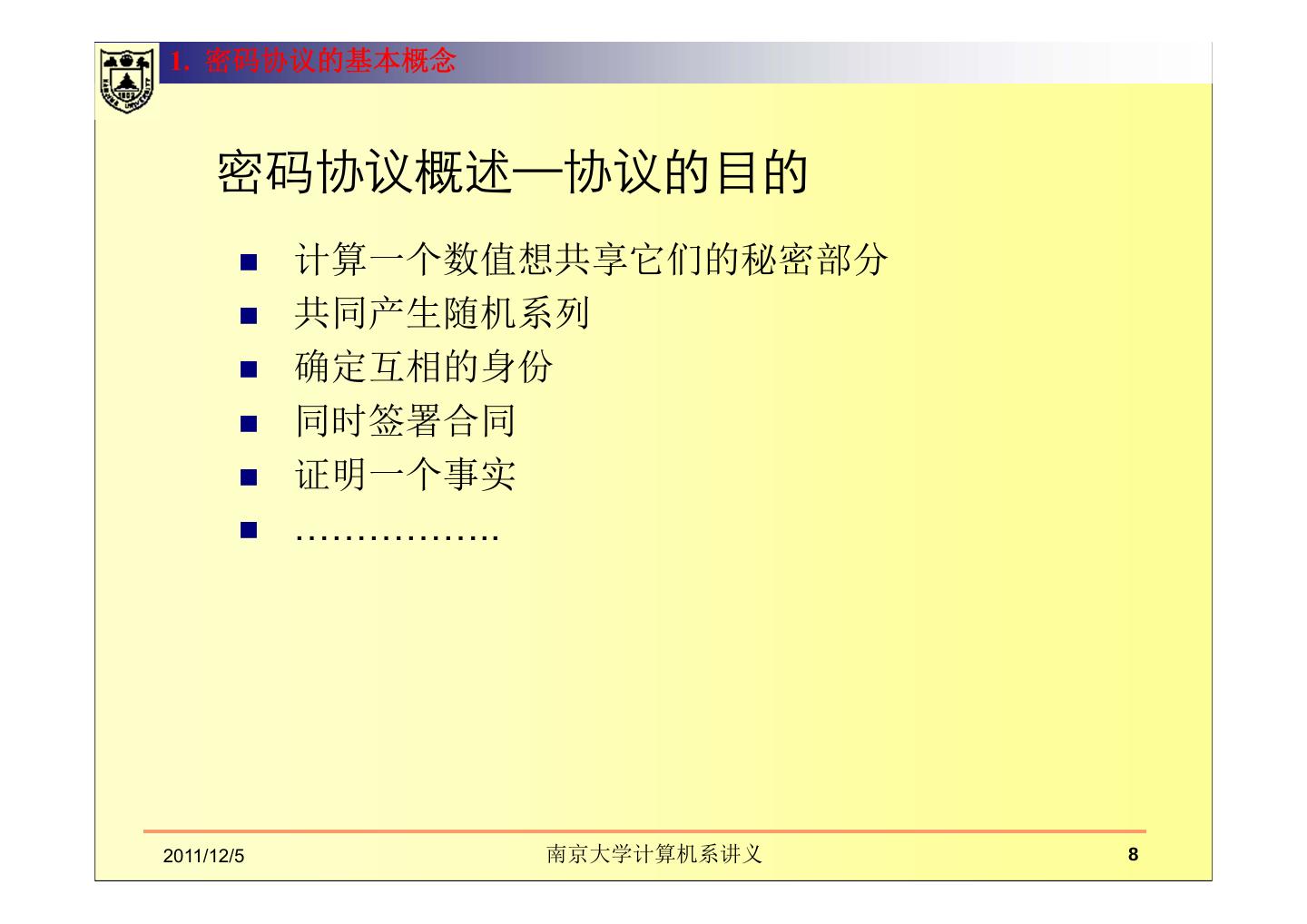 8 .1. 密码协议的基本概念 密码协议概述—协议的目的 计算一个数值想共享它们的秘密部分 共同产生随机系列 确定互相的身份 同时签署合同 证明一个事实 …………….. 2011/12/5 南京大学计算机系讲义 8