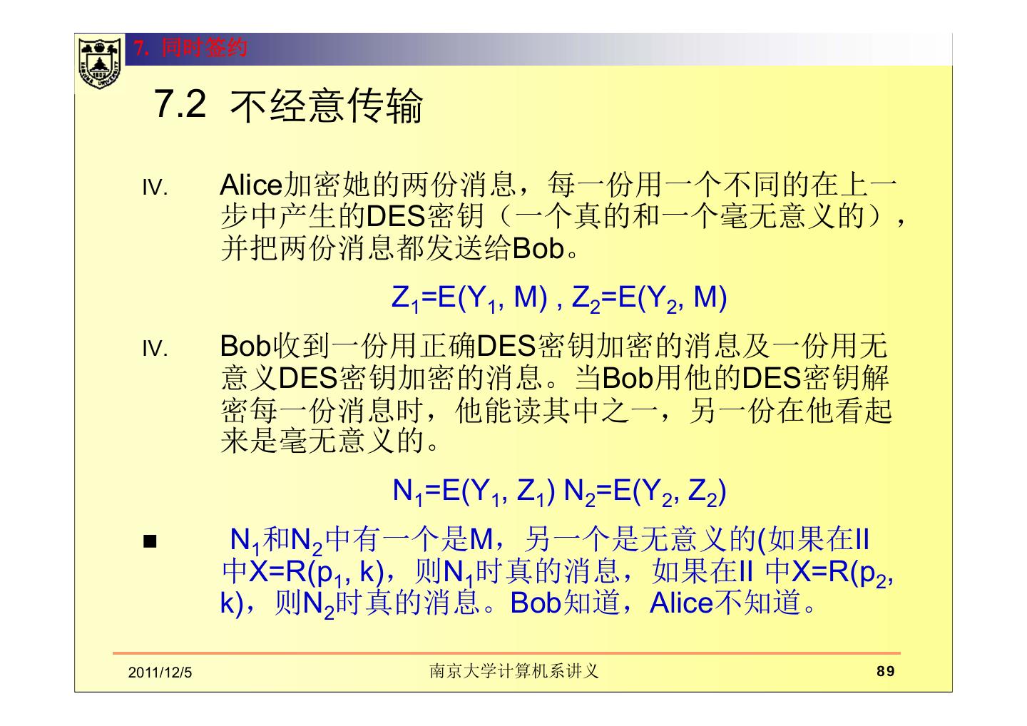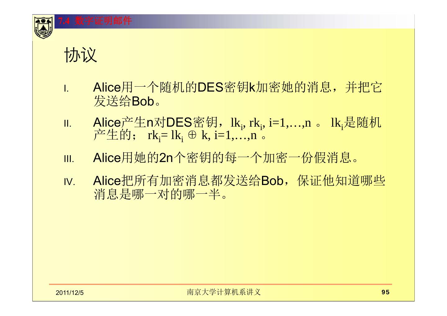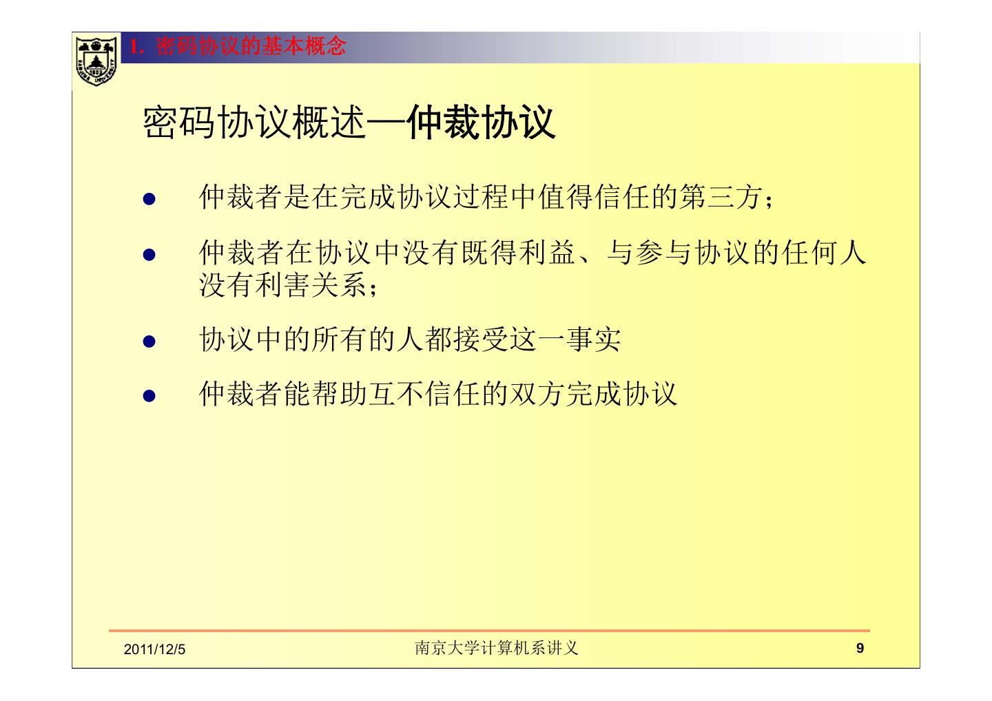 9 .1. 密码协议的基本概念 密码协议概述—仲裁协议 仲裁者是在完成协议过程中值得信任的第三方; 仲裁者在协议中没有既得利益、与参与协议的任何人 没有利害关系; 协议中的所有的人都接受这一事实 仲裁者能帮助互不信任的双方完成协议 2011/12/5 南京大学计算机系讲义 9