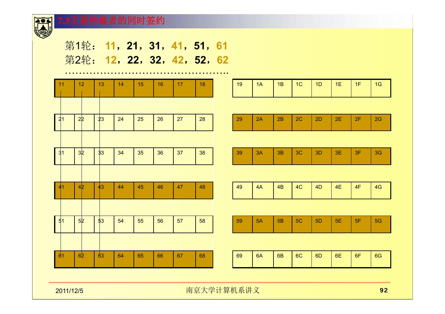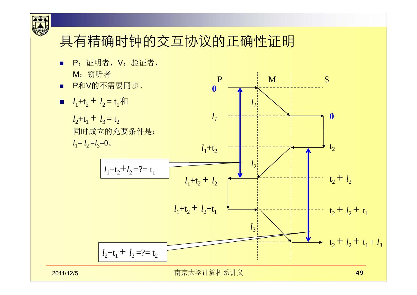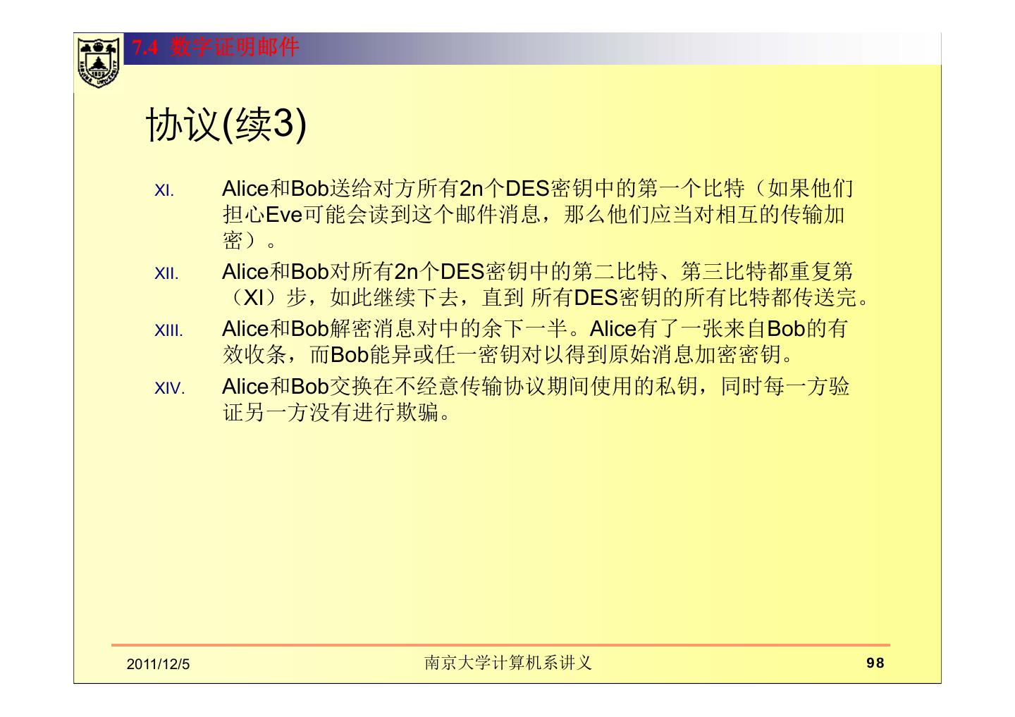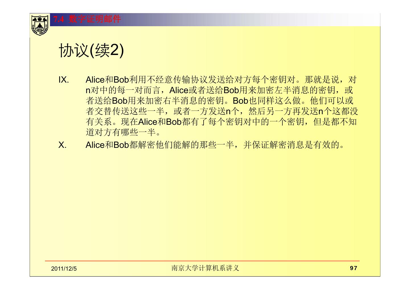 9 .1. 密码协议的基本概念 密码协议概述—仲裁协议 仲裁者是在完成协议过程中值得信任的第三方; 仲裁者在协议中没有既得利益、与参与协议的任何人 没有利害关系; 协议中的所有的人都接受这一事实 仲裁者能帮助互不信任的双方完成协议 2011/12/5 南京大学计算机系讲义 9
