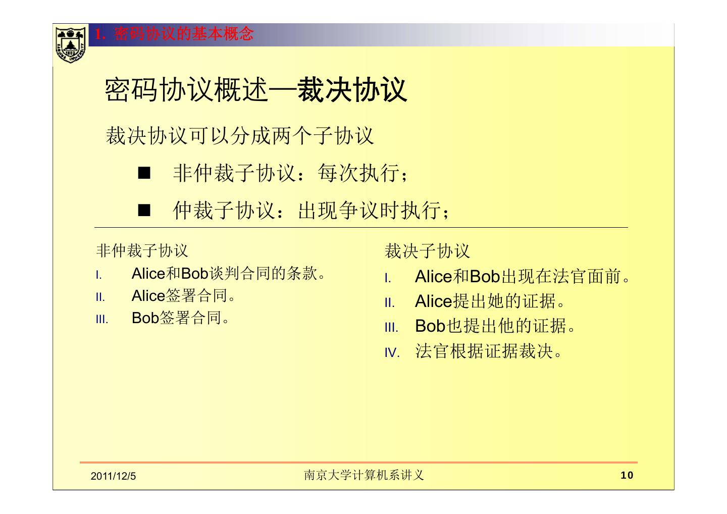 10 .1. 密码协议的基本概念 密码协议概述—裁决协议 裁决协议可以分成两个子协议 非仲裁子协议:每次执行; 仲裁子协议:出现争议时执行; 非仲裁子协议 裁决子协议 I. Alice和Bob谈判合同的条款。 I. Alice和Bob出现在法官面前。 II. Alice签署合同。 II. Alice提出她的证据。 III. Bob签署合同。 III. Bob也提出他的证据。 IV. 法官根据证据裁决。 2011/12/5 南京大学计算机系讲义 10