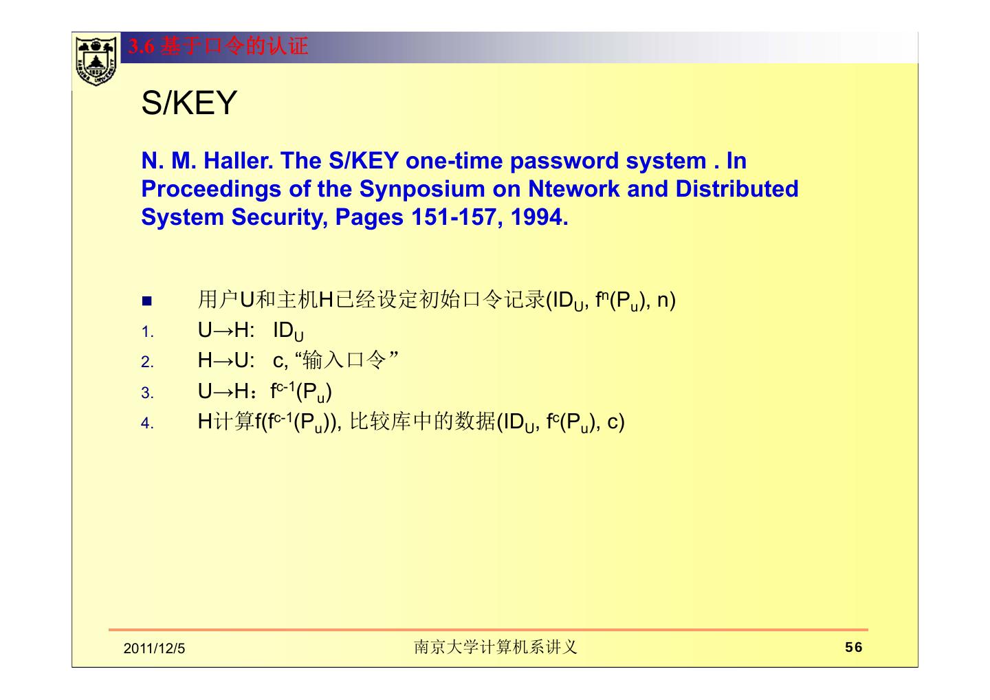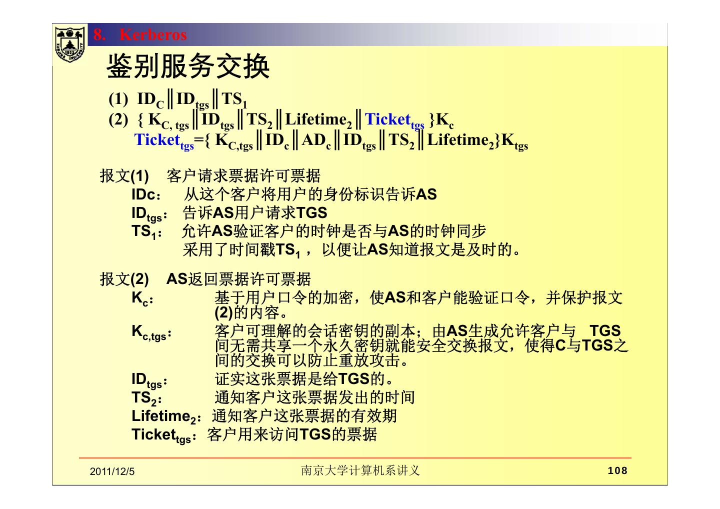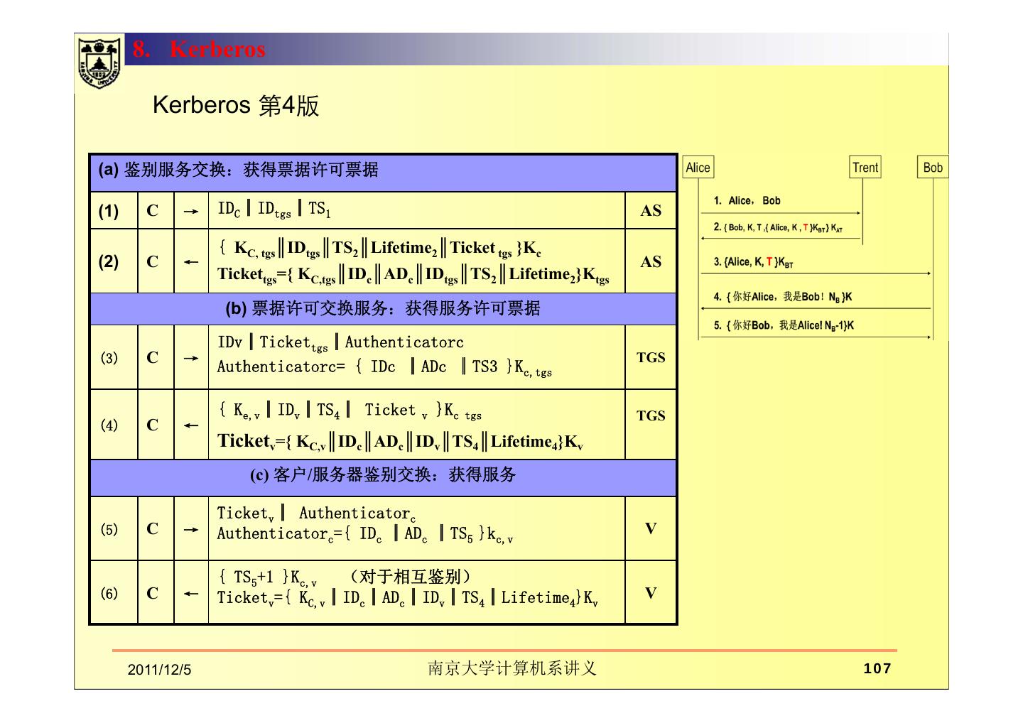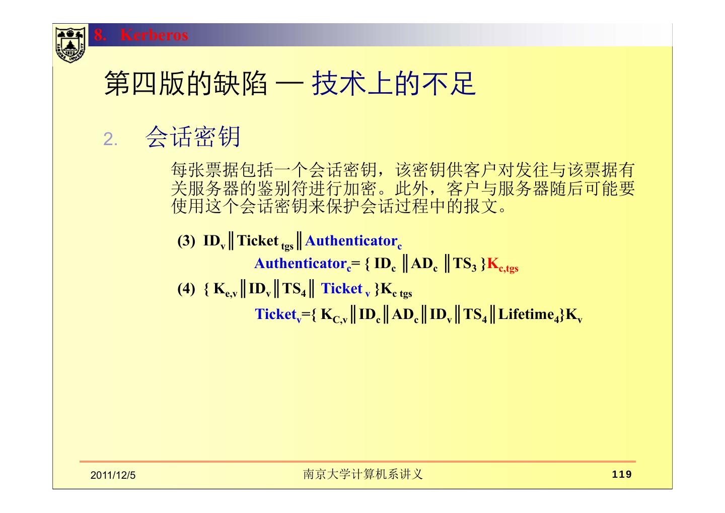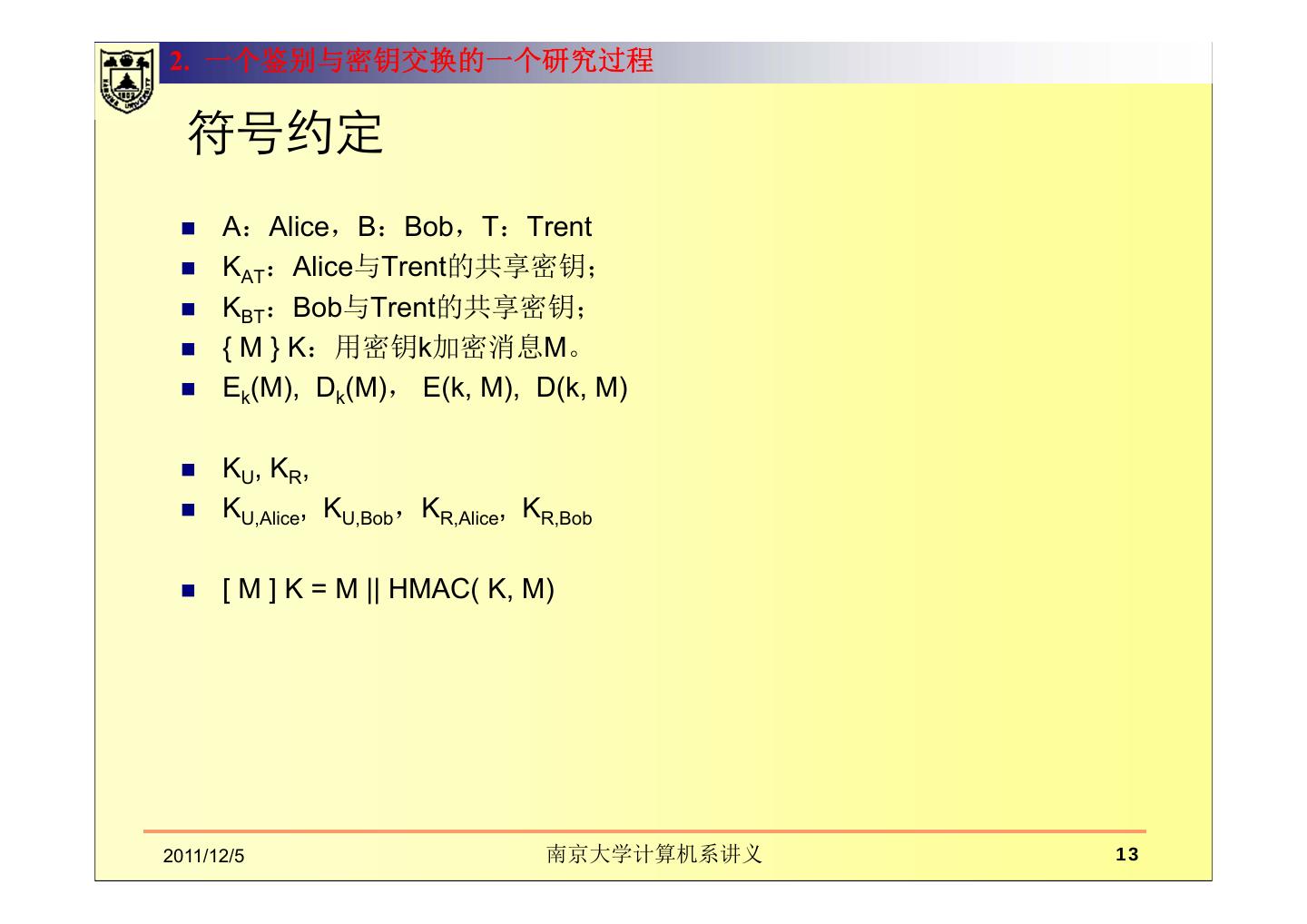 13 .2. 一个鉴别与密钥交换的一个研究过程 符号约定 A:Alice,B:Bob,T:Trent KAT:Alice与Trent的共享密钥; KBT:Bob与Trent的共享密钥; { M } K:用密钥k加密消息M。 Ek(M), Dk(M), E(k, M), D(k, M) KU, KR, KU,Alice, KU,Bob,KR,Alice, KR,Bob [ M ] K = M || HMAC( K, M) 2011/12/5 南京大学计算机系讲义 13