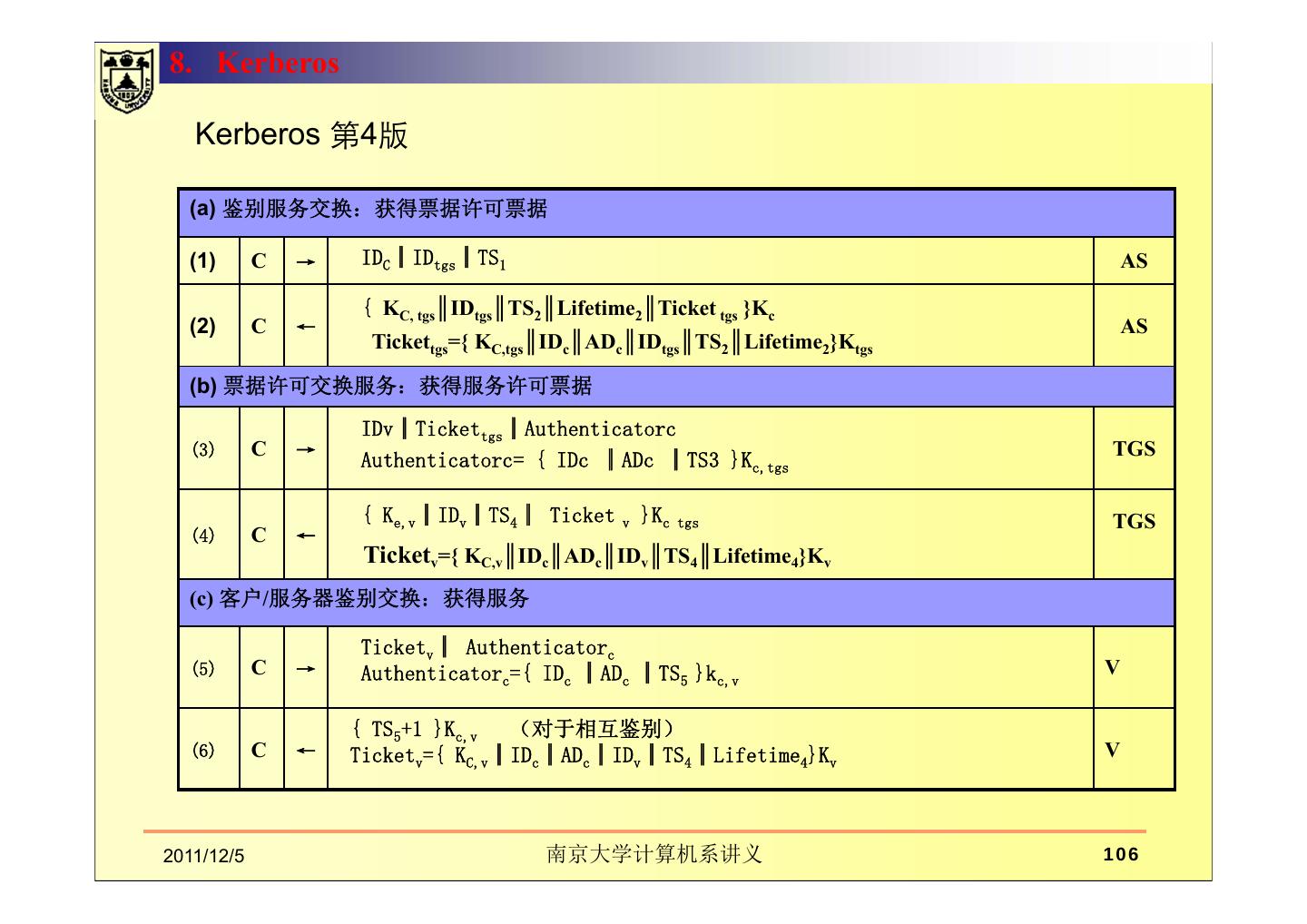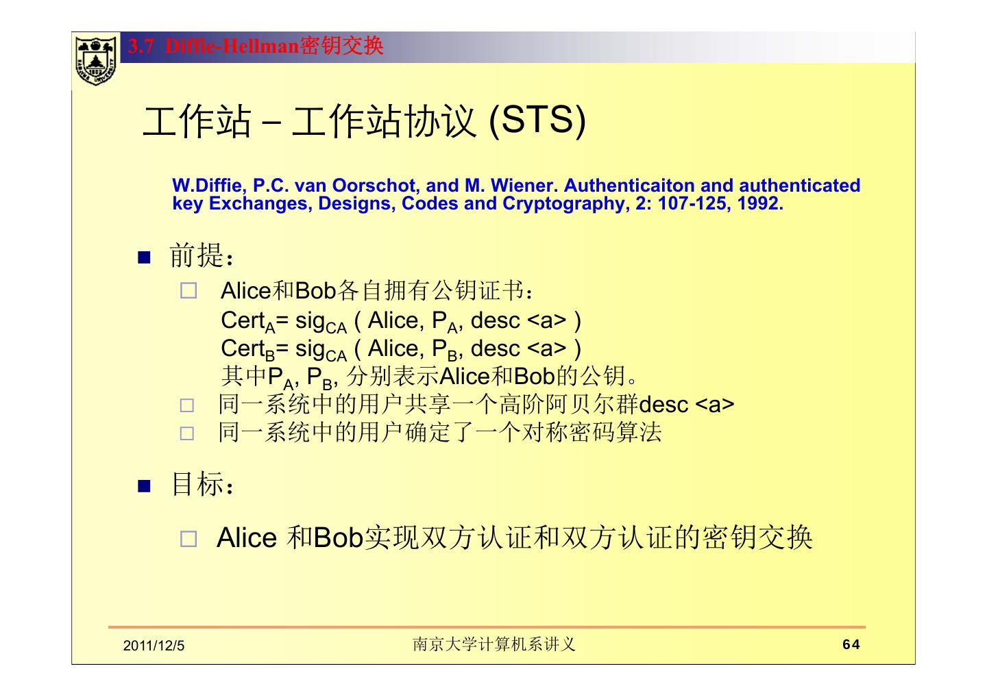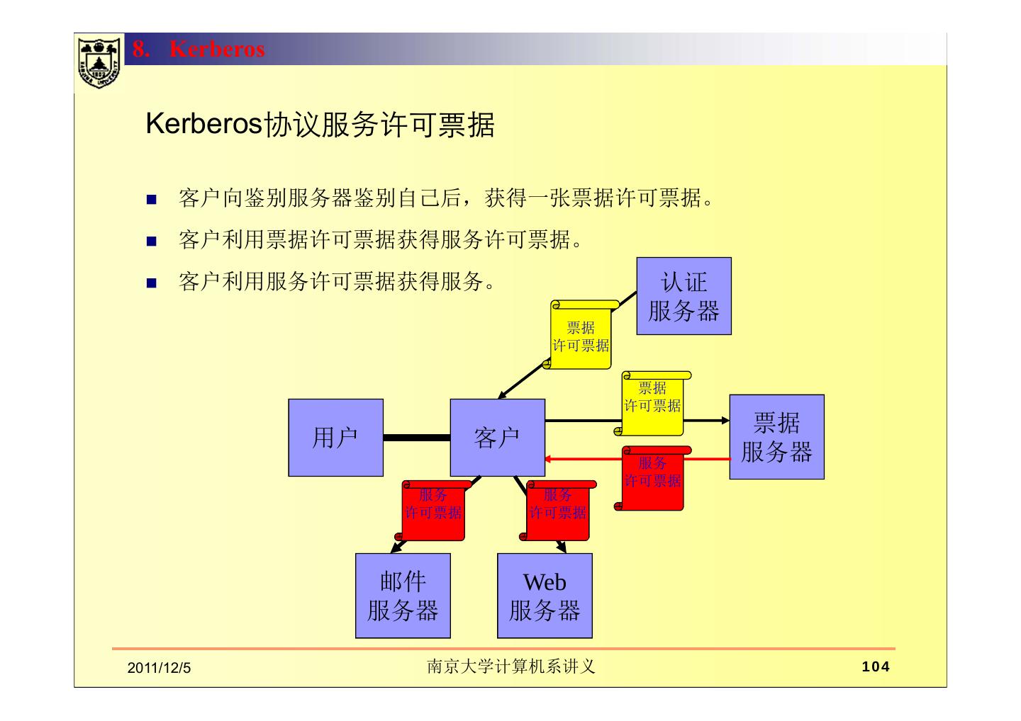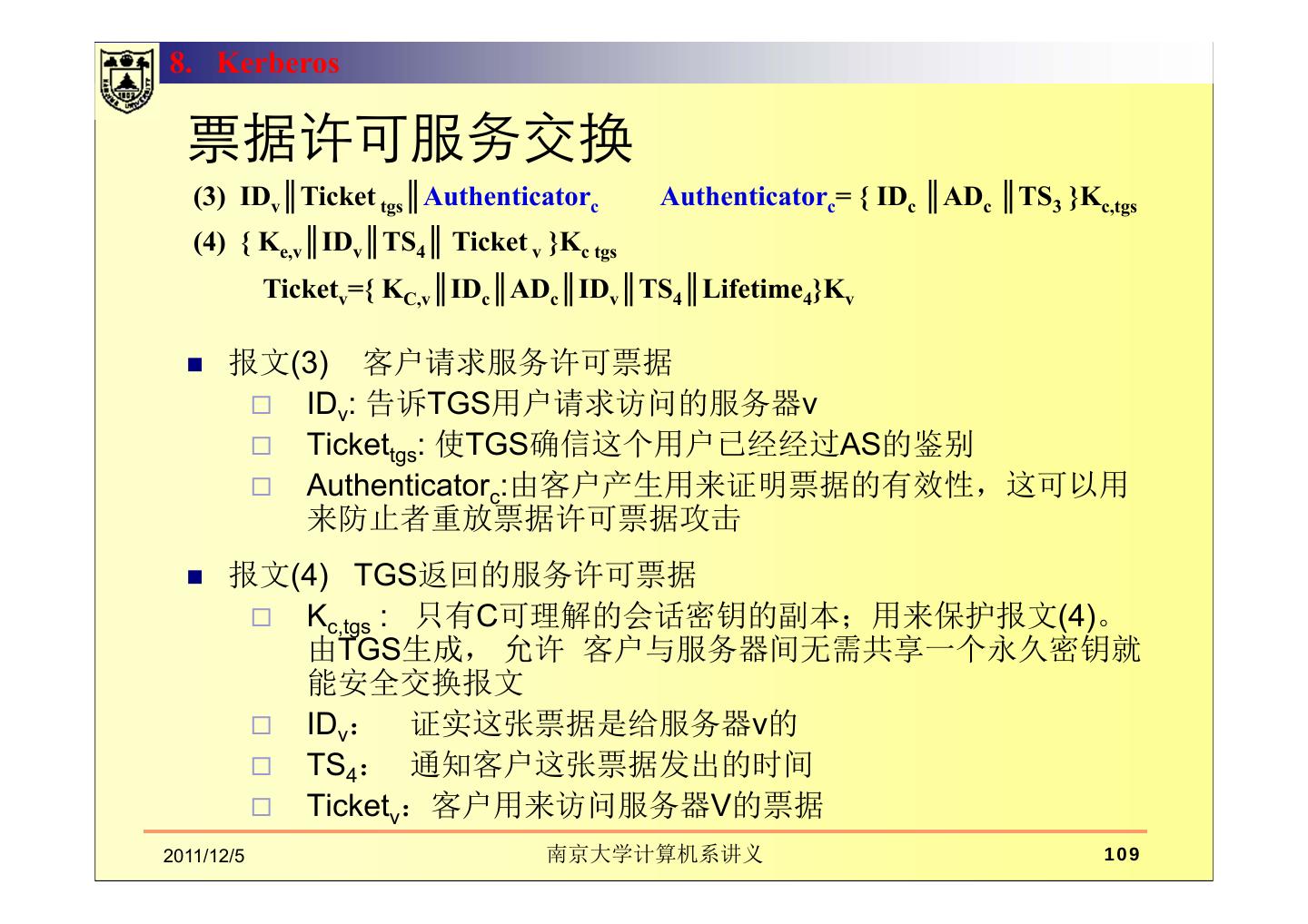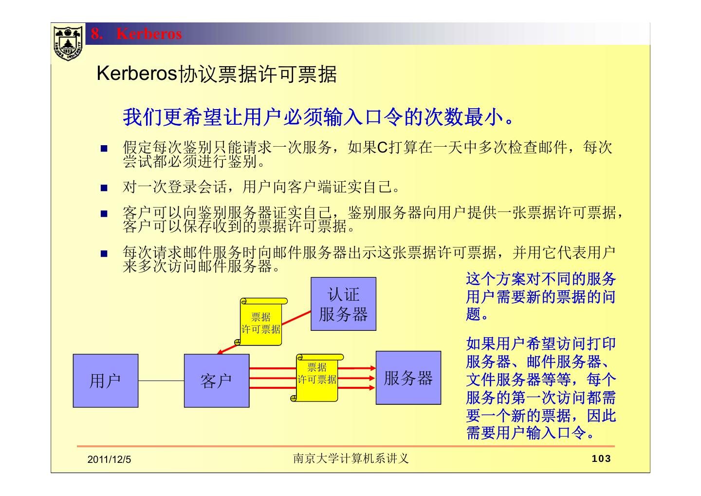13 .2. 一个鉴别与密钥交换的一个研究过程 符号约定 A:Alice,B:Bob,T:Trent KAT:Alice与Trent的共享密钥; KBT:Bob与Trent的共享密钥; { M } K:用密钥k加密消息M。 Ek(M), Dk(M), E(k, M), D(k, M) KU, KR, KU,Alice, KU,Bob,KR,Alice, KR,Bob [ M ] K = M || HMAC( K, M) 2011/12/5 南京大学计算机系讲义 13