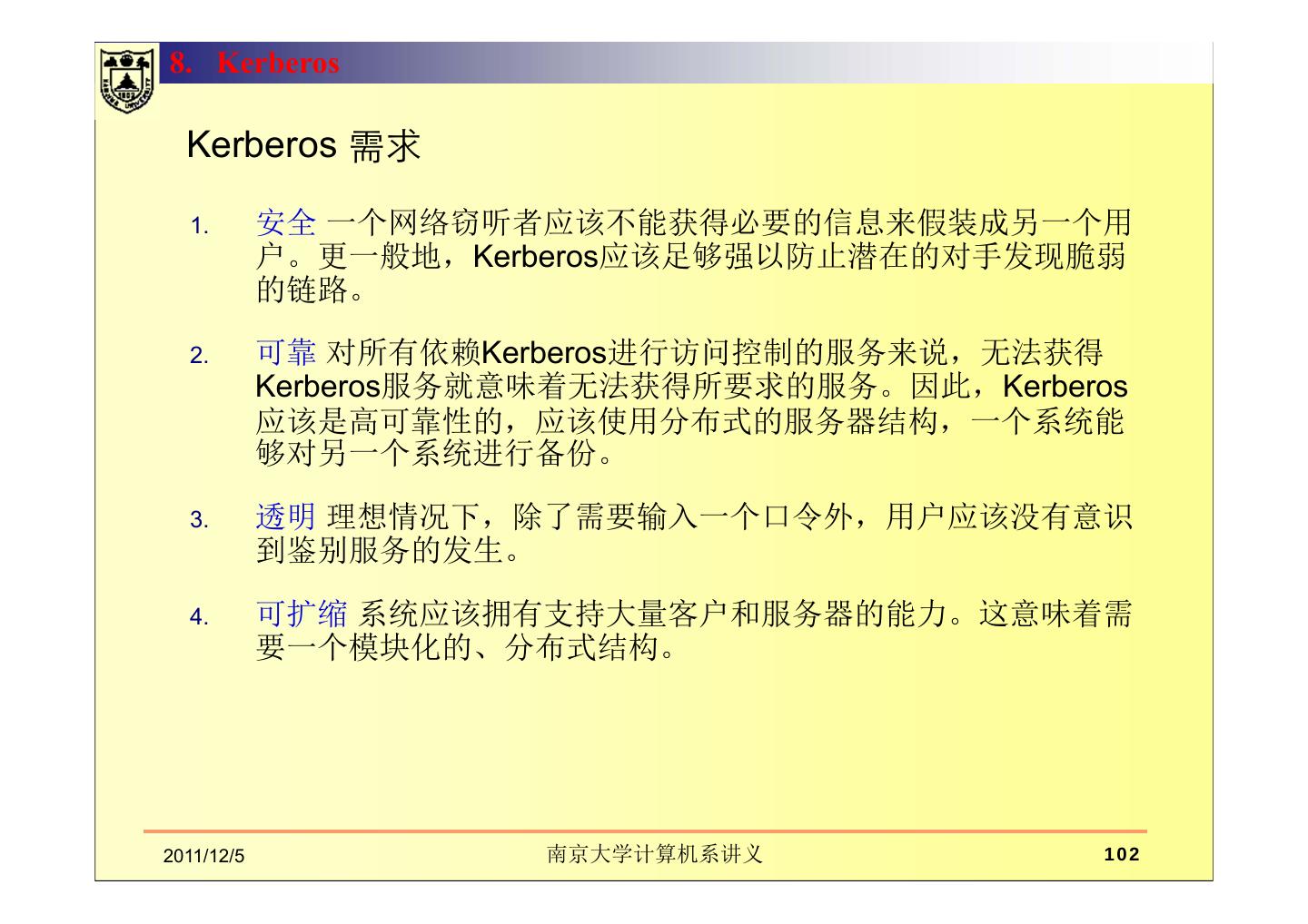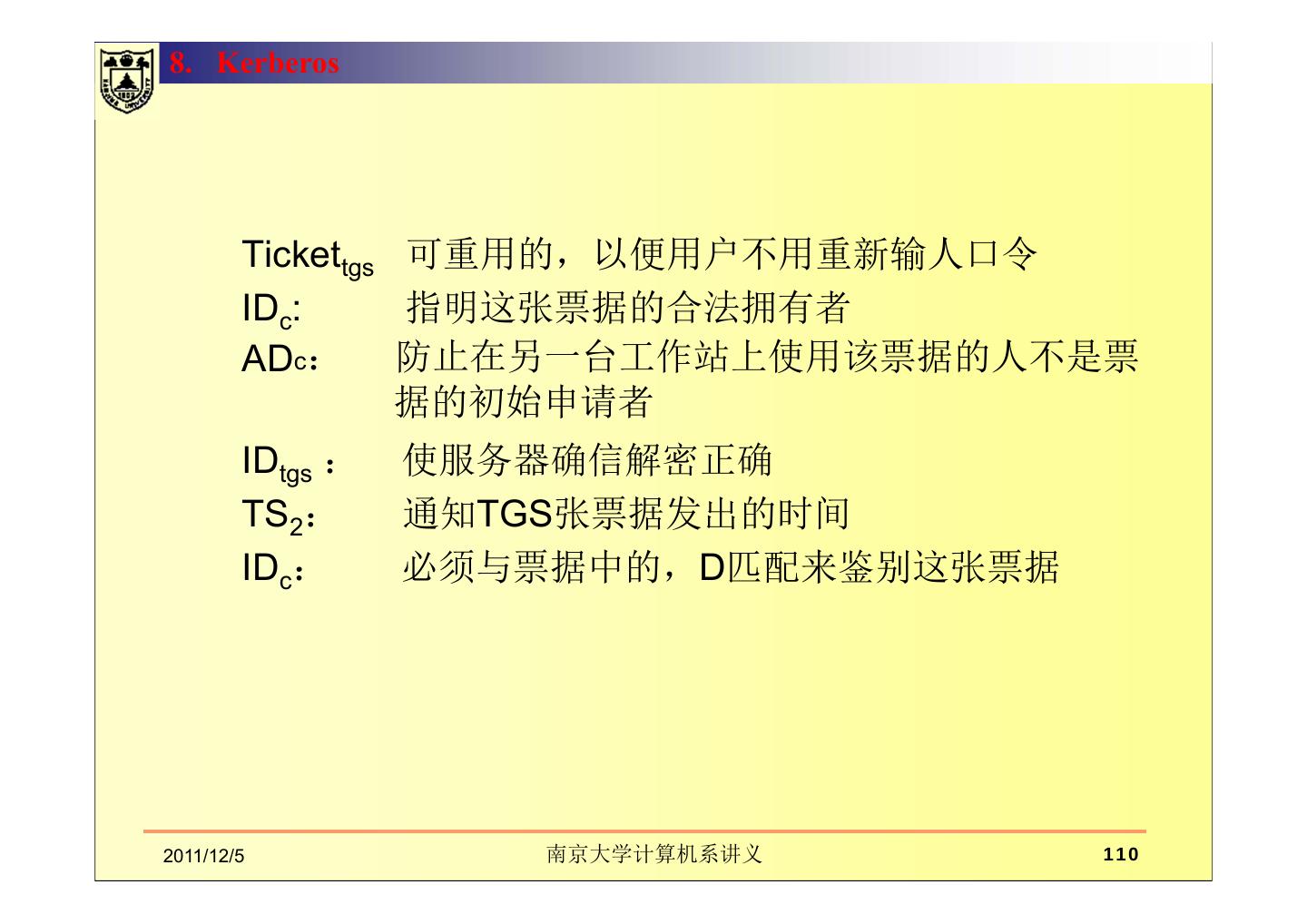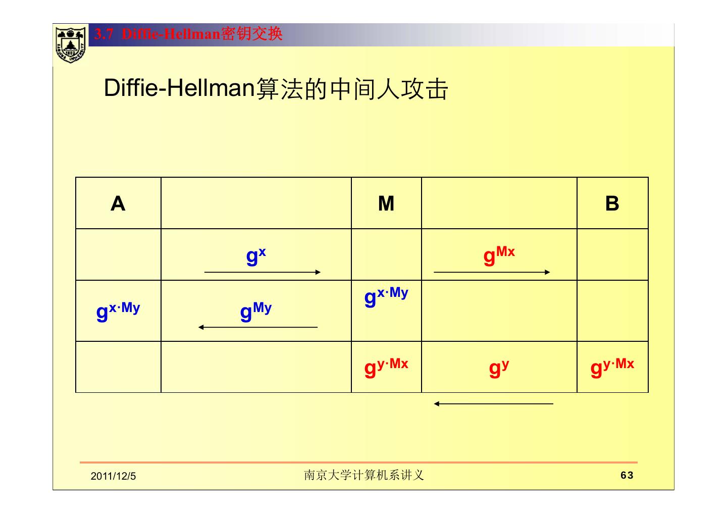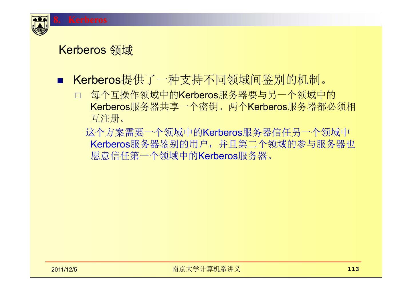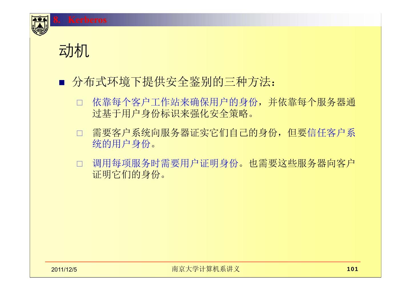 13 .2. 一个鉴别与密钥交换的一个研究过程 符号约定 A:Alice,B:Bob,T:Trent KAT:Alice与Trent的共享密钥; KBT:Bob与Trent的共享密钥; { M } K:用密钥k加密消息M。 Ek(M), Dk(M), E(k, M), D(k, M) KU, KR, KU,Alice, KU,Bob,KR,Alice, KR,Bob [ M ] K = M || HMAC( K, M) 2011/12/5 南京大学计算机系讲义 13