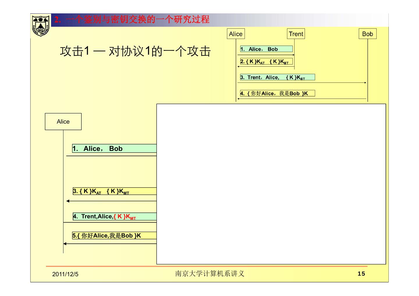 14 .2. 一个鉴别与密钥交换的一个研究过程 协议1 Alice Trent Bob 1. Alice, Bob 2. { K }KAT { K }KBT 3. Trent,Alice, { K }KBT 4. { 你好Alice,我是Bob }K 2011/12/5 南京大学计算机系讲义 14