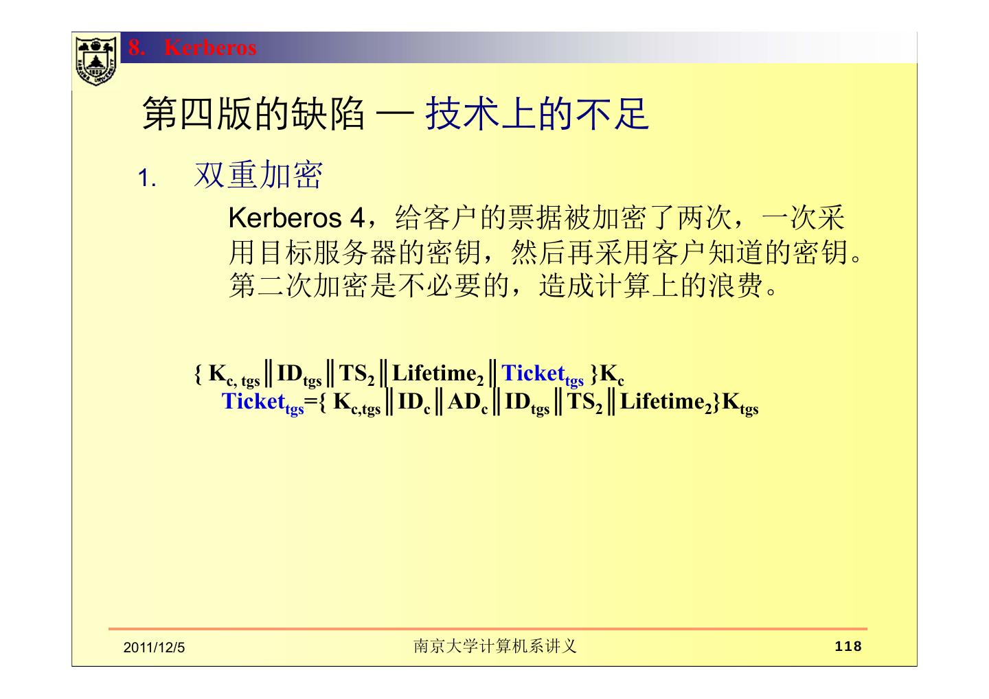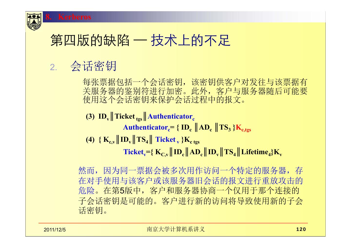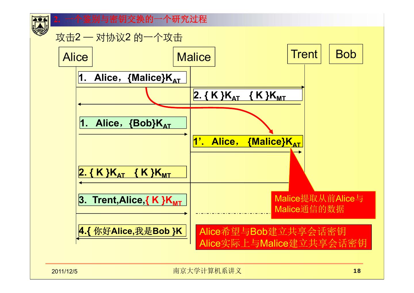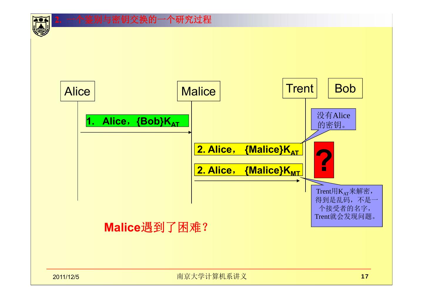 17 .2. 一个鉴别与密钥交换的一个研究过程 Alice Malice Trent Bob 没有Alice 1. Alice,{Bob}KAT 的密钥。 ? 2. Alice, {Malice}KAT 2. Alice, {Malice}KMT Trent用KAT来解密, 得到是乱码,不是一 个接受者的名字, Trent就会发现问题。 Malice遇到了困难? 2011/12/5 南京大学计算机系讲义 17