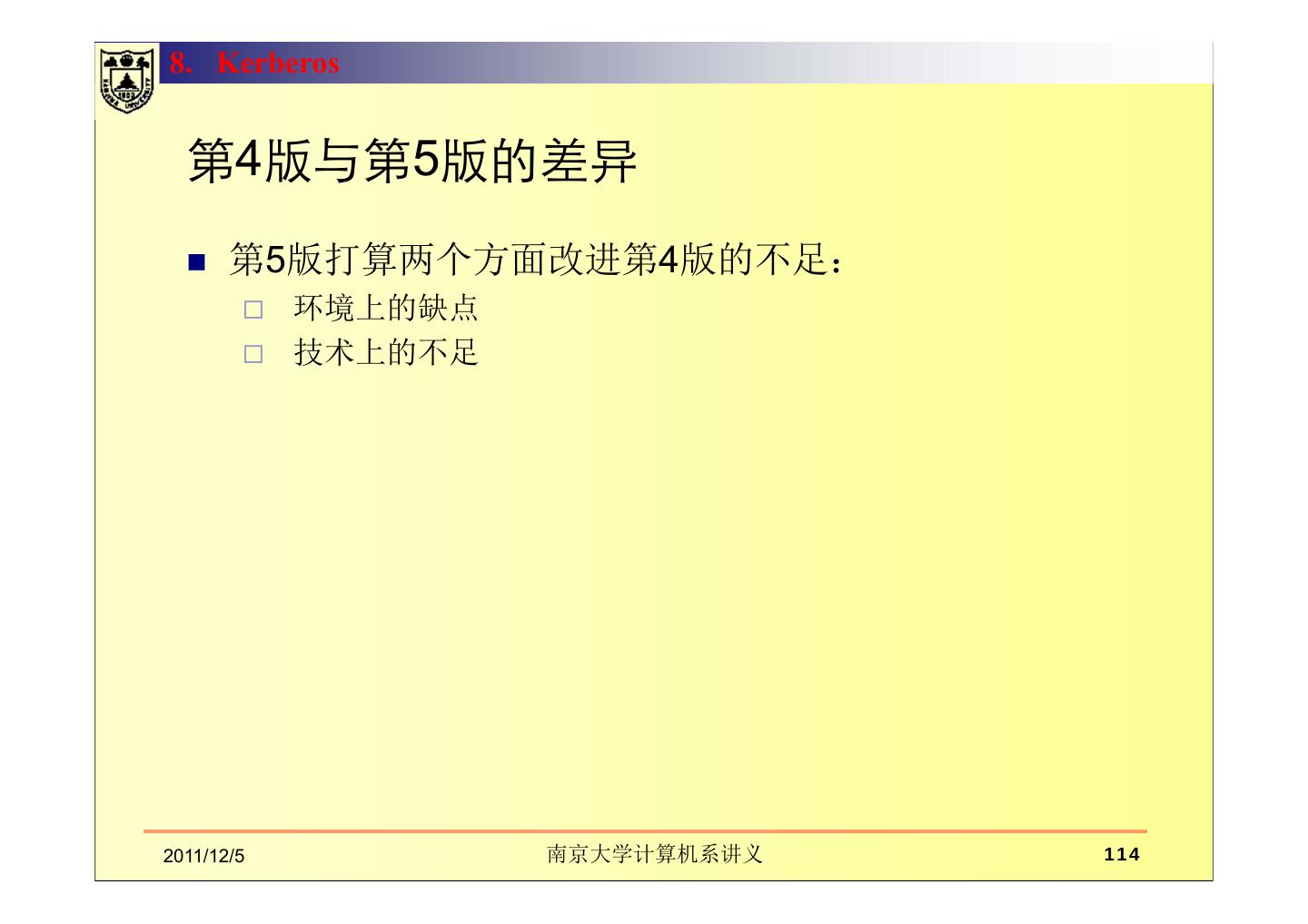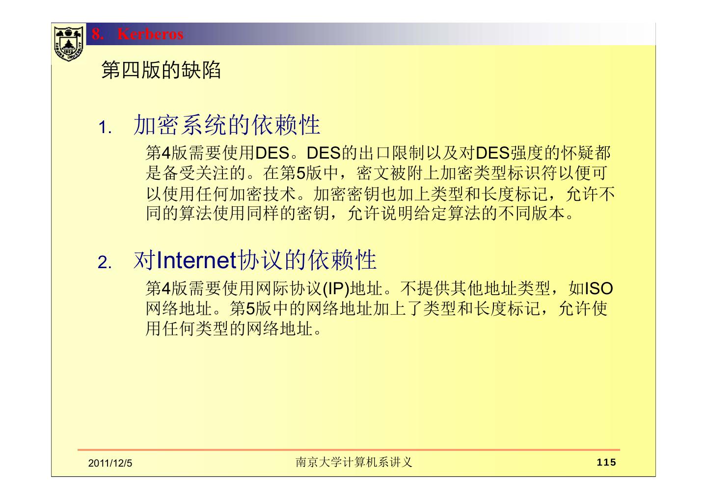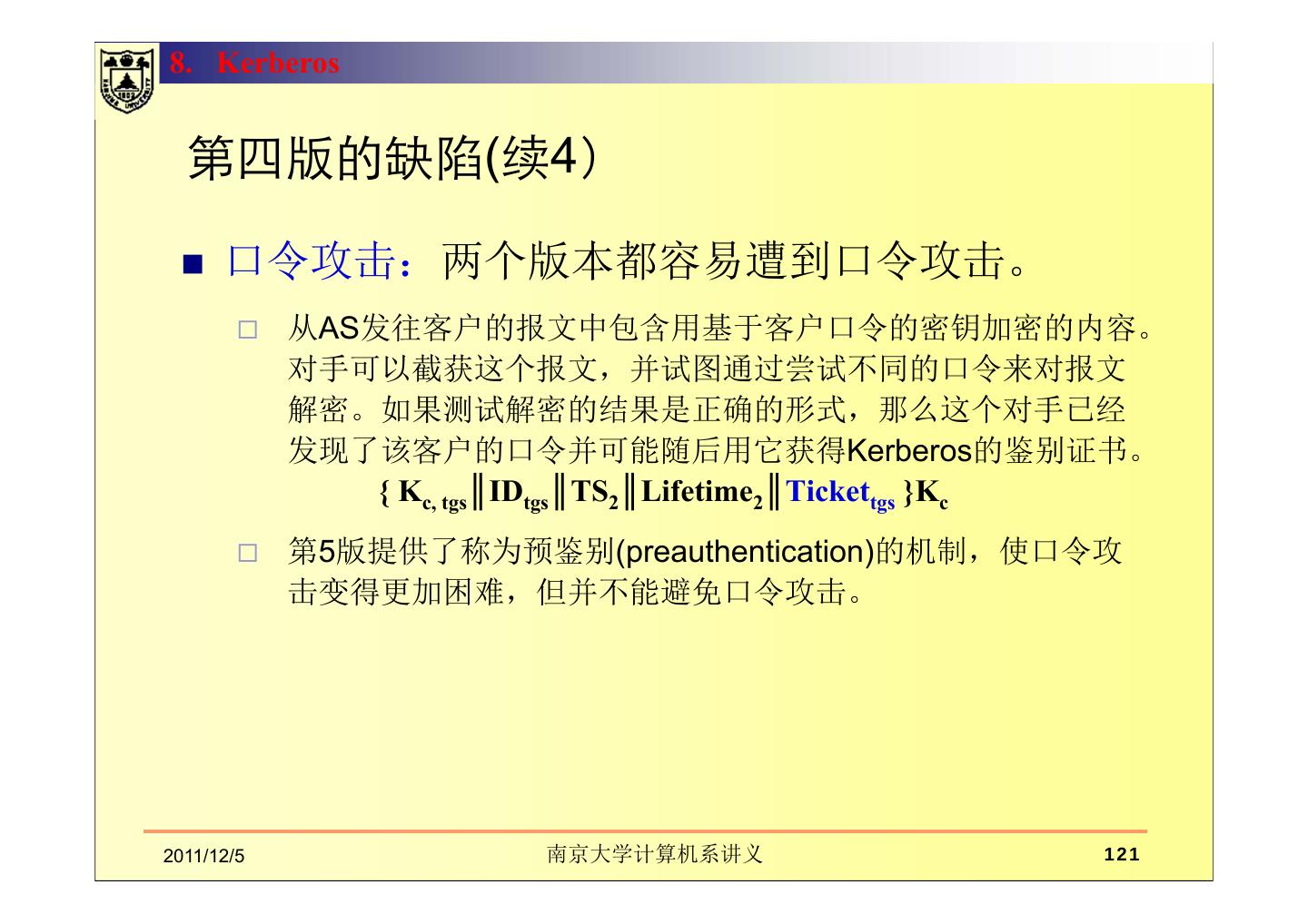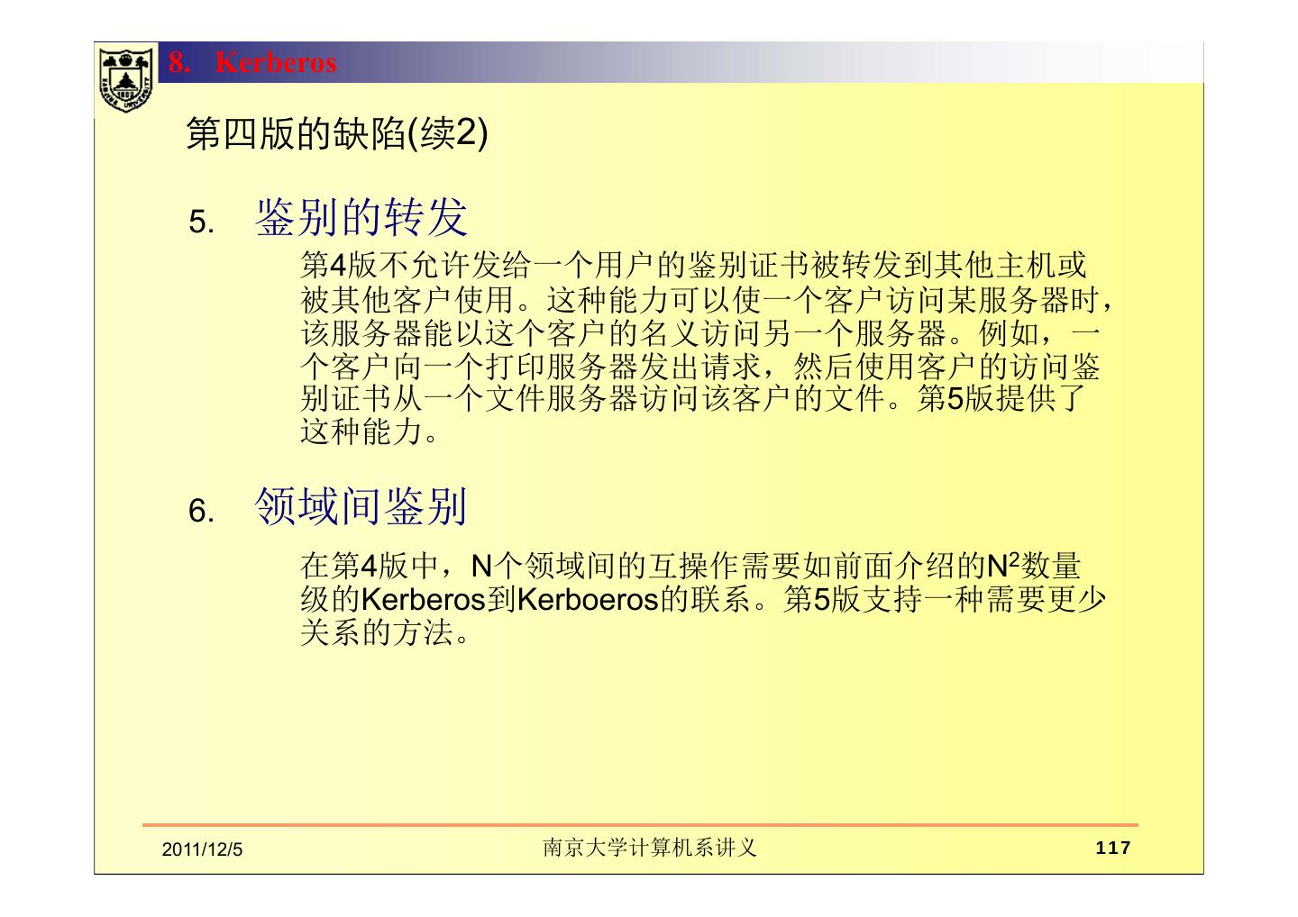 17 .2. 一个鉴别与密钥交换的一个研究过程 Alice Malice Trent Bob 没有Alice 1. Alice,{Bob}KAT 的密钥。 ? 2. Alice, {Malice}KAT 2. Alice, {Malice}KMT Trent用KAT来解密, 得到是乱码,不是一 个接受者的名字, Trent就会发现问题。 Malice遇到了困难? 2011/12/5 南京大学计算机系讲义 17