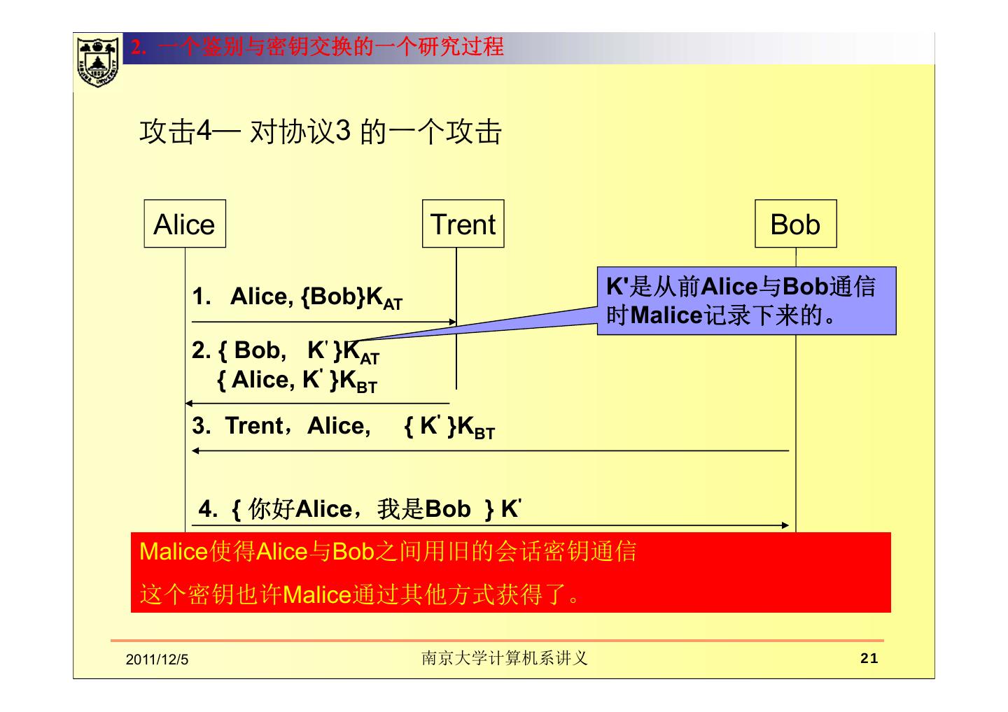 20 .2. 一个鉴别与密钥交换的一个研究过程 协议3 —对协议2的一个修改 Alice Trent Bob 1. Alice, {Bob}KAT 2. { Bob, K }KAT { Alice, K }KBT 3. Trent,Alice, { K }KBT 4. { 你好Alice,我是Bob }K 2011/12/5 南京大学计算机系讲义 20