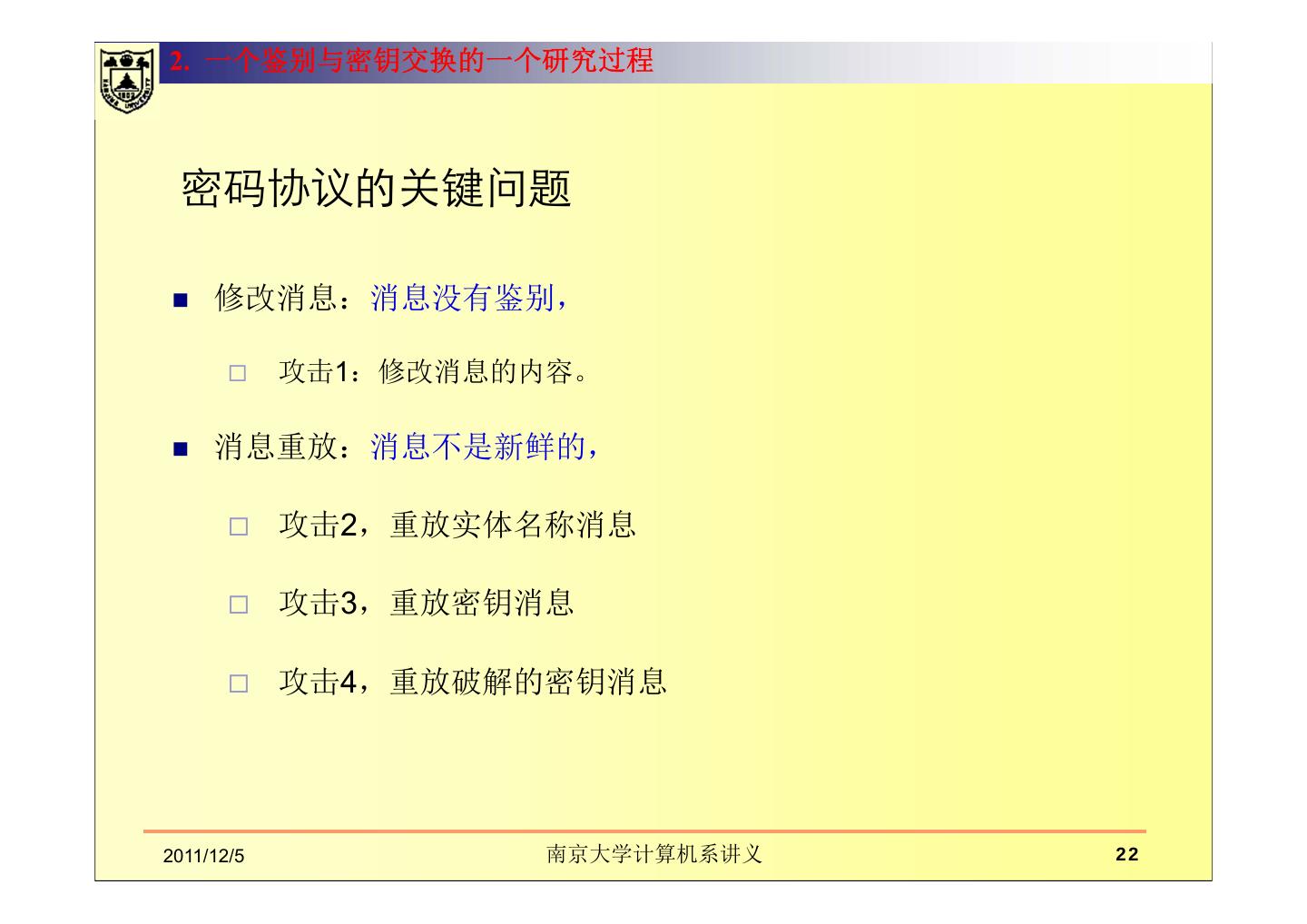 22 .2. 一个鉴别与密钥交换的一个研究过程 密码协议的关键问题 修改消息:消息没有鉴别, 攻击1:修改消息的内容。 消息重放:消息不是新鲜的, 攻击2,重放实体名称消息 攻击3,重放密钥消息 攻击4,重放破解的密钥消息 2011/12/5 南京大学计算机系讲义 22
