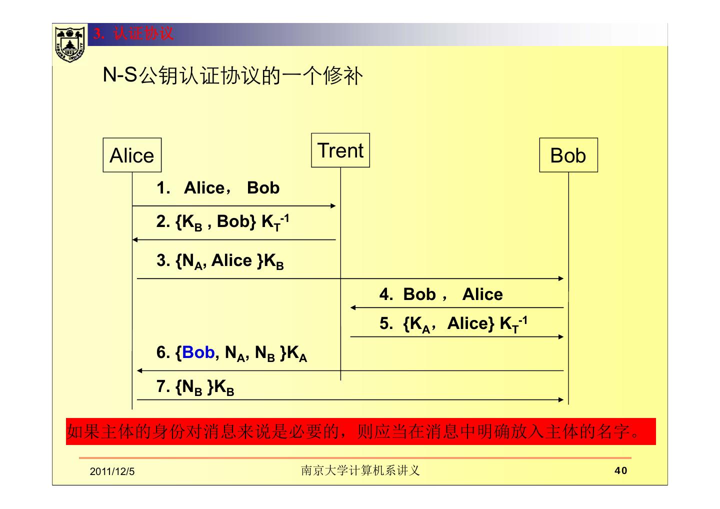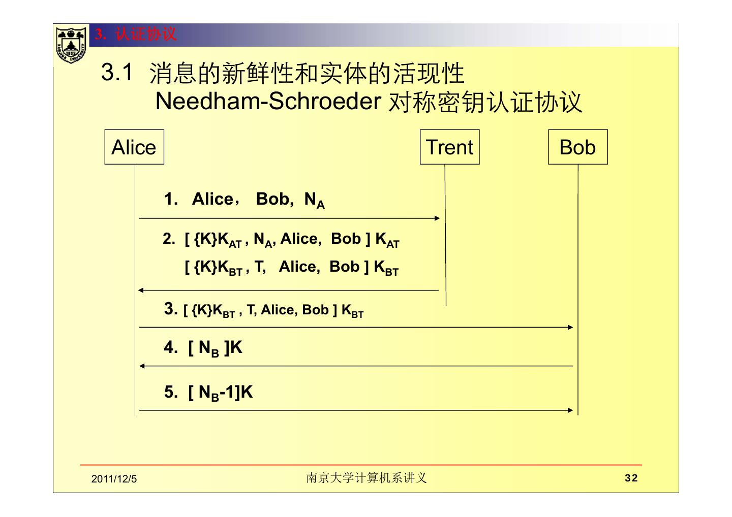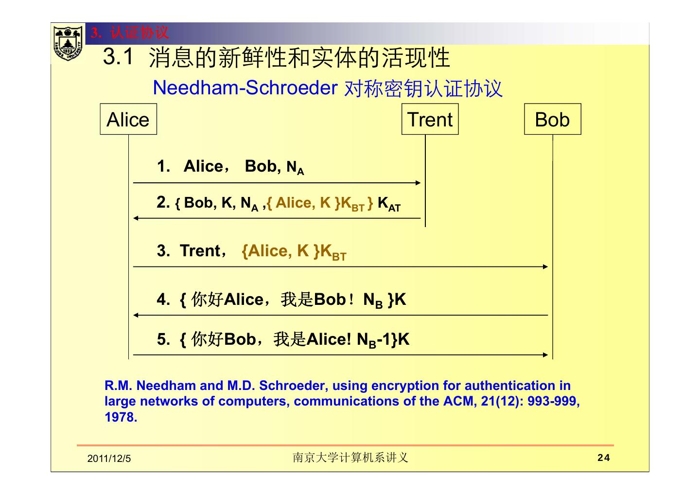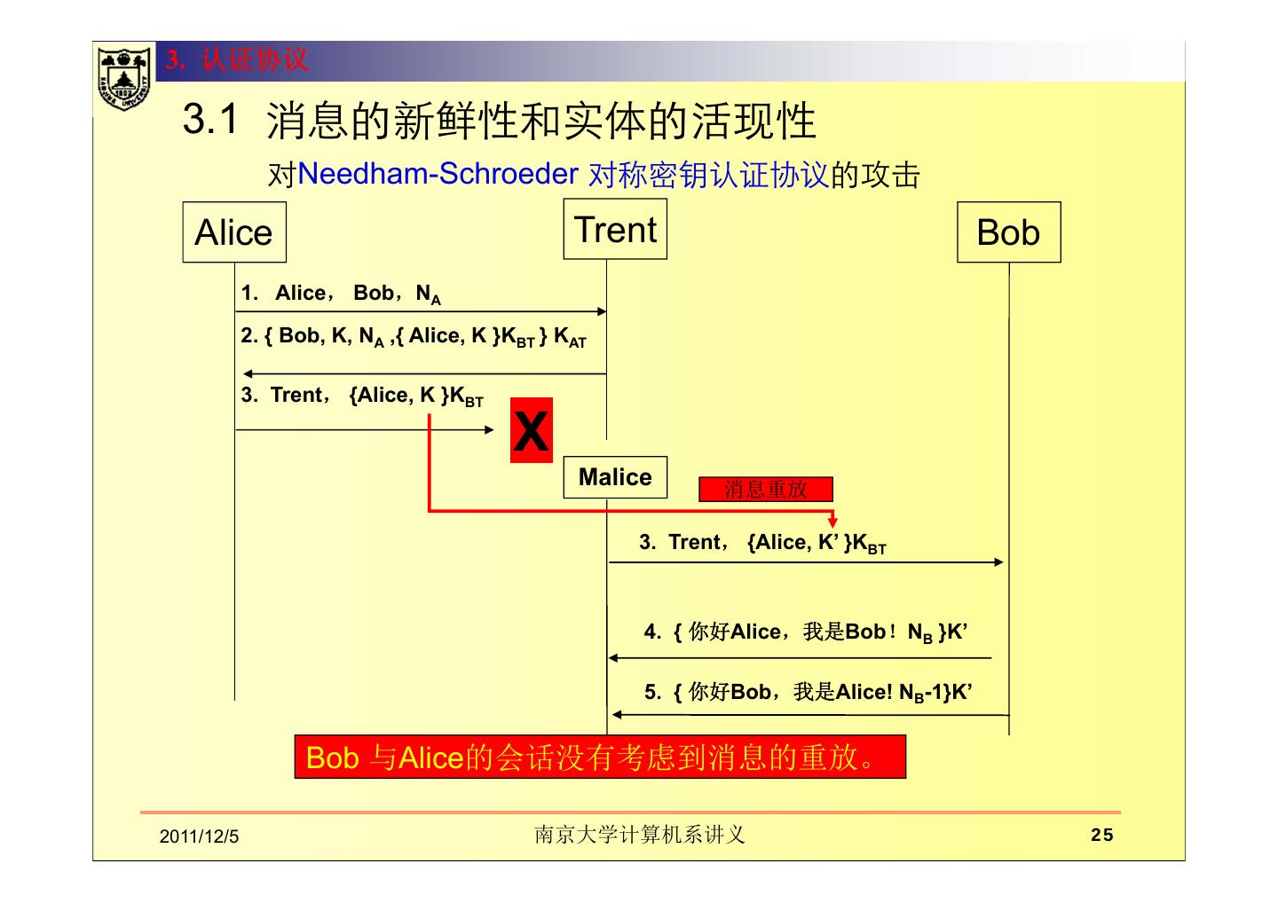 24 .3. 认证协议 3.1 消息的新鲜性和实体的活现性 Needham-Schroeder 对称密钥认证协议 Alice Trent Bob 1. Alice, Bob, NA 2. { Bob, K, NA ,{ Alice, K }KBT } KAT 3. Trent, {Alice, K }KBT 4. { 你好Alice,我是Bob!NB }K 5. { 你好Bob,我是Alice! NB-1}K R.M. Needham and M.D. Schroeder, using encryption for authentication in large networks of computers, communications of the ACM, 21(12): 993-999, 1978. 2011/12/5 南京大学计算机系讲义 24