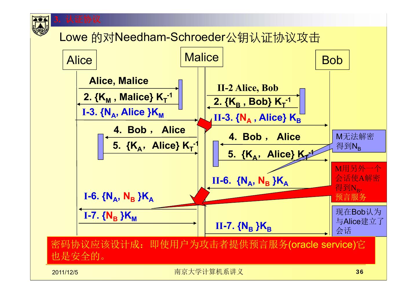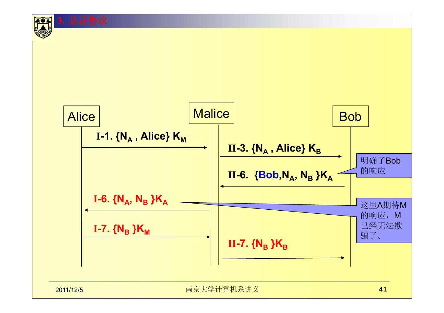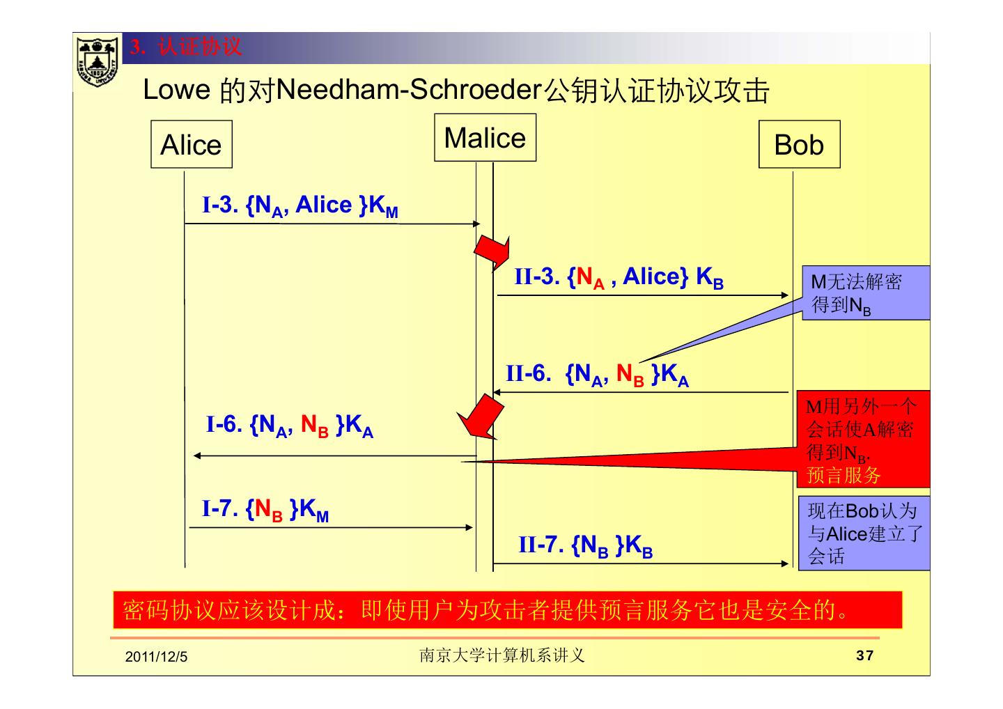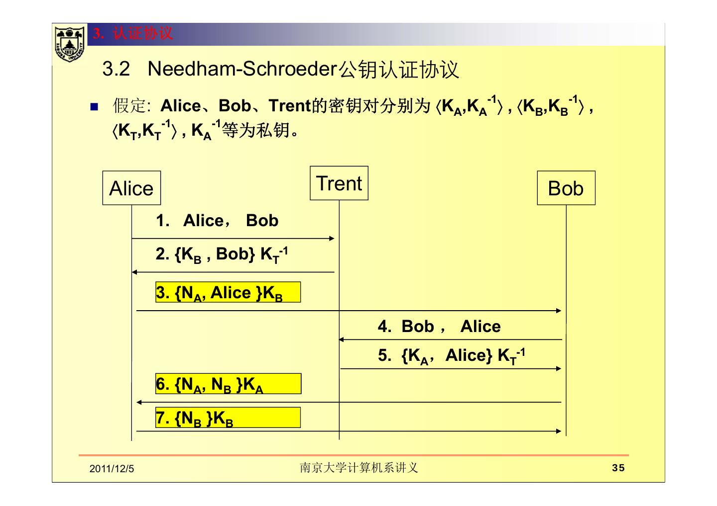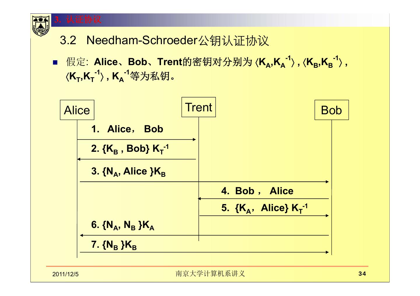 24 .3. 认证协议 3.1 消息的新鲜性和实体的活现性 Needham-Schroeder 对称密钥认证协议 Alice Trent Bob 1. Alice, Bob, NA 2. { Bob, K, NA ,{ Alice, K }KBT } KAT 3. Trent, {Alice, K }KBT 4. { 你好Alice,我是Bob!NB }K 5. { 你好Bob,我是Alice! NB-1}K R.M. Needham and M.D. Schroeder, using encryption for authentication in large networks of computers, communications of the ACM, 21(12): 993-999, 1978. 2011/12/5 南京大学计算机系讲义 24