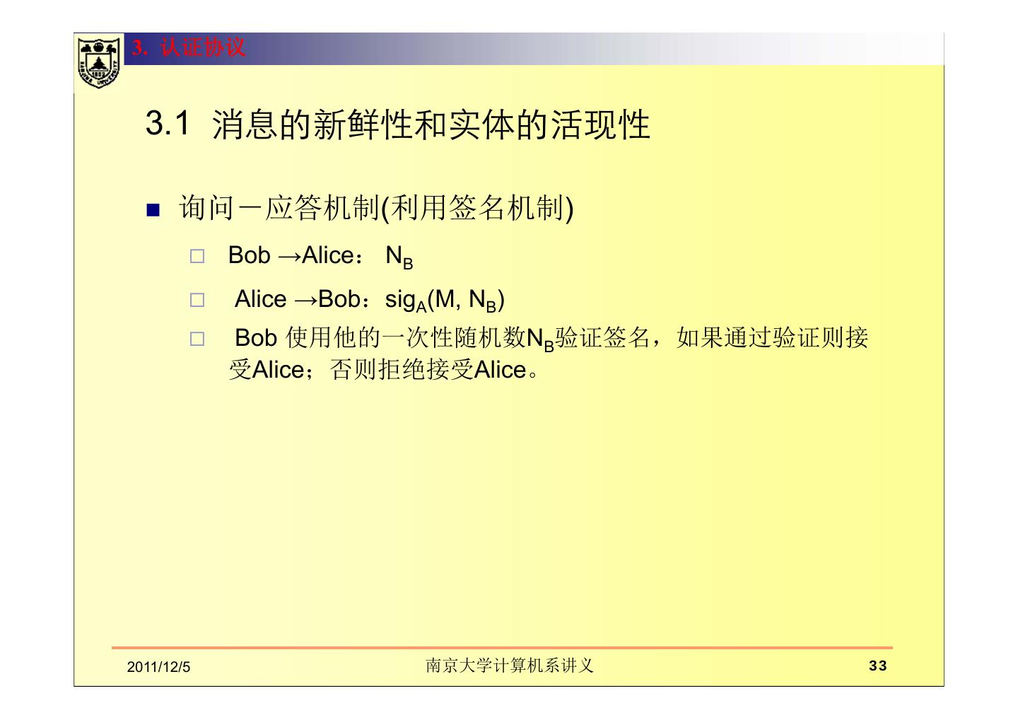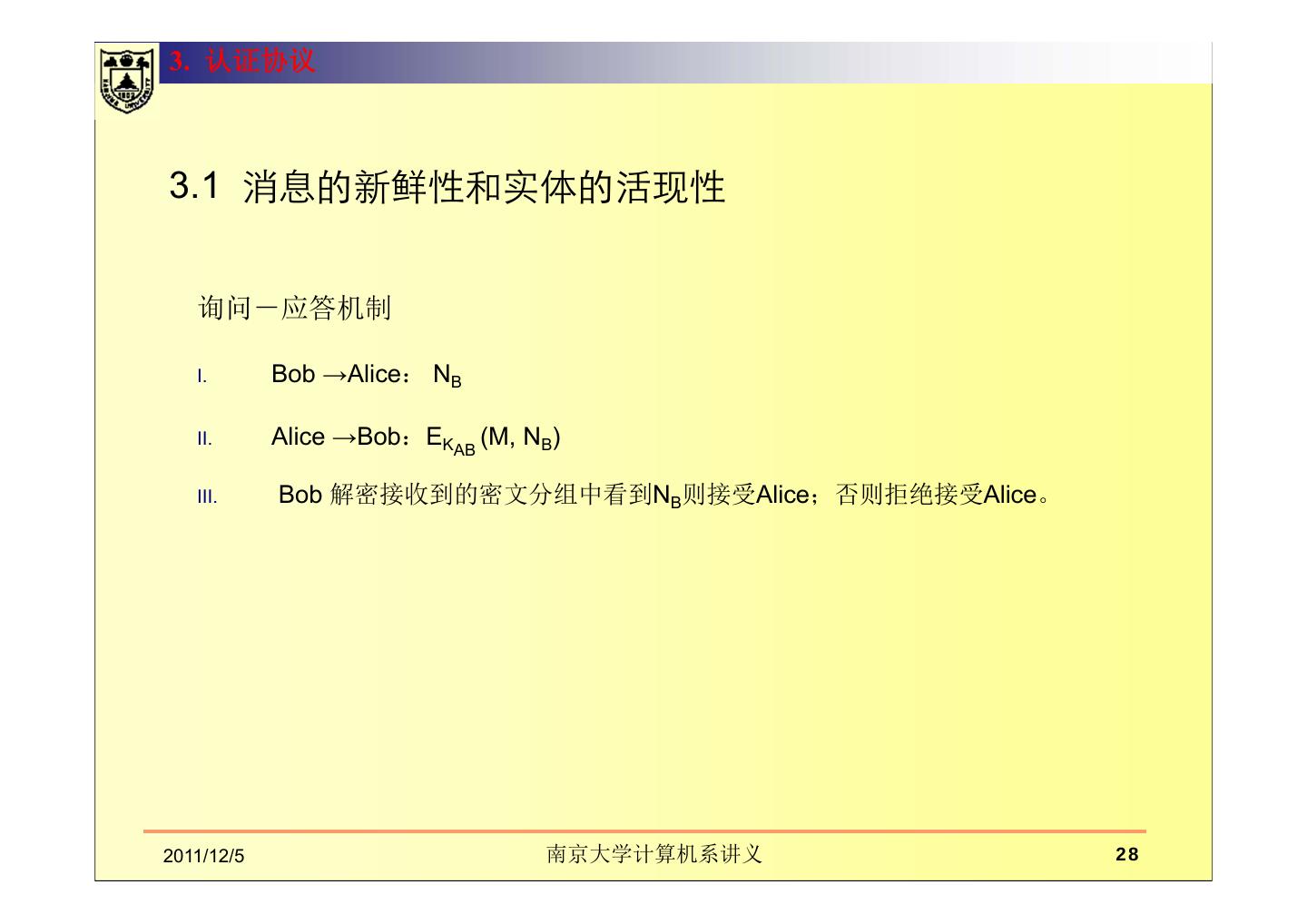28 .3. 认证协议 3.1 消息的新鲜性和实体的活现性 询问-应答机制 I. Bob →Alice: NB II. Alice →Bob:EKAB (M, NB) III. Bob 解密接收到的密文分组中看到NB则接受Alice;否则拒绝接受Alice。 2011/12/5 南京大学计算机系讲义 28