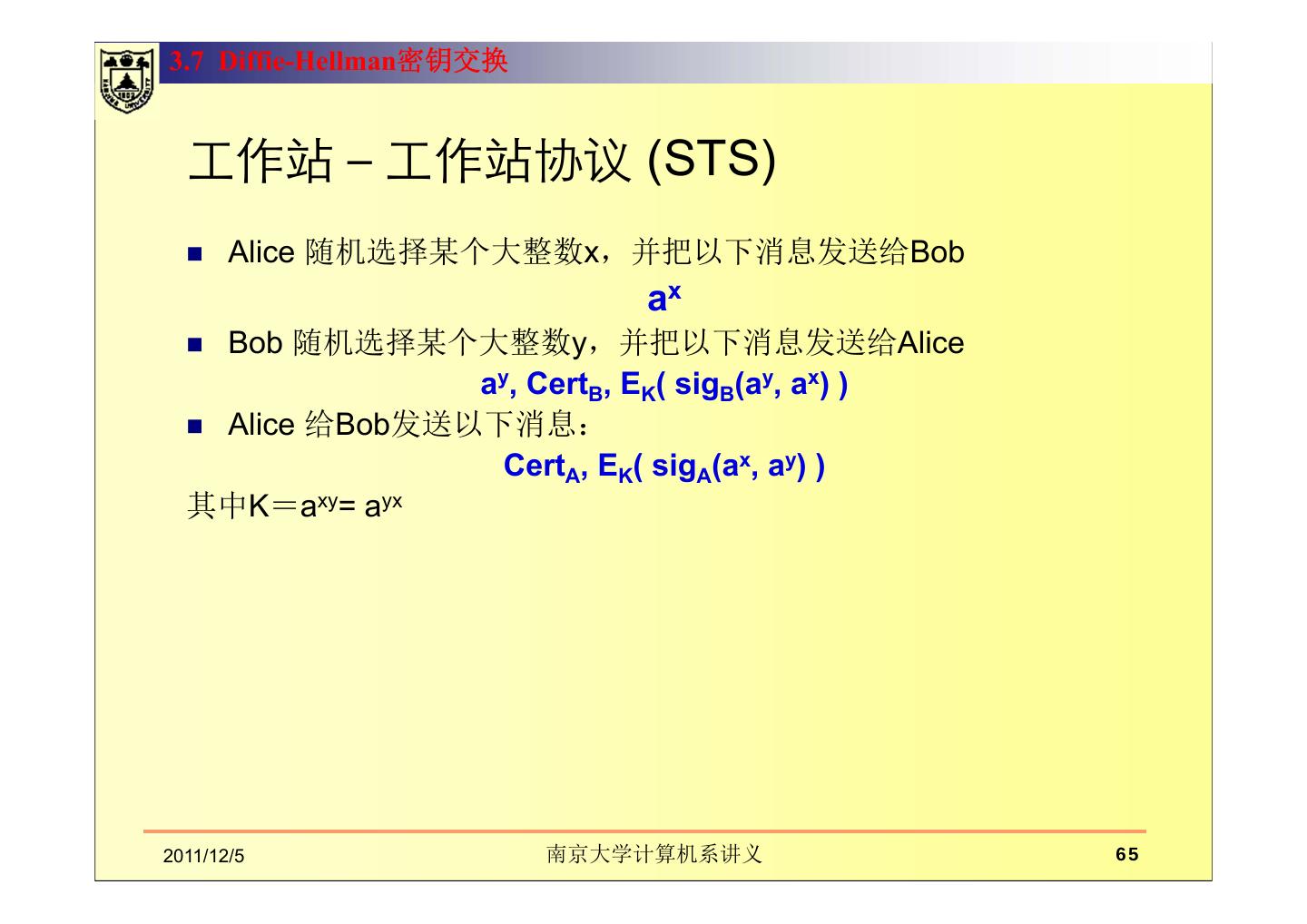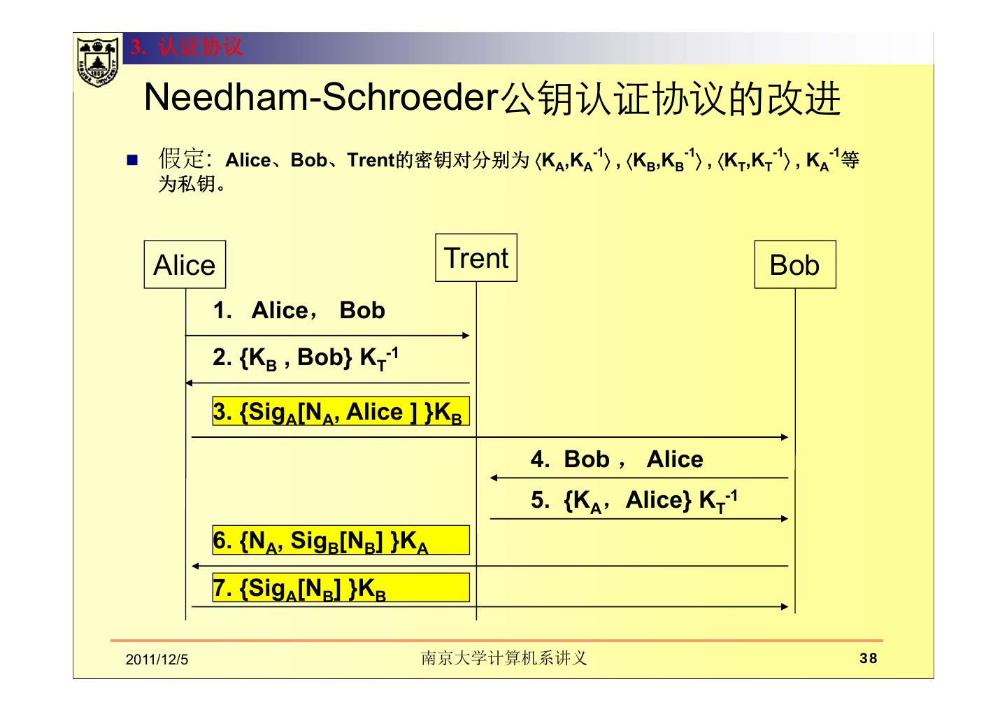 26 .3. 认证协议 Denning & Sacco的建议— 时间戳 Alice Trent Bob 1. Alice, Bob 2. { Bob, K, T ,{ Alice, K , T }KBT } KAT 3. {Alice, K, T }KBT 4. { 你好Alice,我是Bob!NB }K 5. { 你好Bob,我是Alice! NB-1}K 验证是要求: | Clock –T | < ∆ t1 + ∆ t2 2011/12/5 南京大学计算机系讲义 26