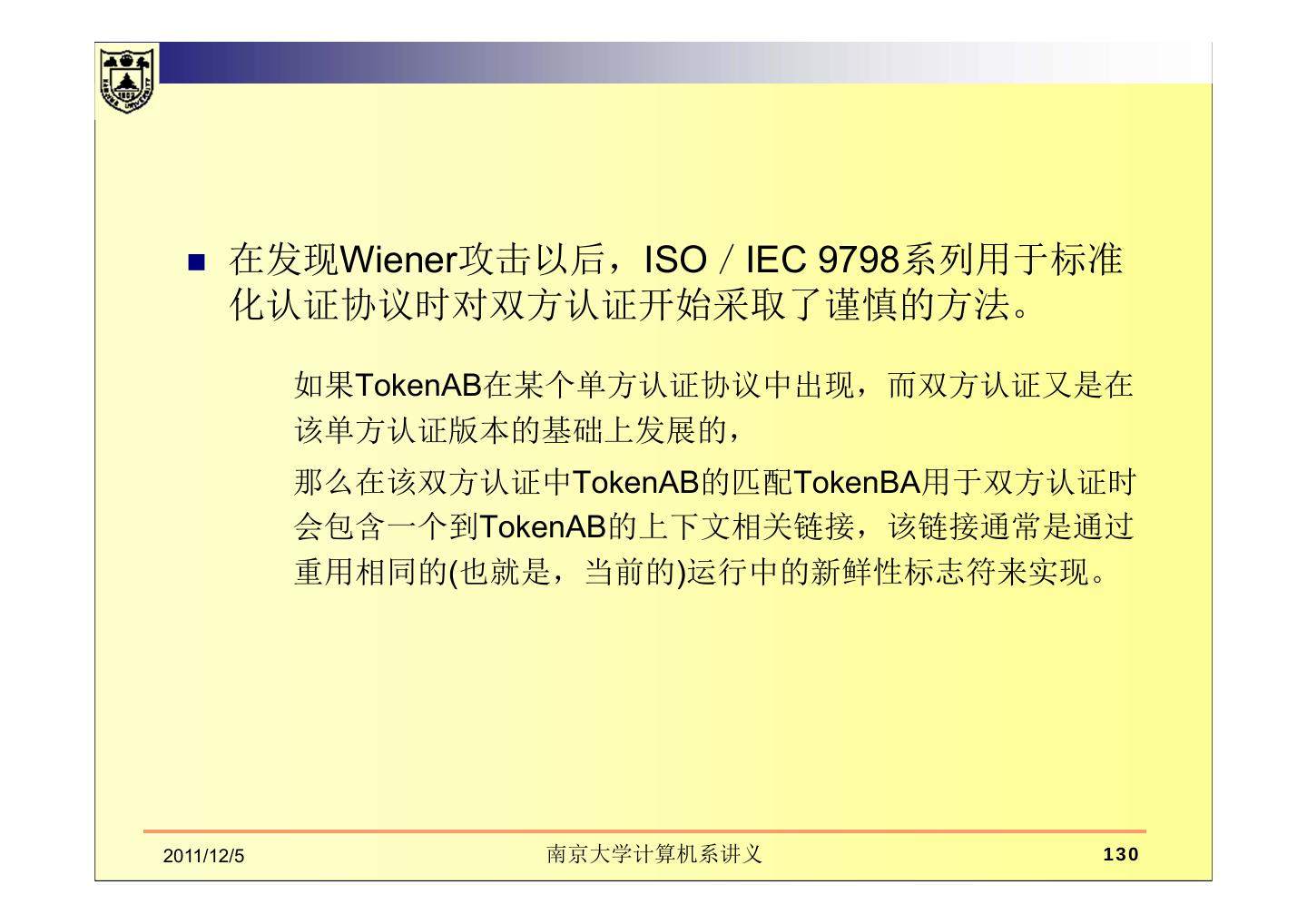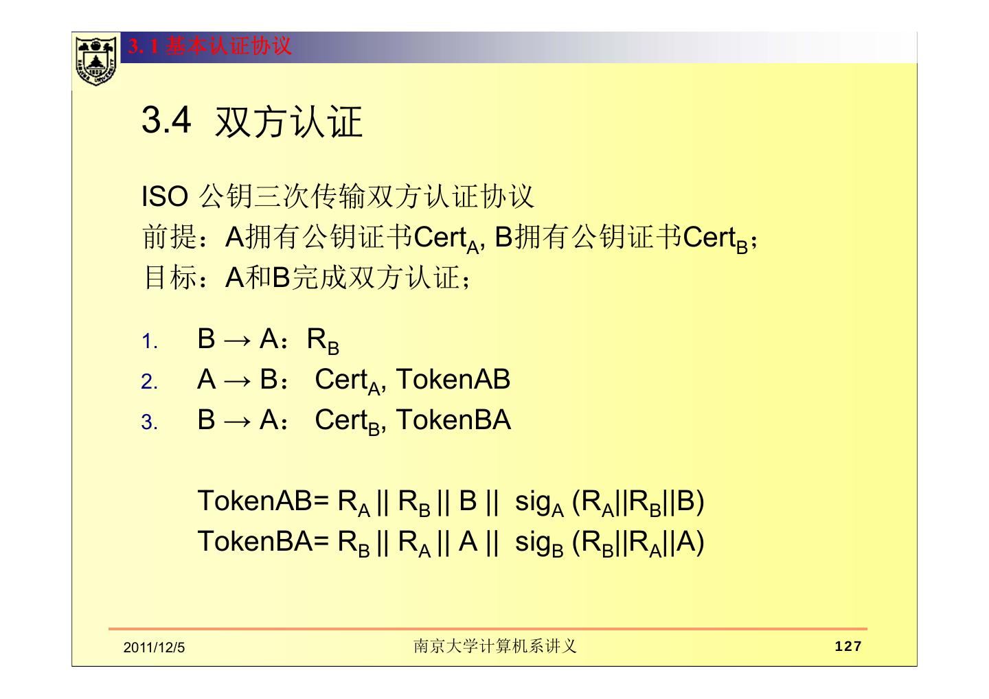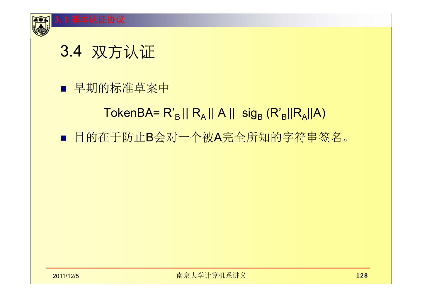 27 .3. 认证协议 Denning & Sacco的建议— 时间戳 Denning的协议与Needham/Schroeder的协议相比似乎增加了安全度。 然而,又出现了新的担忧:这个新机制需要信任通过网络进行同步 的时钟。 存在一种危险,分布时钟由于阴谋破坏或同步时钟、同步机制的故 障变得不同步。 当发方的时钟快于预想的收方时钟时,这个问题就会发生。在这种 情况下,对手可截获发自A的报文,当报文中的时间戳变成收方的当 前时间时就重放该报文。这种重放可导致不可预料的结果。这样的 攻击称为抑制—重放攻击。 2011/12/5 南京大学计算机系讲义 27