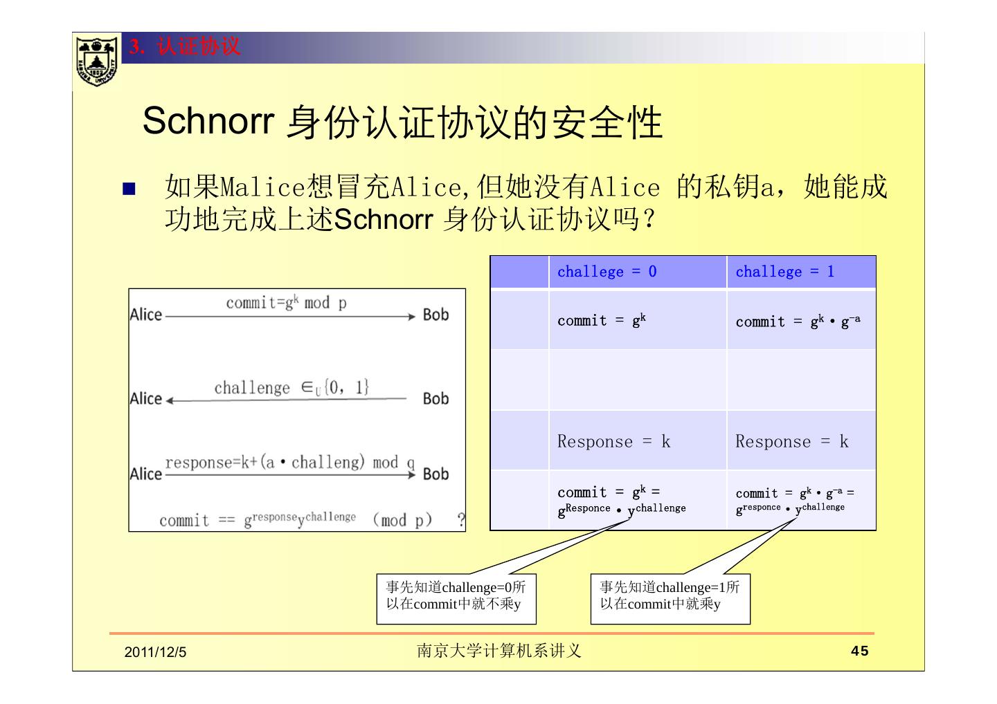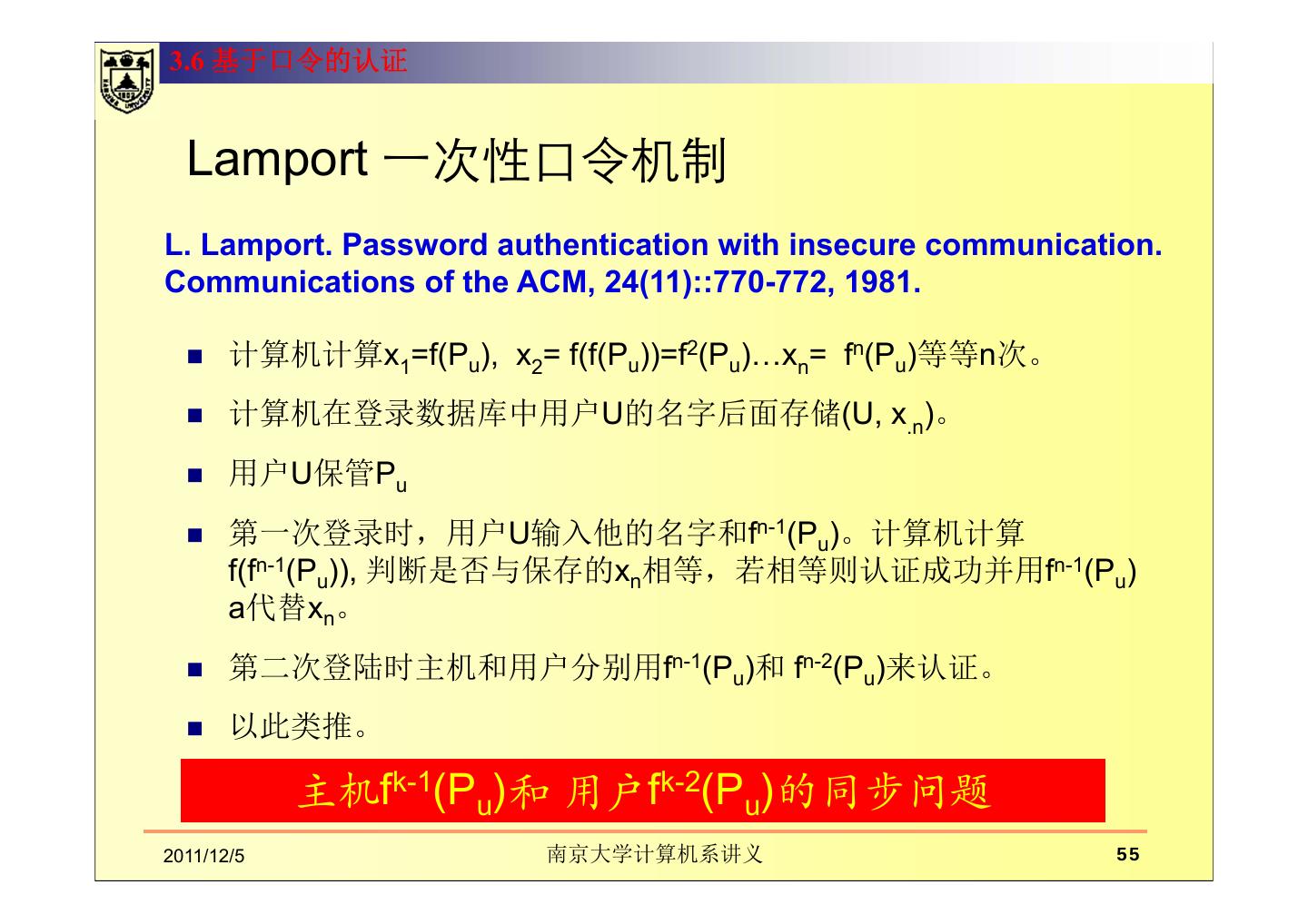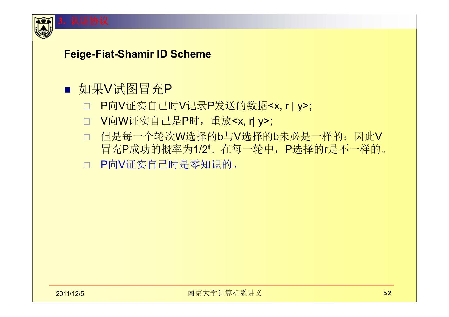 27 .3. 认证协议 Denning & Sacco的建议— 时间戳 Denning的协议与Needham/Schroeder的协议相比似乎增加了安全度。 然而,又出现了新的担忧:这个新机制需要信任通过网络进行同步 的时钟。 存在一种危险,分布时钟由于阴谋破坏或同步时钟、同步机制的故 障变得不同步。 当发方的时钟快于预想的收方时钟时,这个问题就会发生。在这种 情况下,对手可截获发自A的报文,当报文中的时间戳变成收方的当 前时间时就重放该报文。这种重放可导致不可预料的结果。这样的 攻击称为抑制—重放攻击。 2011/12/5 南京大学计算机系讲义 27