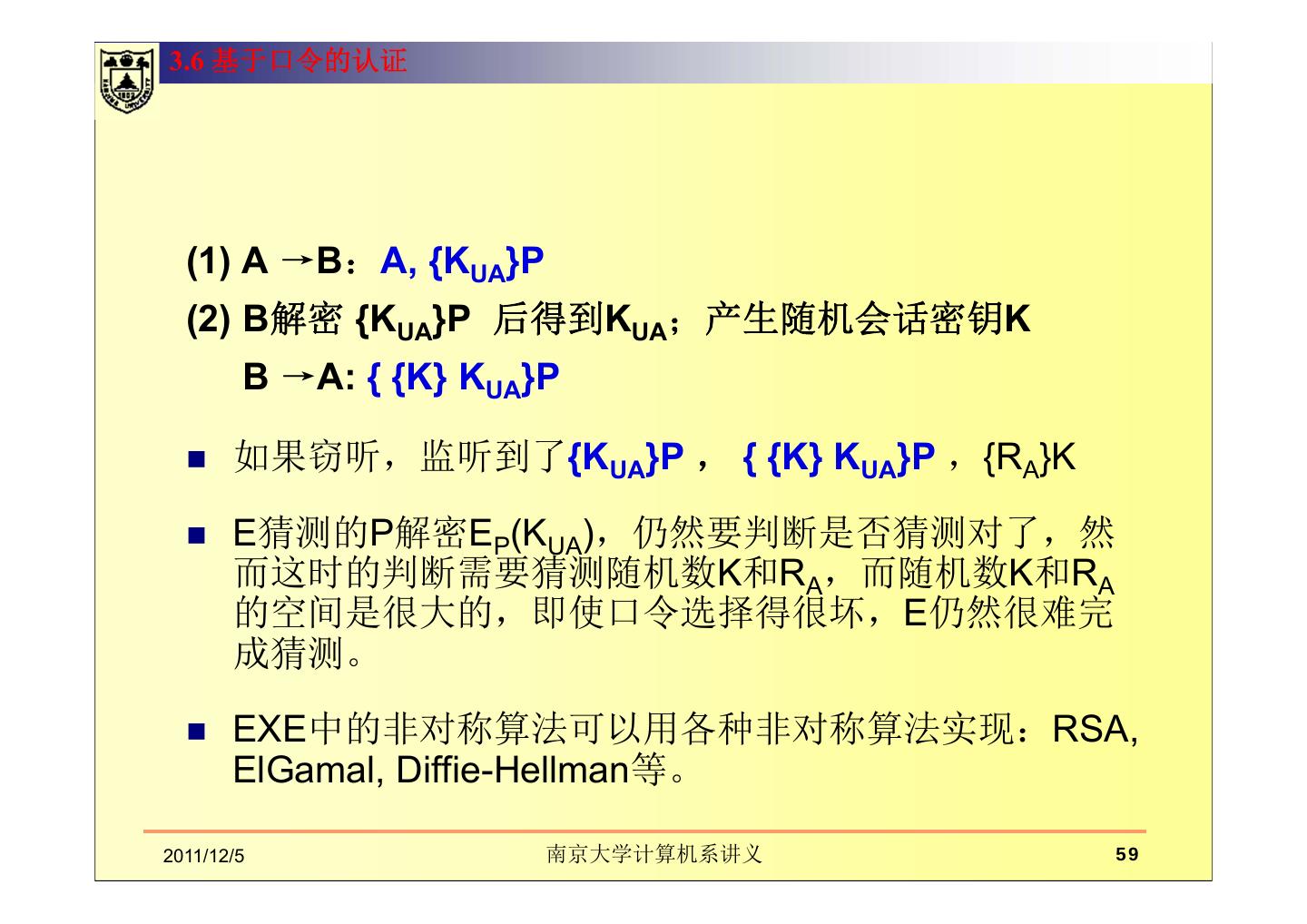 11 .1. 密码协议的基本概念 密码协议概述—对协议的攻击 被动攻击 (passive attack) 窃听协议的部分和全部 主动攻击(active attack) 引入新的消息、删除原有的消息、重放消息 被动骗子(passive cheater) 遵守协议,但试图获得协议外的消息 主动骗子(active cheater) 破坏协议 协议对被动欺骗来说应该是安全的 合法用户可以发觉是否有主动欺骗 2011/12/5 南京大学计算机系讲义 11