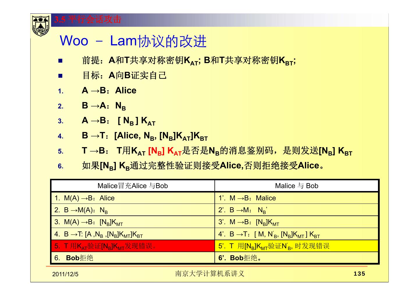 19 . 2. 一个鉴别与密钥交换的一个研究过程 攻击3 — 对协议2的又一个攻击 Alice Malice Trent Bob 1. Alice,{Bob}KAT 2. { K }KAT { K }KBT X 3. { K’ }KAT { K }KBT 消息{ K’ }KAT 是从前Alice与Malice 通信时Trent发送的,现在Malice重 4. Trent,Alice,{ K }KBT 新发送该消息。 Malice改变协议中某些消息而不被 5.{ 你好Alie,我是Bob }K’ 发现是可能的。 消息可能被重新播放 2011/12/5 南京大学计算机系讲义 19