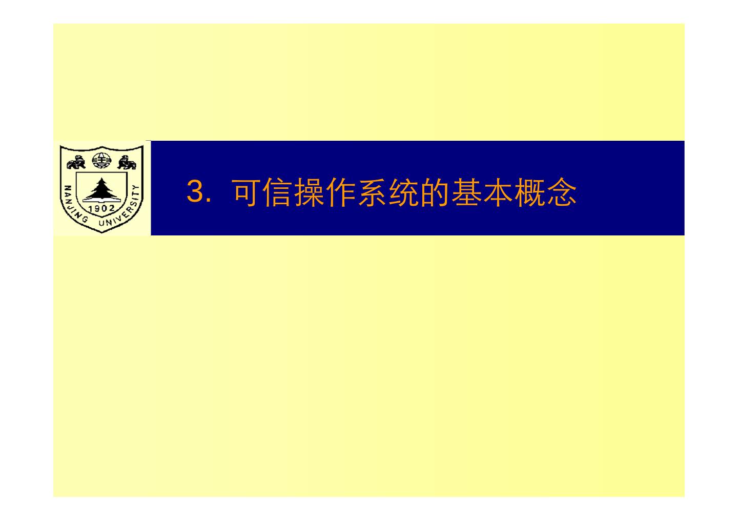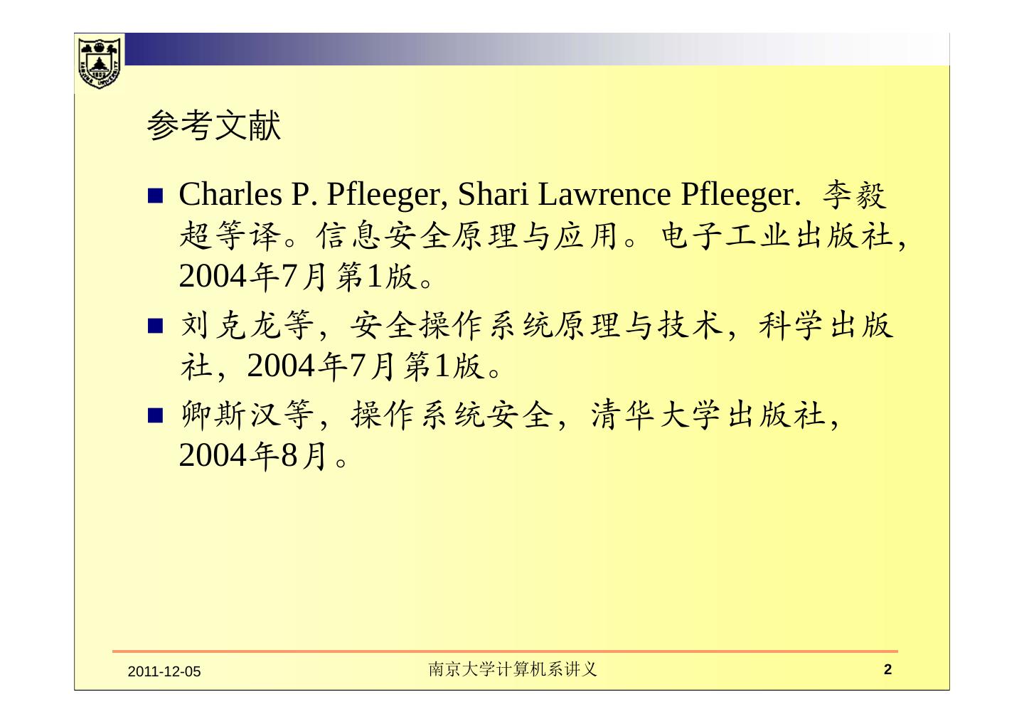 2 . 参考文献 Charles P. Pfleeger, Shari Lawrence Pfleeger. 李毅 超等译。信息安全原理与应用。电子工业出版社, 2004年7月第1版。 刘克龙等,安全操作系统原理与技术,科学出版 社,2004年7月第1版。 卿斯汉等,操作系统安全,清华大学出版社, 2004年8月。 2011-12-05 南京大学计算机系讲义 2