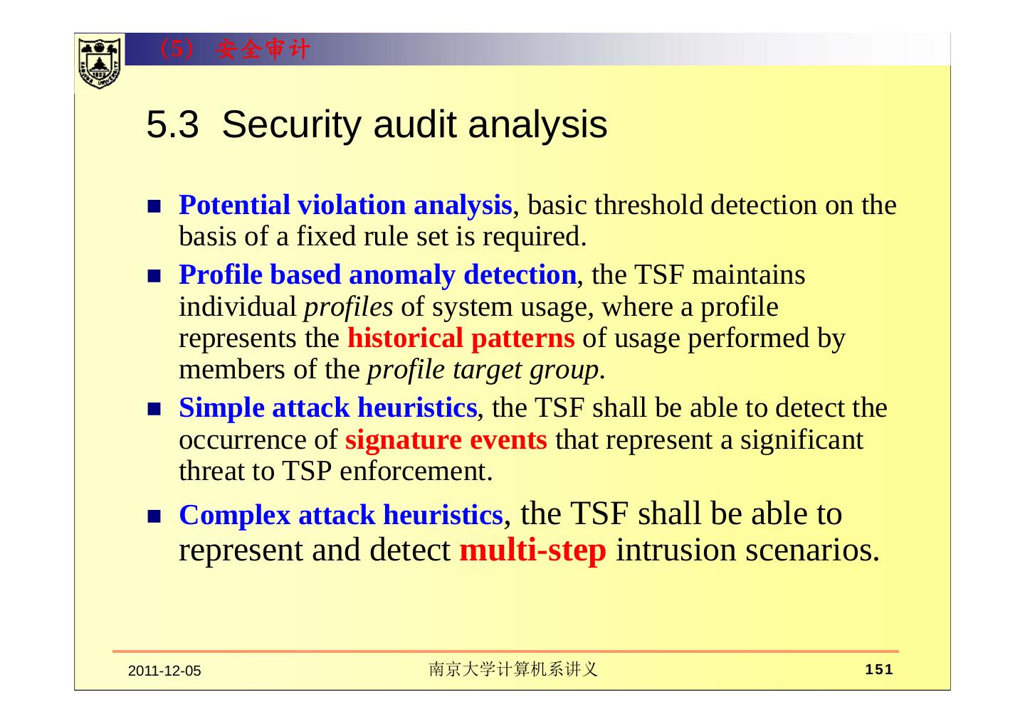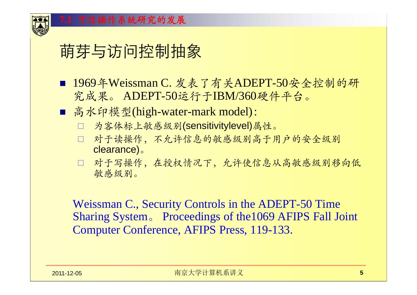 5 . 7.1 可信操作系统研究的发展 萌芽与访问控制抽象 1969年Weissman C. 发表了有关ADEPT-50安全控制的研 究成果。 ADEPT-50运行于IBM/360硬件平台。 高水印模型(high-water-mark model): 为客体标上敏感级别(sensitivitylevel)属性。 对于读操作,不允许信息的敏感级别高于用户的安全级别 clearance)。 对于写操作,在授权情况下,允许使信息从高敏感级别移向低 敏感级别。 Weissman C., Security Controls in the ADEPT-50 Time Sharing System。 Proceedings of the1069 AFIPS Fall Joint Computer Conference, AFIPS Press, 119-133. 2011-12-05 南京大学计算机系讲义 5
