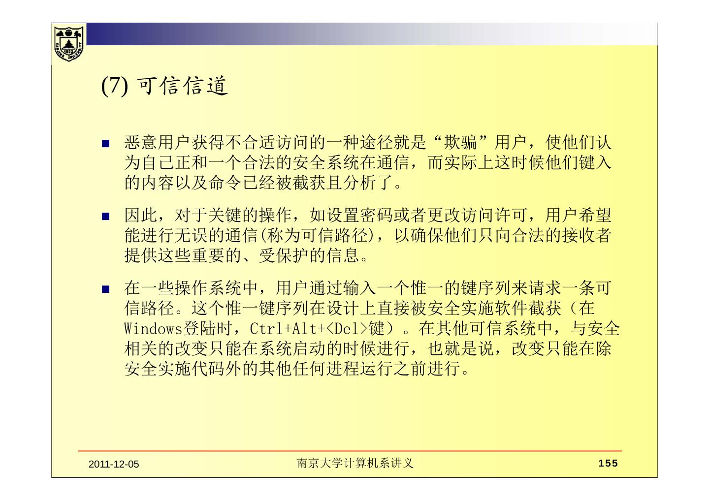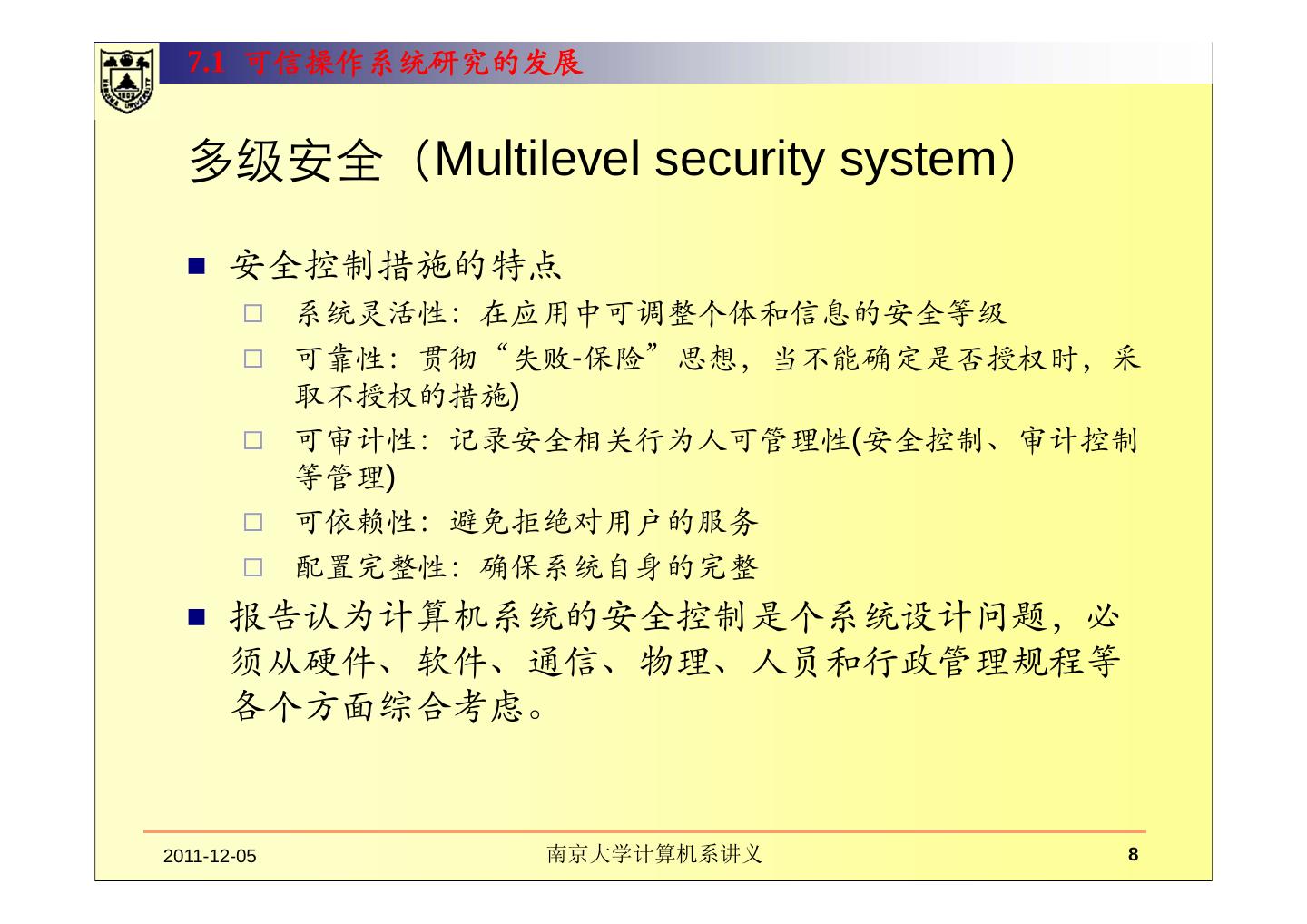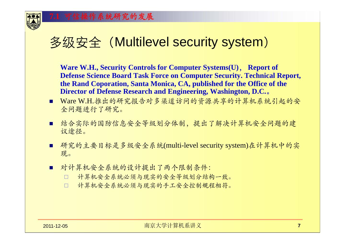 7 . 7.1 可信操作系统研究的发展 多级安全(Multilevel security system) Ware W.H., Security Controls for Computer Systems(U), Report of Defense Science Board Task Force on Computer Security. Technical Report, the Rand Coporation, Santa Monica, CA, published for the Office of the Director of Defense Research and Engineering, Washington, D.C.。 Ware W.H.推出的研究报告对多渠道访问的资源共享的计算机系统引起的安 全问题进行了研究。 结合实际的国防信息安全等级划分体制,提出了解决计算机安全问题的建 议途径。 研究的主要目标是多级安全系统(multi-level security system)在计算机中的实 现。 对计算机安全系统的设计提出了两个限制条件: 计算机安全系统必须与现实的安全等级划分结构一致。 计算机安全系统必须与现实的手工安全控制规程相符。 2011-12-05 南京大学计算机系讲义 7