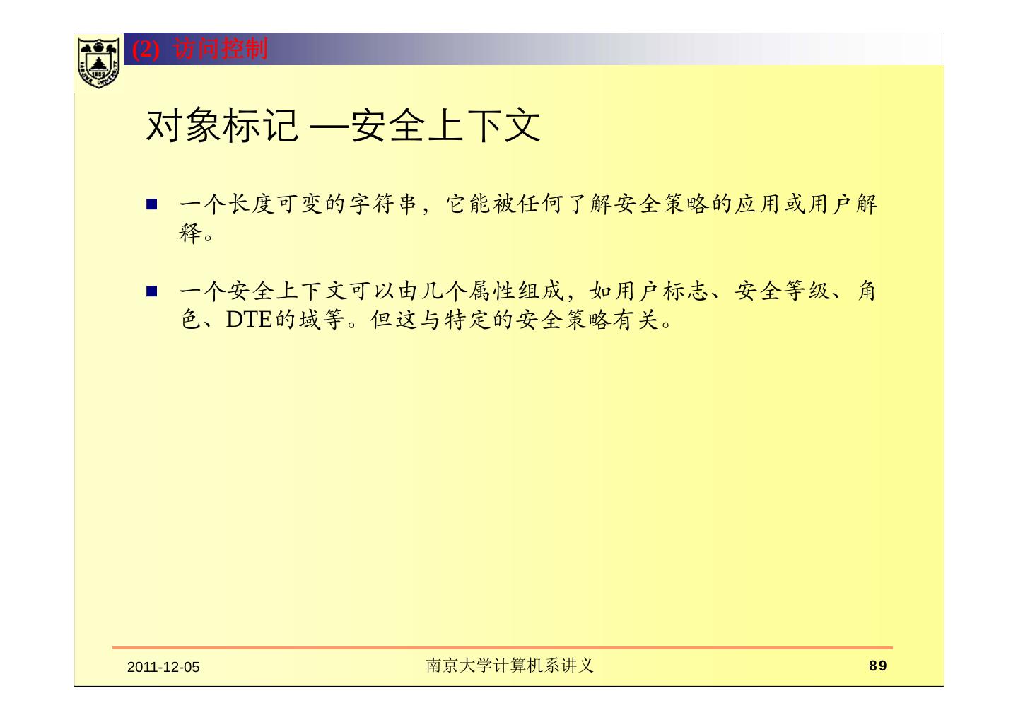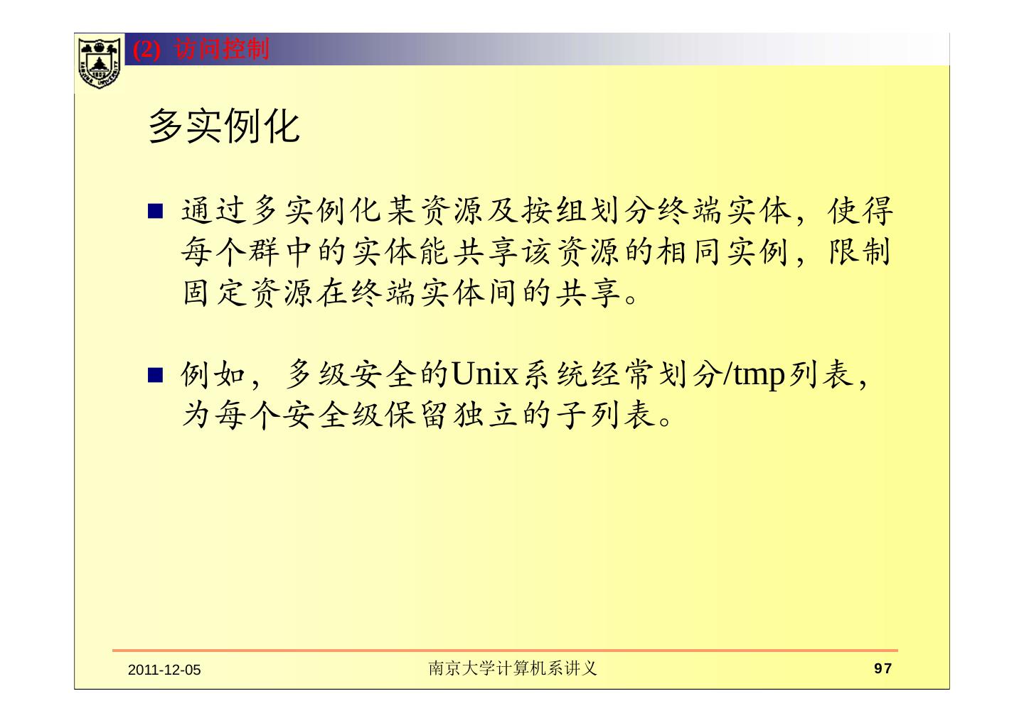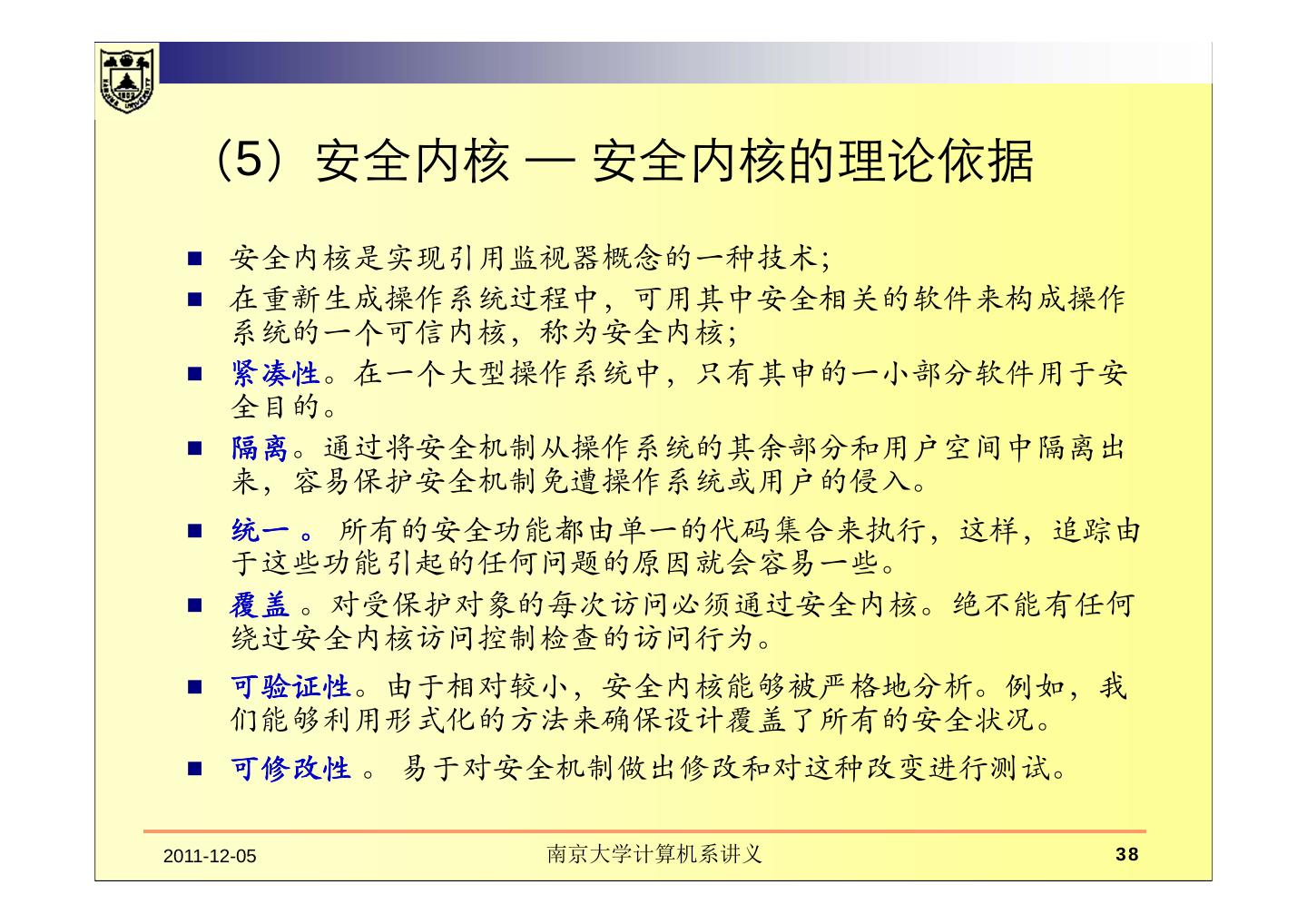 7 . 7.1 可信操作系统研究的发展 多级安全(Multilevel security system) Ware W.H., Security Controls for Computer Systems(U), Report of Defense Science Board Task Force on Computer Security. Technical Report, the Rand Coporation, Santa Monica, CA, published for the Office of the Director of Defense Research and Engineering, Washington, D.C.。 Ware W.H.推出的研究报告对多渠道访问的资源共享的计算机系统引起的安 全问题进行了研究。 结合实际的国防信息安全等级划分体制,提出了解决计算机安全问题的建 议途径。 研究的主要目标是多级安全系统(multi-level security system)在计算机中的实 现。 对计算机安全系统的设计提出了两个限制条件: 计算机安全系统必须与现实的安全等级划分结构一致。 计算机安全系统必须与现实的手工安全控制规程相符。 2011-12-05 南京大学计算机系讲义 7
