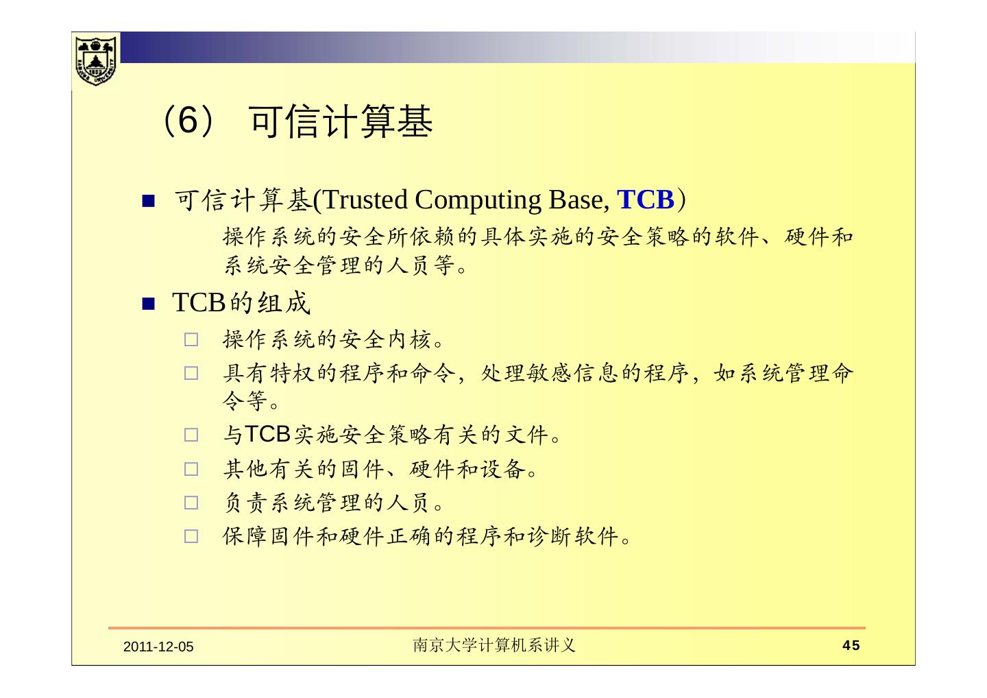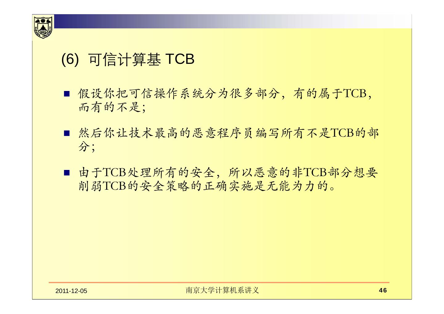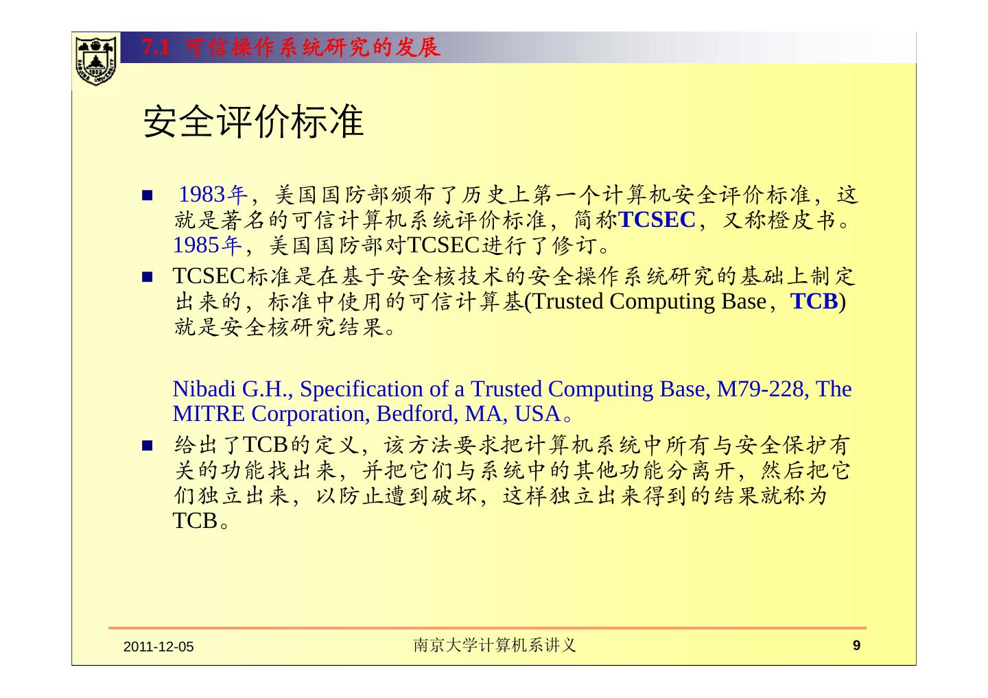 9 . 7.1 可信操作系统研究的发展 安全评价标准 1983年,美国国防部颁布了历史上第一个计算机安全评价标准,这 就是著名的可信计算机系统评价标准,简称TCSEC,又称橙皮书。 1985年,美国国防部对TCSEC进行了修订。 TCSEC标准是在基于安全核技术的安全操作系统研究的基础上制定 出来的,标准中使用的可信计算基(Trusted Computing Base,TCB) 就是安全核研究结果。 Nibadi G.H., Specification of a Trusted Computing Base, M79-228, The MITRE Corporation, Bedford, MA, USA。 给出了TCB的定义,该方法要求把计算机系统中所有与安全保护有 关的功能找出来,并把它们与系统中的其他功能分离开,然后把它 们独立出来,以防止遭到破坏,这样独立出来得到的结果就称为 TCB。 2011-12-05 南京大学计算机系讲义 9