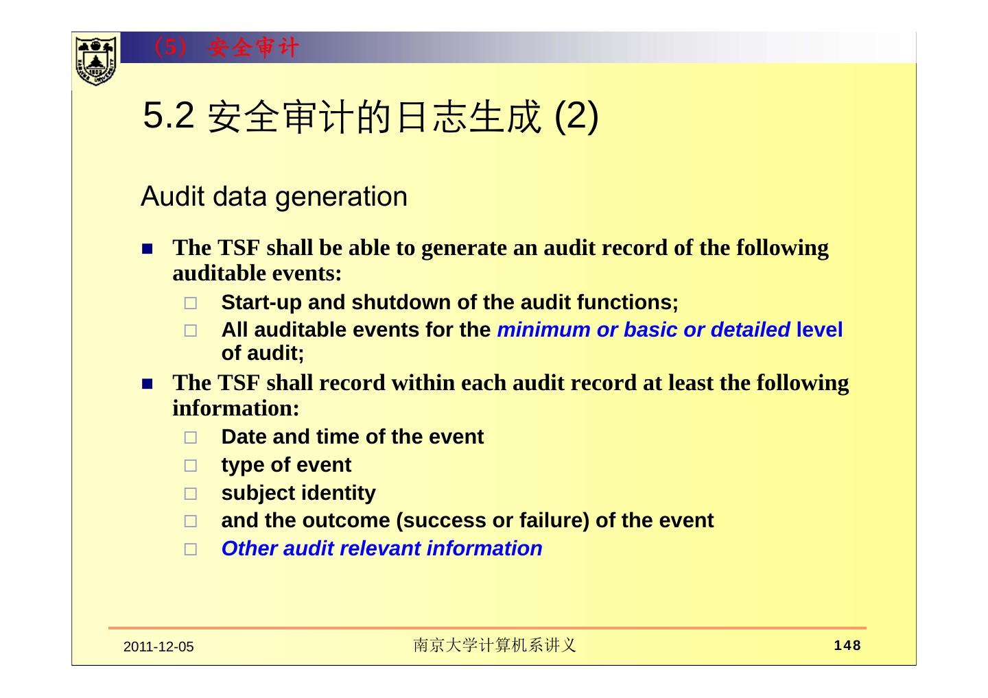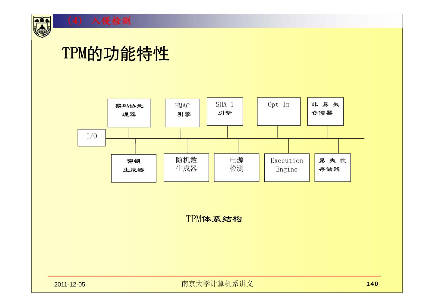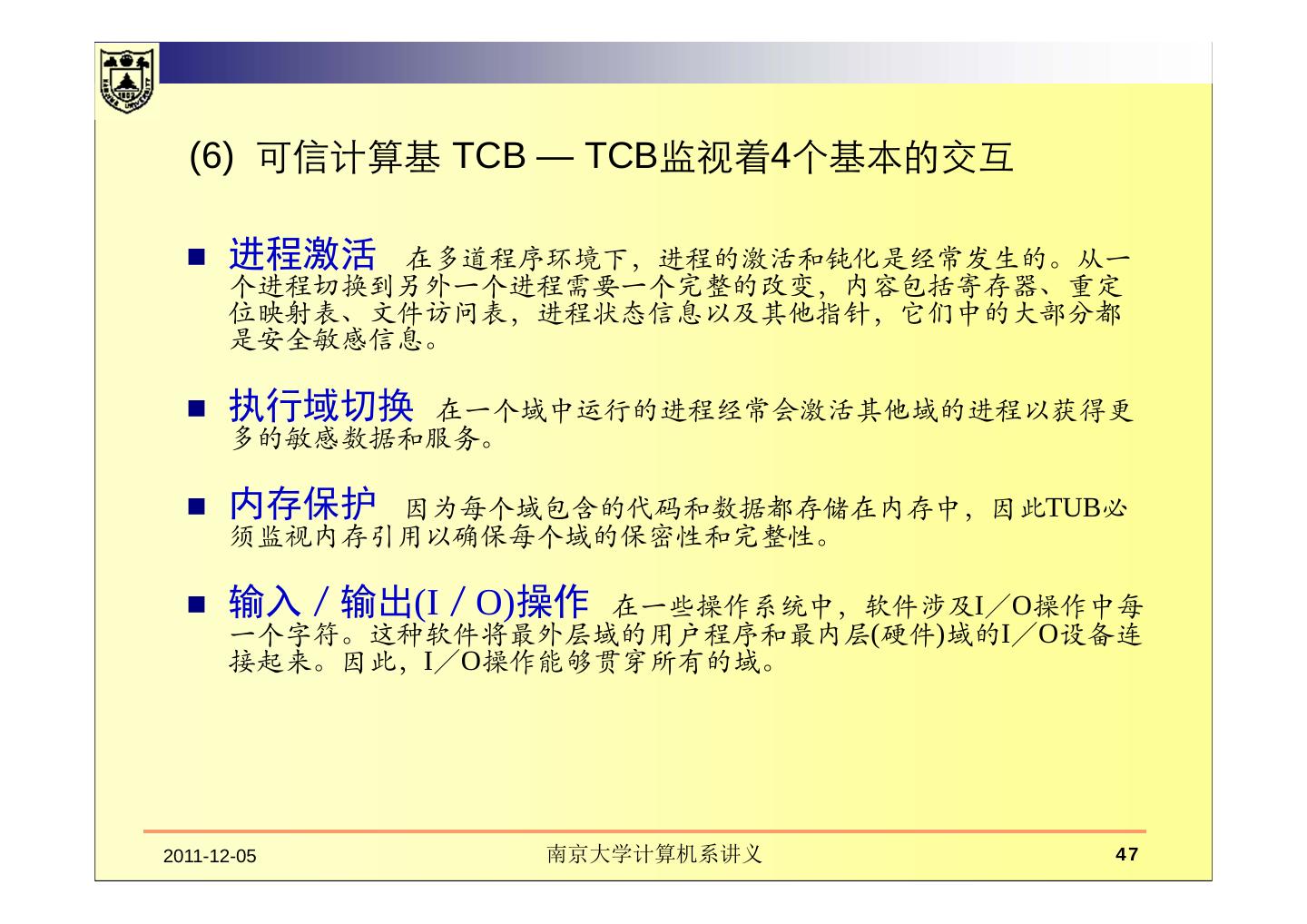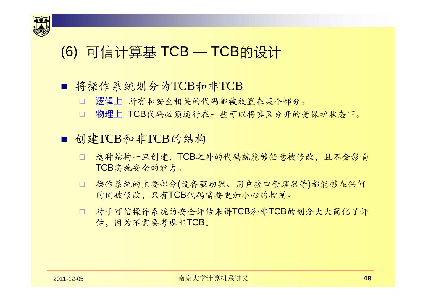 9 . 7.1 可信操作系统研究的发展 安全评价标准 1983年,美国国防部颁布了历史上第一个计算机安全评价标准,这 就是著名的可信计算机系统评价标准,简称TCSEC,又称橙皮书。 1985年,美国国防部对TCSEC进行了修订。 TCSEC标准是在基于安全核技术的安全操作系统研究的基础上制定 出来的,标准中使用的可信计算基(Trusted Computing Base,TCB) 就是安全核研究结果。 Nibadi G.H., Specification of a Trusted Computing Base, M79-228, The MITRE Corporation, Bedford, MA, USA。 给出了TCB的定义,该方法要求把计算机系统中所有与安全保护有 关的功能找出来,并把它们与系统中的其他功能分离开,然后把它 们独立出来,以防止遭到破坏,这样独立出来得到的结果就称为 TCB。 2011-12-05 南京大学计算机系讲义 9