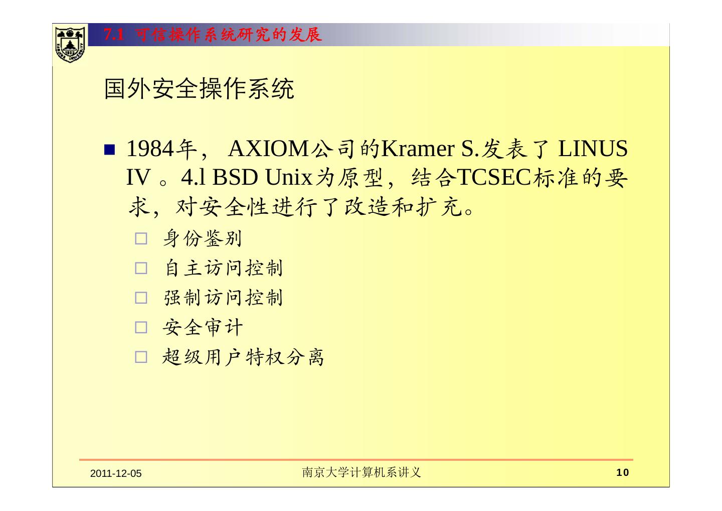 10 . 7.1 可信操作系统研究的发展 国外安全操作系统 1984年, AXIOM公司的Kramer S.发表了 LINUS IV 。4.l BSD Unix为原型,结合TCSEC标准的要 求,对安全性进行了改造和扩充。 身份鉴别 自主访问控制 强制访问控制 安全审计 超级用户特权分离 2011-12-05 南京大学计算机系讲义 10