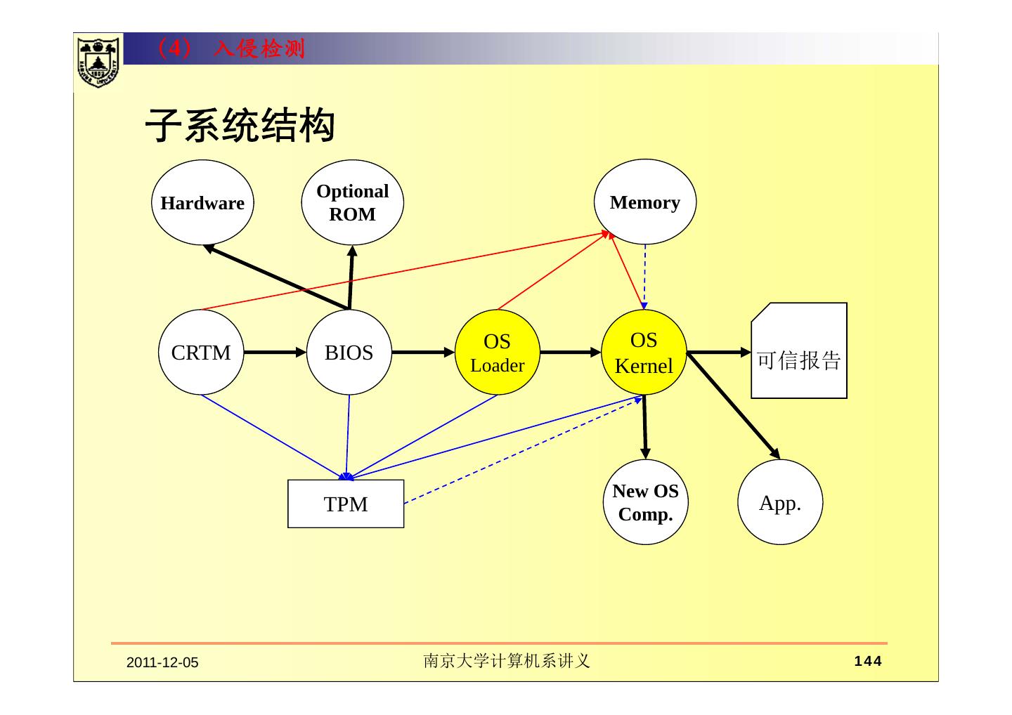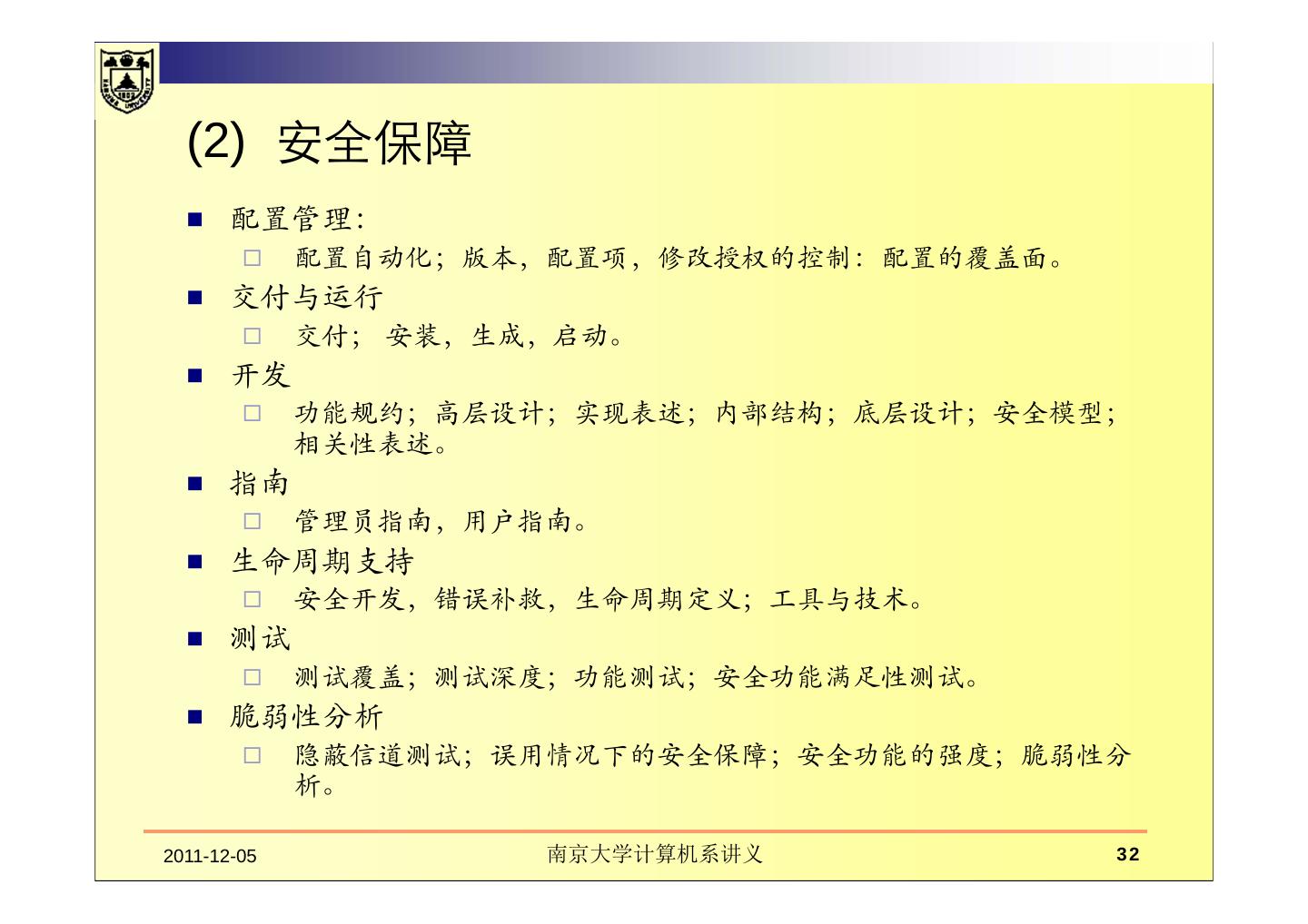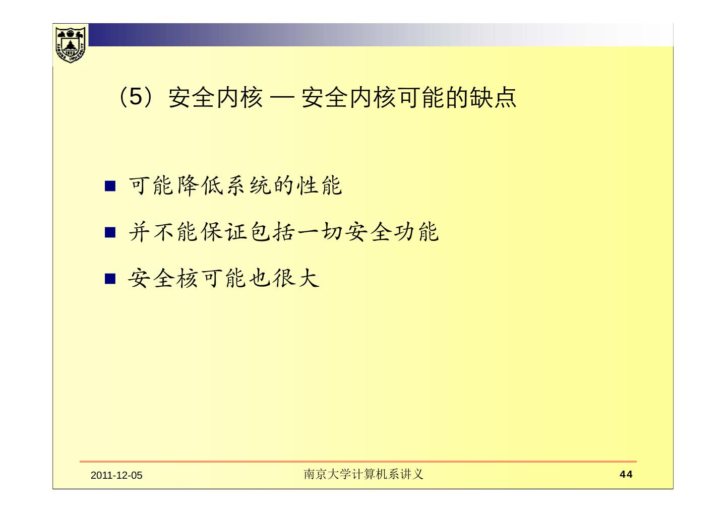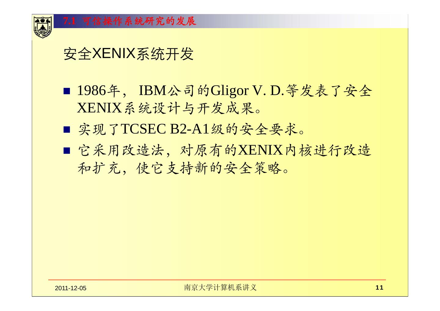 11 . 7.1 可信操作系统研究的发展 安全XENIX系统开发 1986年, IBM公司的Gligor V. D.等发表了安全 XENIX系统设计与开发成果。 实现了TCSEC B2-A1级的安全要求。 它采用改造法,对原有的XENIX内核进行改造 和扩充,使它支持新的安全策略。 2011-12-05 南京大学计算机系讲义 11