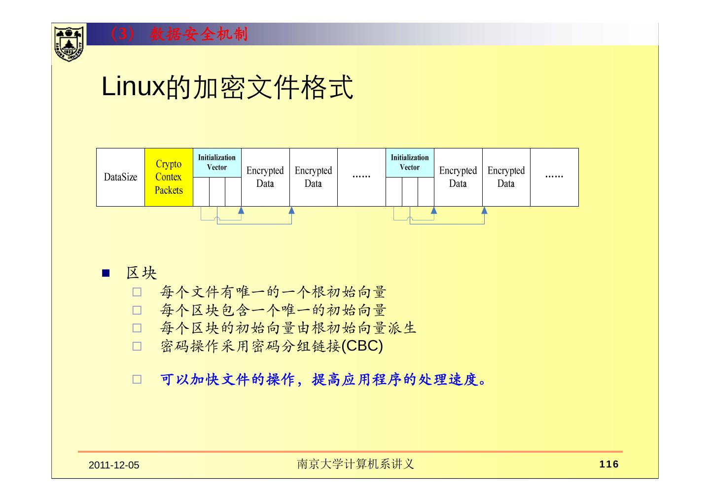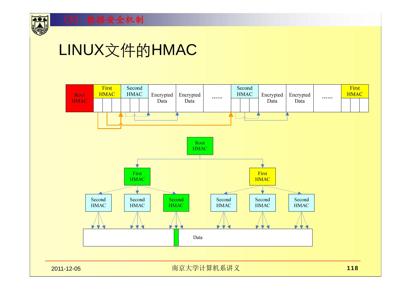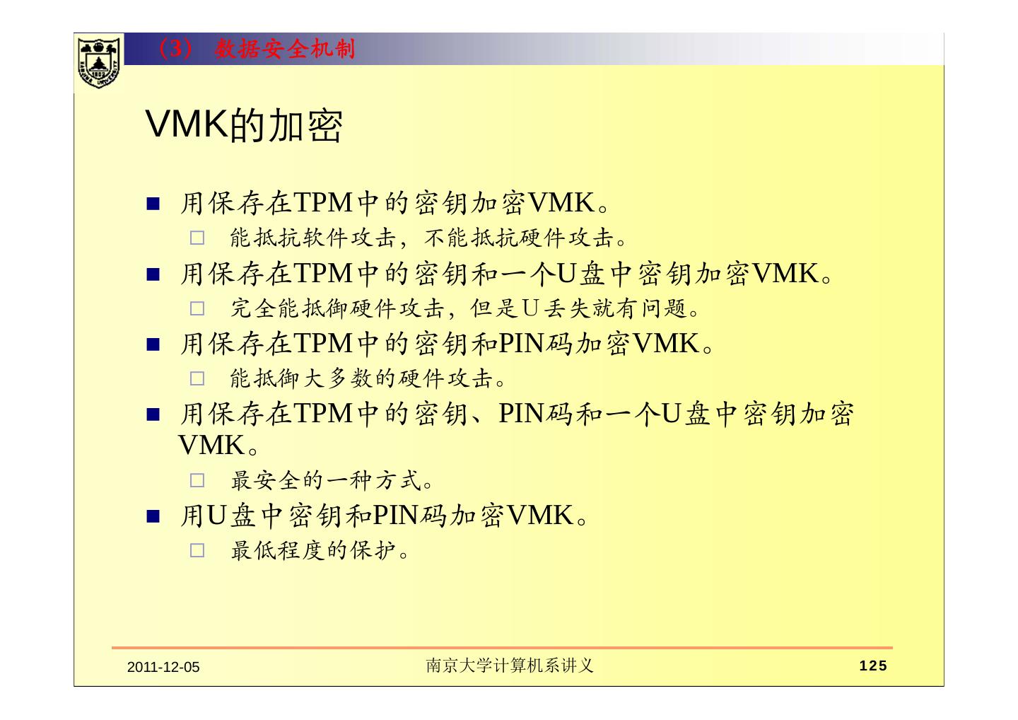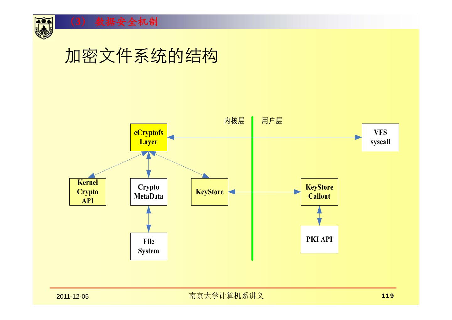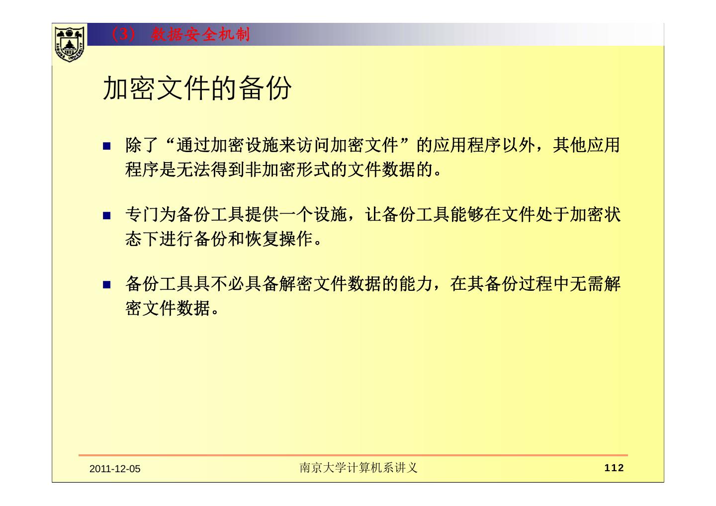 11 . 7.1 可信操作系统研究的发展 安全XENIX系统开发 1986年, IBM公司的Gligor V. D.等发表了安全 XENIX系统设计与开发成果。 实现了TCSEC B2-A1级的安全要求。 它采用改造法,对原有的XENIX内核进行改造 和扩充,使它支持新的安全策略。 2011-12-05 南京大学计算机系讲义 11