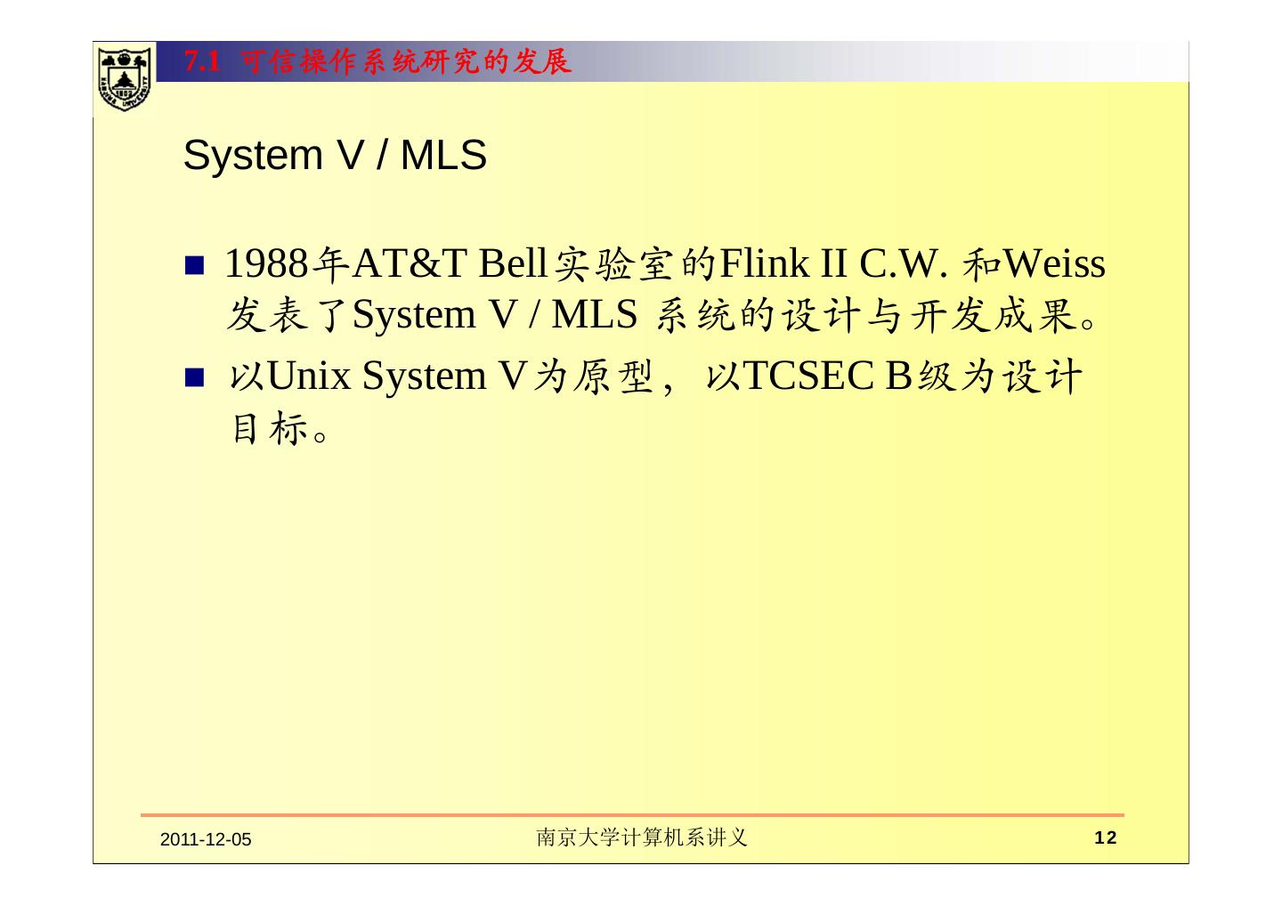 12 . 7.1 可信操作系统研究的发展 System V / MLS 1988年AT&T Bell实验室的Flink II C.W. 和Weiss 发表了System V / MLS 系统的设计与开发成果。 以Unix System V为原型,以TCSEC B级为设计 目标。 2011-12-05 南京大学计算机系讲义 12