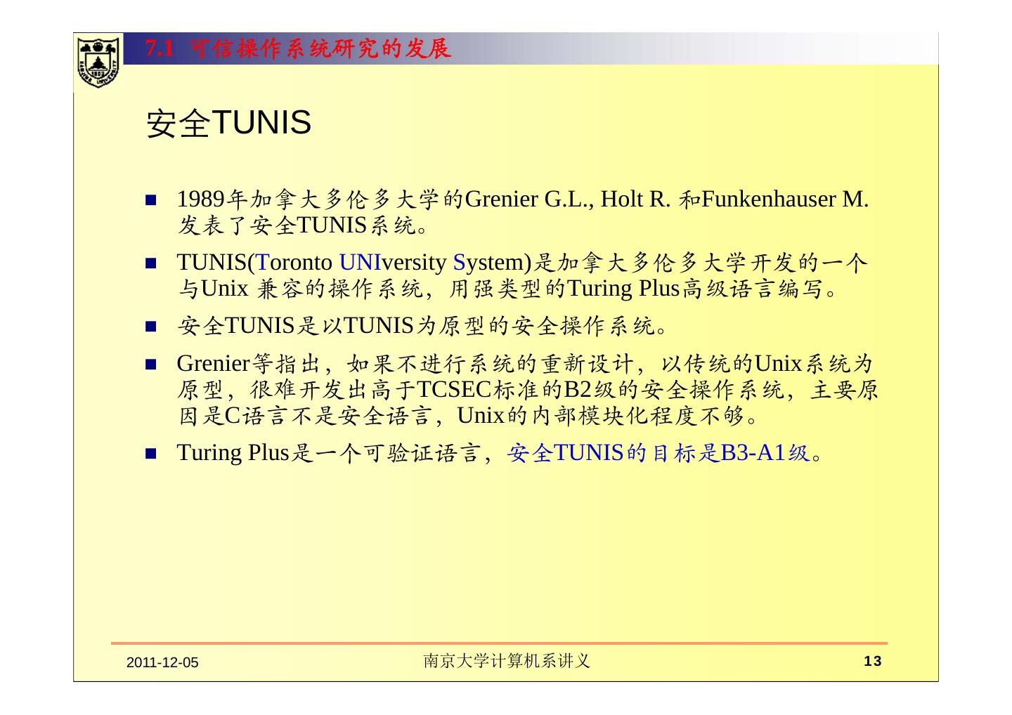 13 . 7.1 可信操作系统研究的发展 安全TUNIS 1989年加拿大多伦多大学的Grenier G.L., Holt R. 和Funkenhauser M. 发表了安全TUNIS系统。 TUNIS(Toronto UNIversity System)是加拿大多伦多大学开发的一个 与Unix 兼容的操作系统,用强类型的Turing Plus高级语言编写。 安全TUNIS是以TUNIS为原型的安全操作系统。 Grenier等指出,如果不进行系统的重新设计,以传统的Unix系统为 原型,很难开发出高于TCSEC标准的B2级的安全操作系统,主要原 因是C语言不是安全语言,Unix的内部模块化程度不够。 Turing Plus是一个可验证语言,安全TUNIS的目标是B3-A1级。 2011-12-05 南京大学计算机系讲义 13