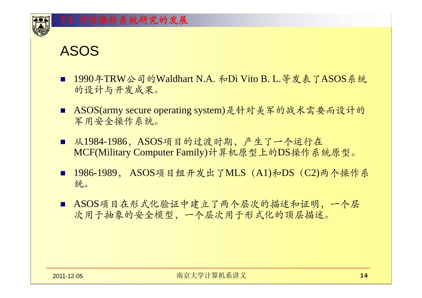 14 . 7.1 可信操作系统研究的发展 ASOS 1990年TRW公司的Waldhart N.A. 和Di Vito B. L.等发表了ASOS系统 的设计与开发成果。 ASOS(army secure operating system)是针对美军的战术需要而设计的 军用安全操作系统。 从1984-1986,ASOS项目的过渡时期,产生了一个运行在 MCF(Military Computer Family)计算机原型上的DS操作系统原型。 1986-1989, ASOS项目组开发出了MLS(A1)和DS(C2)两个操作系 统。 ASOS项目在形式化验证中建立了两个层次的描述和证明,一个层 次用于抽象的安全模型,一个层次用于形式化的顶层描述。 2011-12-05 南京大学计算机系讲义 14