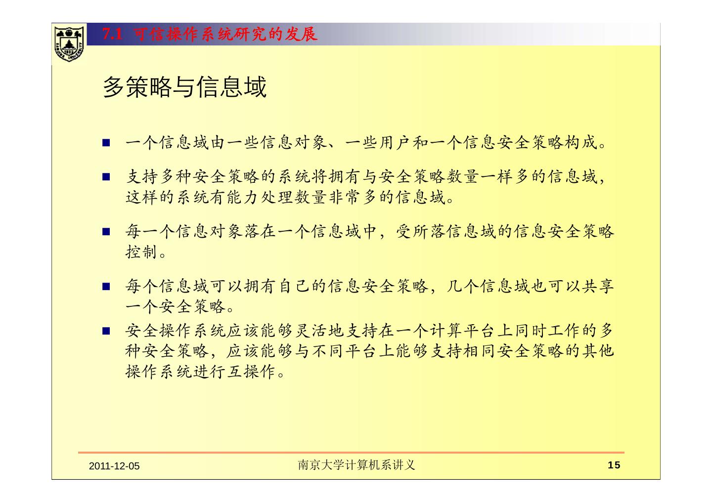 15 . 7.1 可信操作系统研究的发展 多策略与信息域 一个信息域由一些信息对象、一些用户和一个信息安全策略构成。 支持多种安全策略的系统将拥有与安全策略数量一样多的信息域, 这样的系统有能力处理数量非常多的信息域。 每一个信息对象落在一个信息域中,受所落信息域的信息安全策略 控制。 每个信息域可以拥有自己的信息安全策略,几个信息域也可以共享 一个安全策略。 安全操作系统应该能够灵活地支持在一个计算平台上同时工作的多 种安全策略,应该能够与不同平台上能够支持相同安全策略的其他 操作系统进行互操作。 2011-12-05 南京大学计算机系讲义 15