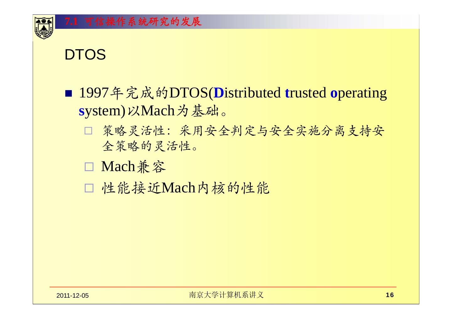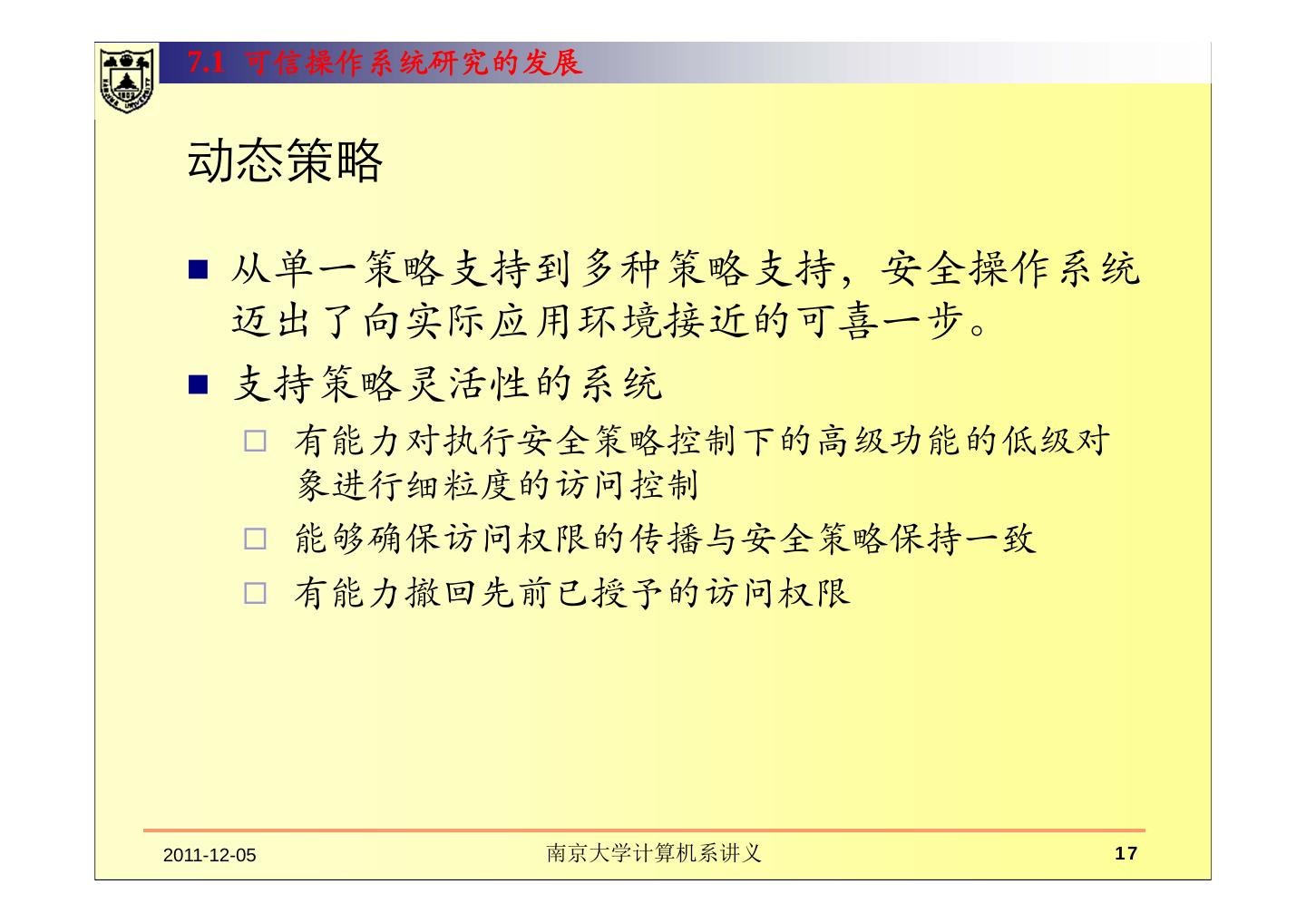 16 . 7.1 可信操作系统研究的发展 DTOS 1997年完成的DTOS(Distributed trusted operating system)以Mach为基础。 策略灵活性:采用安全判定与安全实施分离支持安 全策略的灵活性。 Mach兼容 性能接近Mach内核的性能 2011-12-05 南京大学计算机系讲义 16