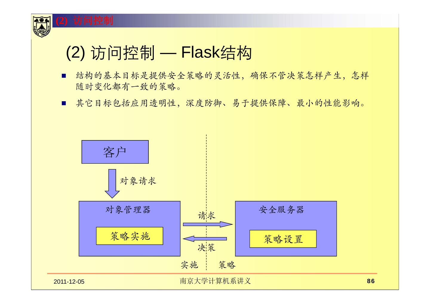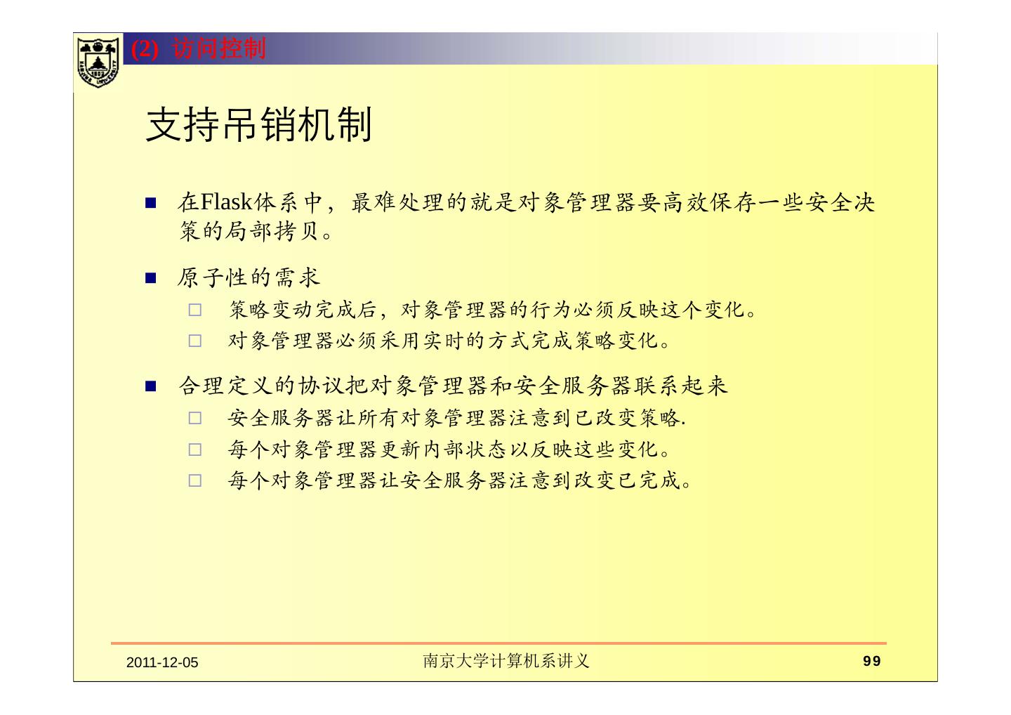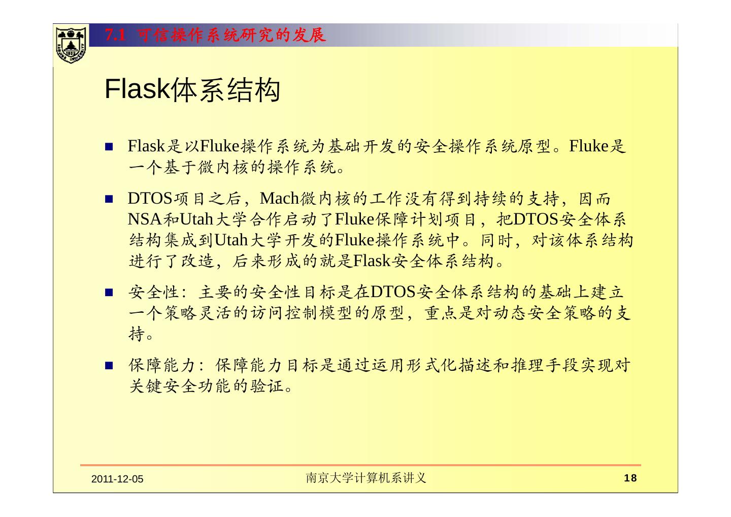 17 . 7.1 可信操作系统研究的发展 动态策略 从单一策略支持到多种策略支持,安全操作系统 迈出了向实际应用环境接近的可喜一步。 支持策略灵活性的系统 有能力对执行安全策略控制下的高级功能的低级对 象进行细粒度的访问控制 能够确保访问权限的传播与安全策略保持一致 有能力撤回先前已授予的访问权限 2011-12-05 南京大学计算机系讲义 17