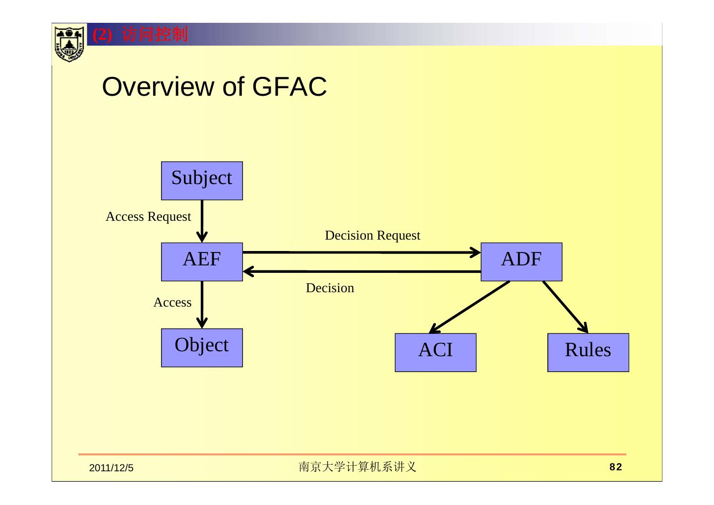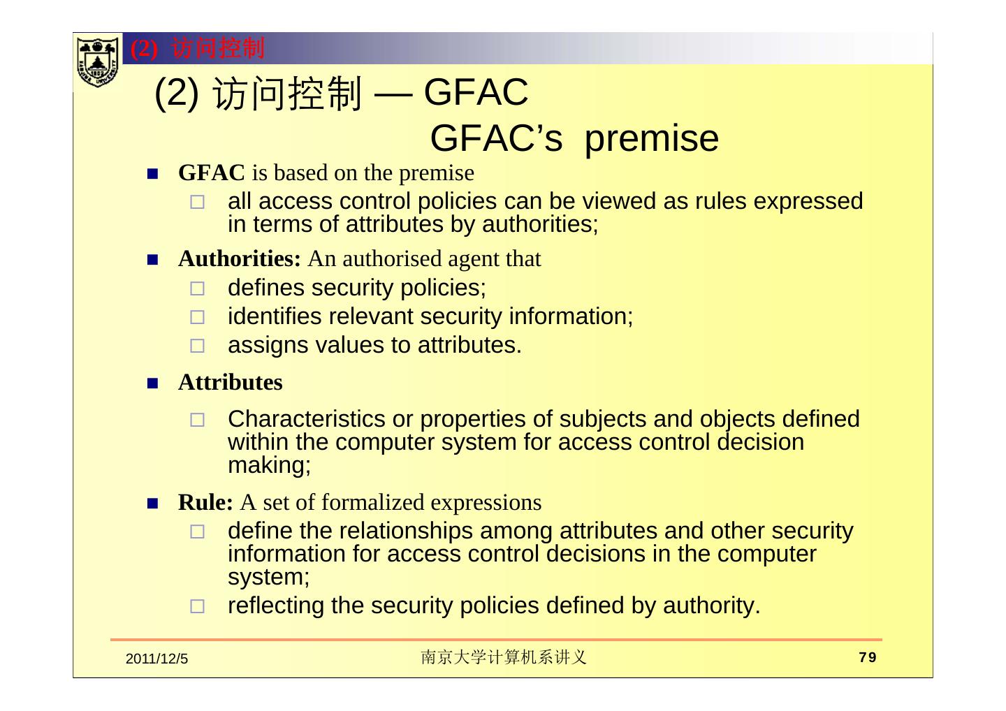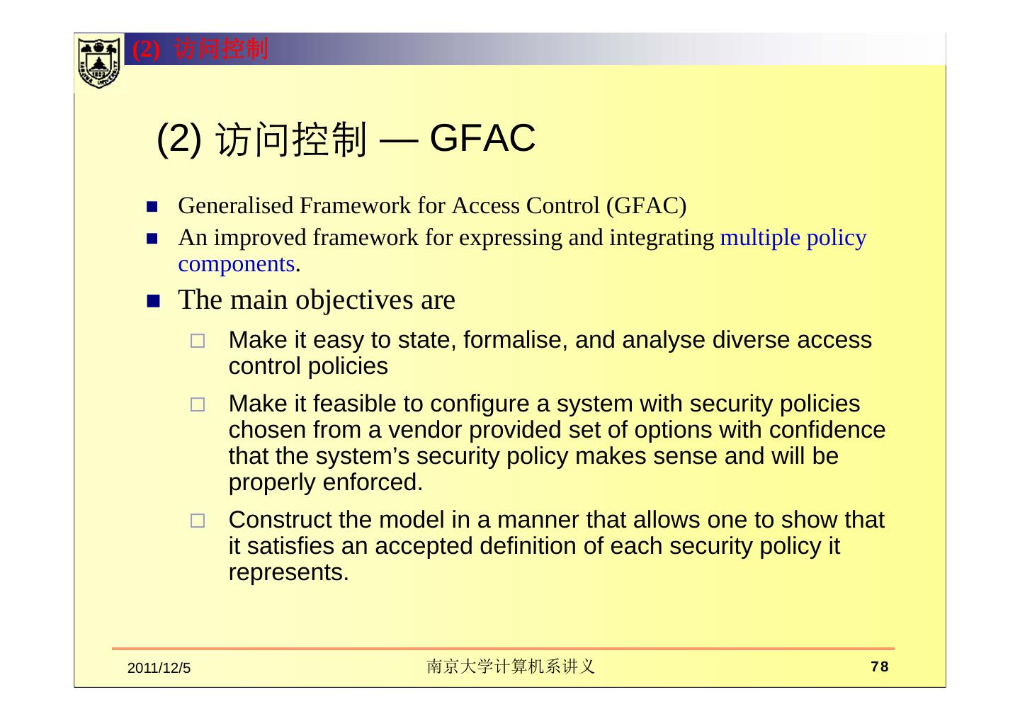 17 . 7.1 可信操作系统研究的发展 动态策略 从单一策略支持到多种策略支持,安全操作系统 迈出了向实际应用环境接近的可喜一步。 支持策略灵活性的系统 有能力对执行安全策略控制下的高级功能的低级对 象进行细粒度的访问控制 能够确保访问权限的传播与安全策略保持一致 有能力撤回先前已授予的访问权限 2011-12-05 南京大学计算机系讲义 17